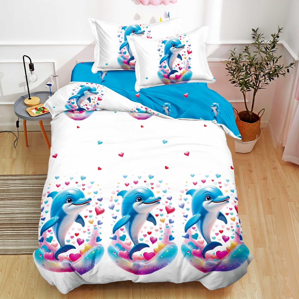 Lenjerie pat 1 PERSOANA, FINET, 4 piese, Alb, Bleu, delfini