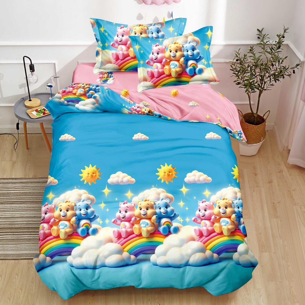 Lenjerie pat 1 PERSOANA, FINET, 4 piese, Bleu, Roz, ursuleti, curcubeu