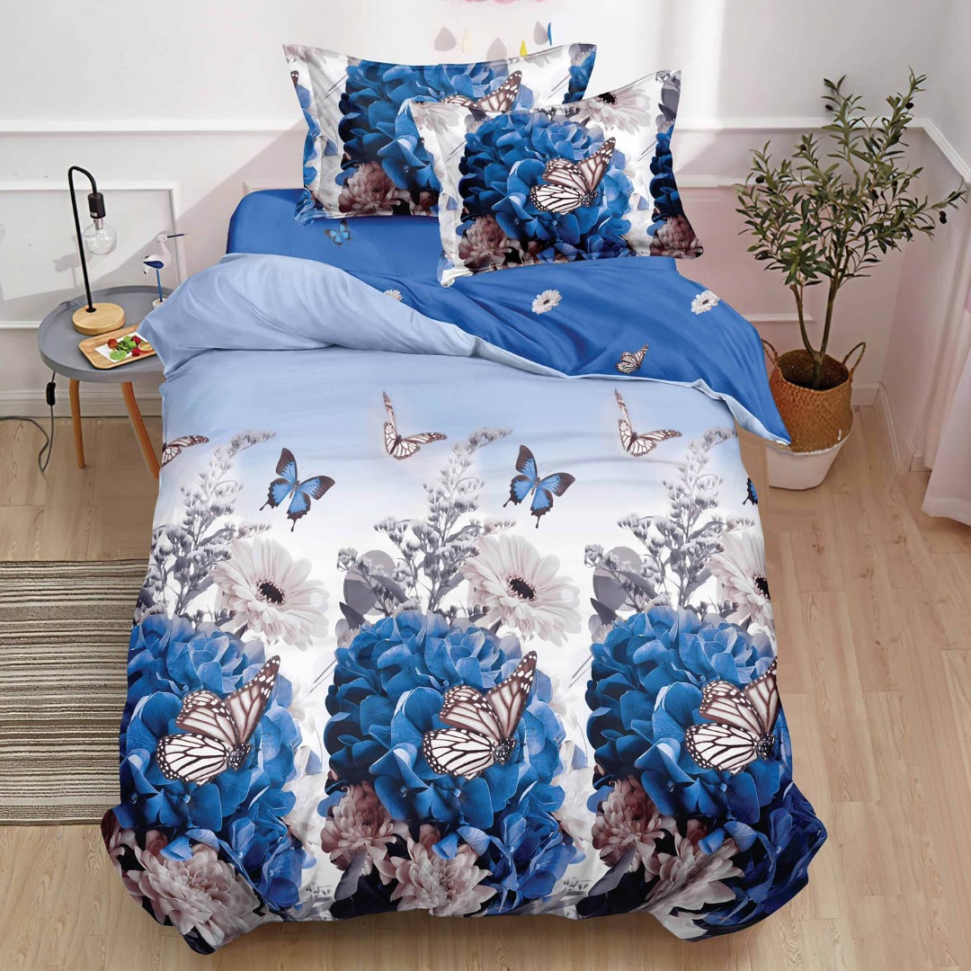 (OFERTA TRIO) Lenjerie pat 1 PERSOANA, FINET, 4 piese, cu ELASTIC, Albastru, fluturi, flori