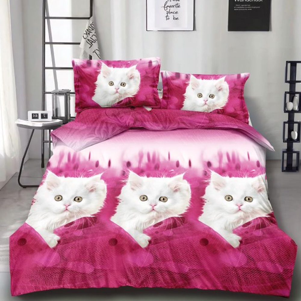 Lenjerie pat dublu (140x200cm, 160x200cm, 180x200cm), cearsaf clasic, imprimeu 3D, Roz, pisici