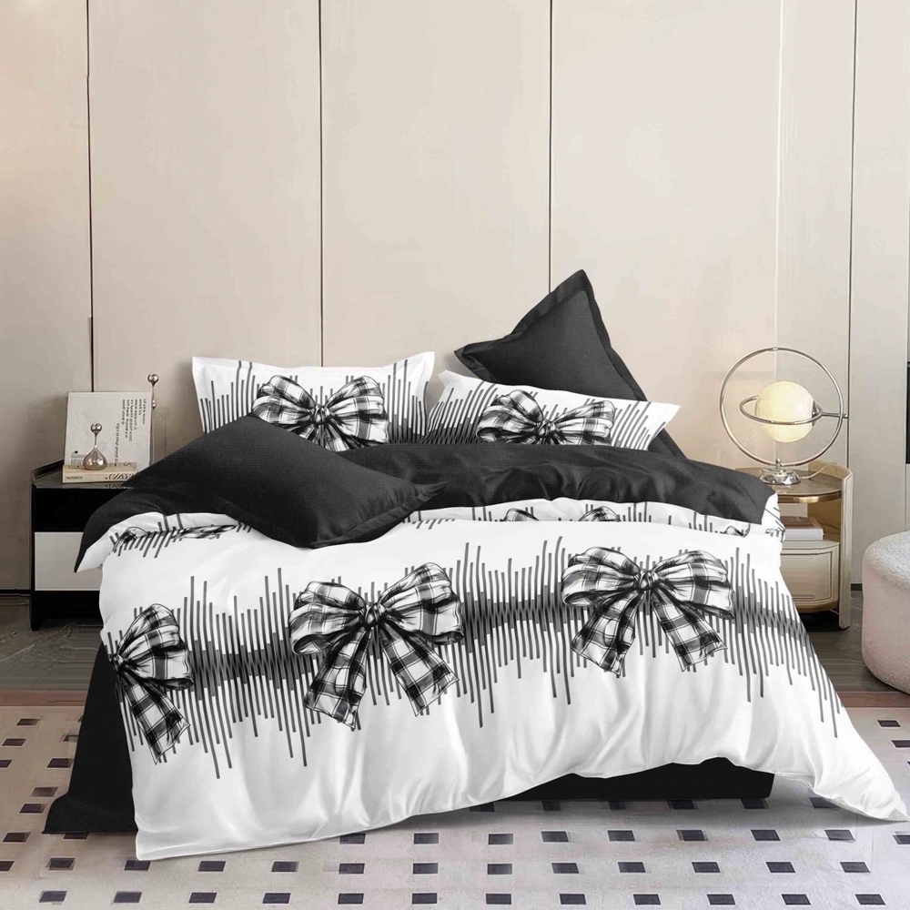 Lenjerie pat dublu (140x200cm, 160x200cm, 180x200cm), FINET, 6 piese, Alb, Negru, fundite