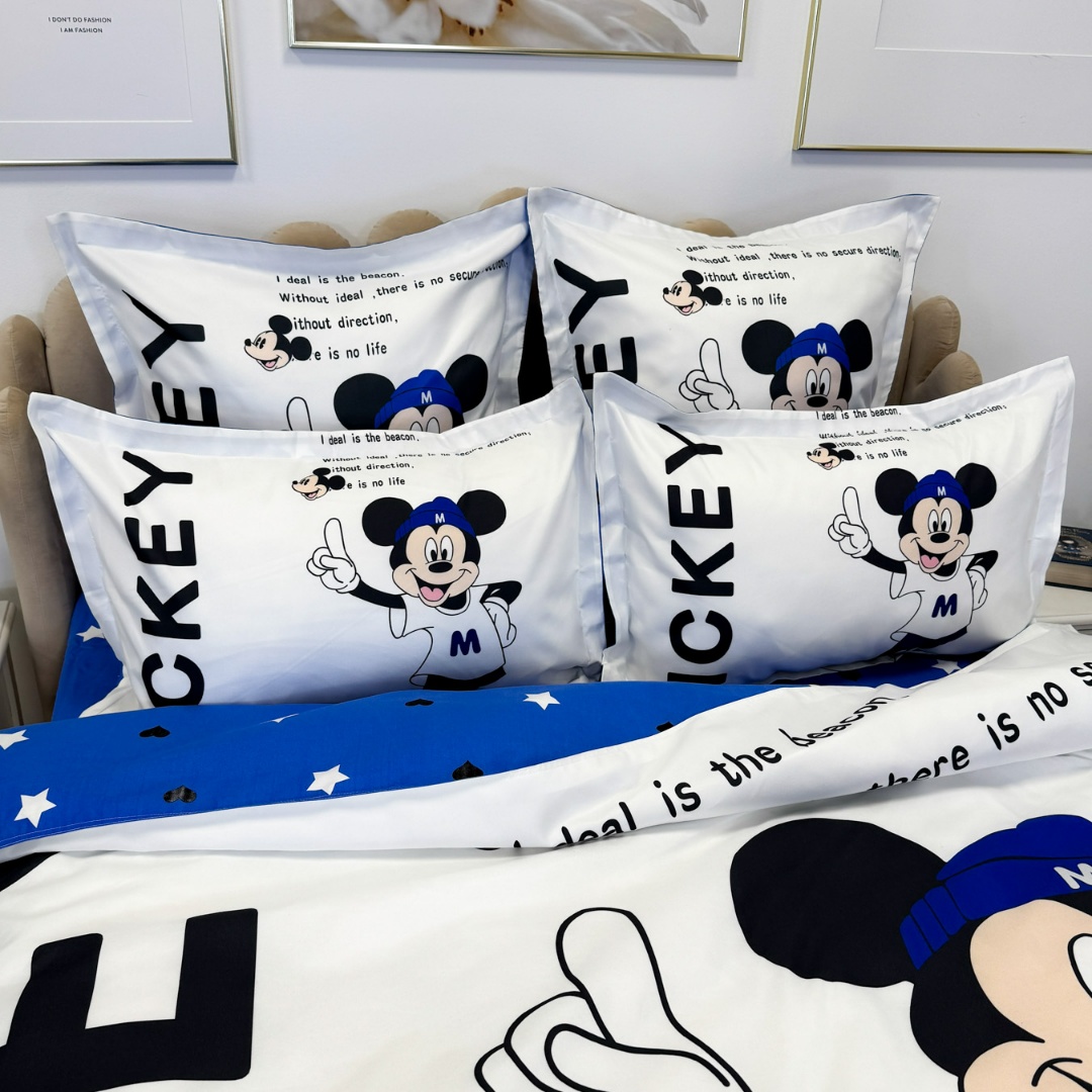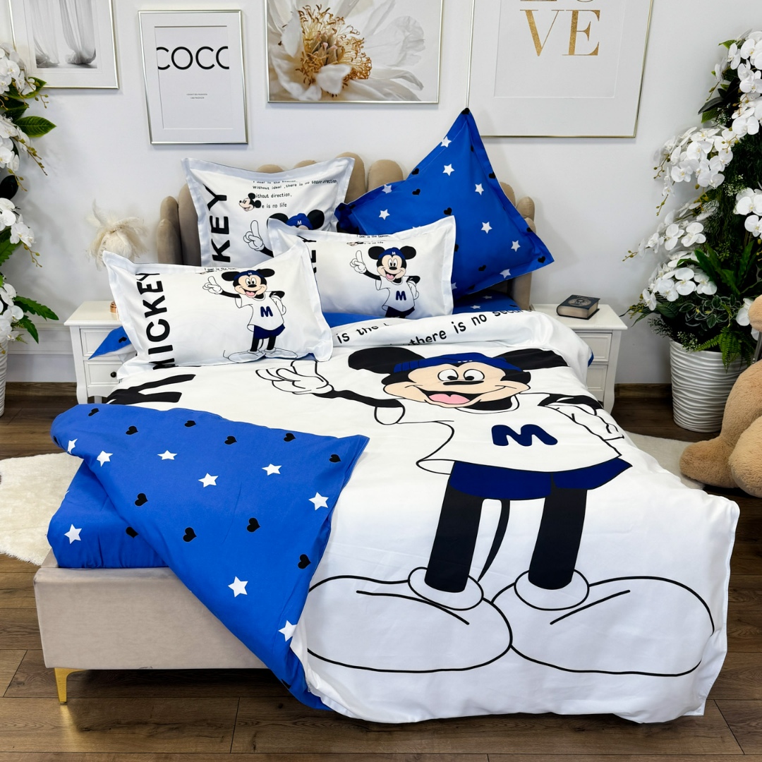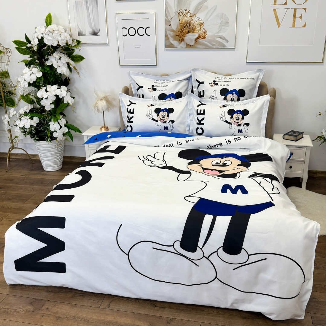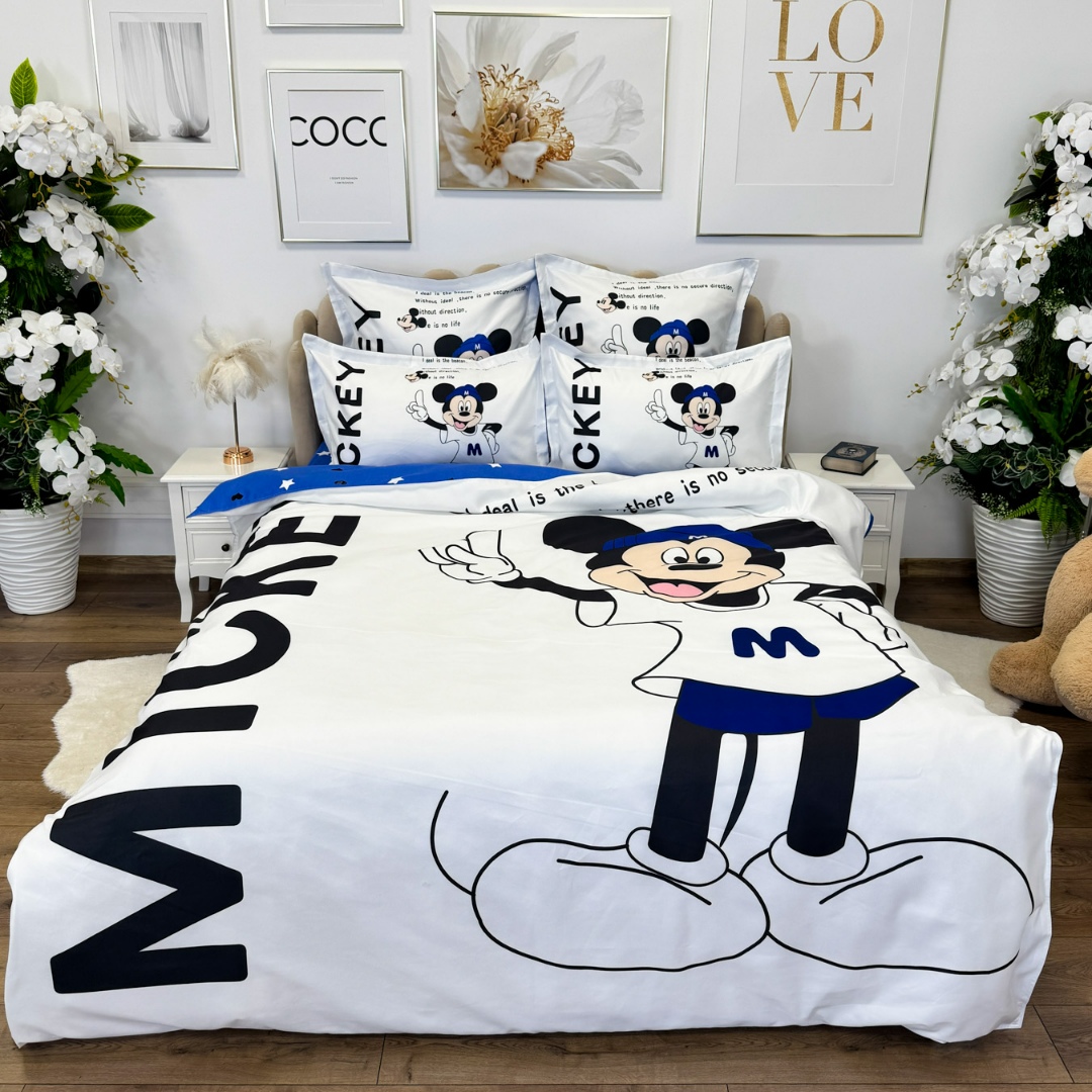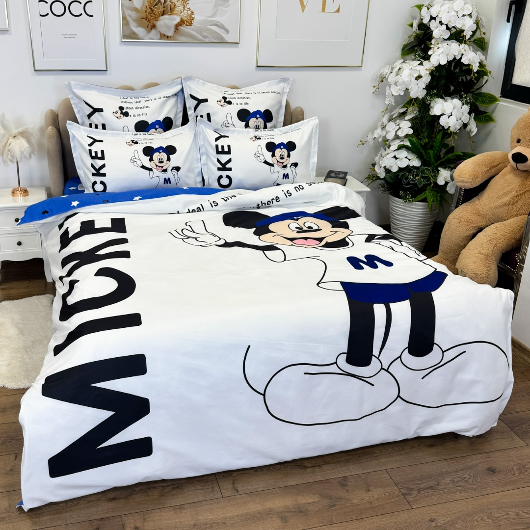Lenjerie pat dublu (140x200cm, 160x200cm, 180x200cm), FINET, 6 piese, IDENTICA CU POZA,, Alb, Bleu, Mickey Mouse