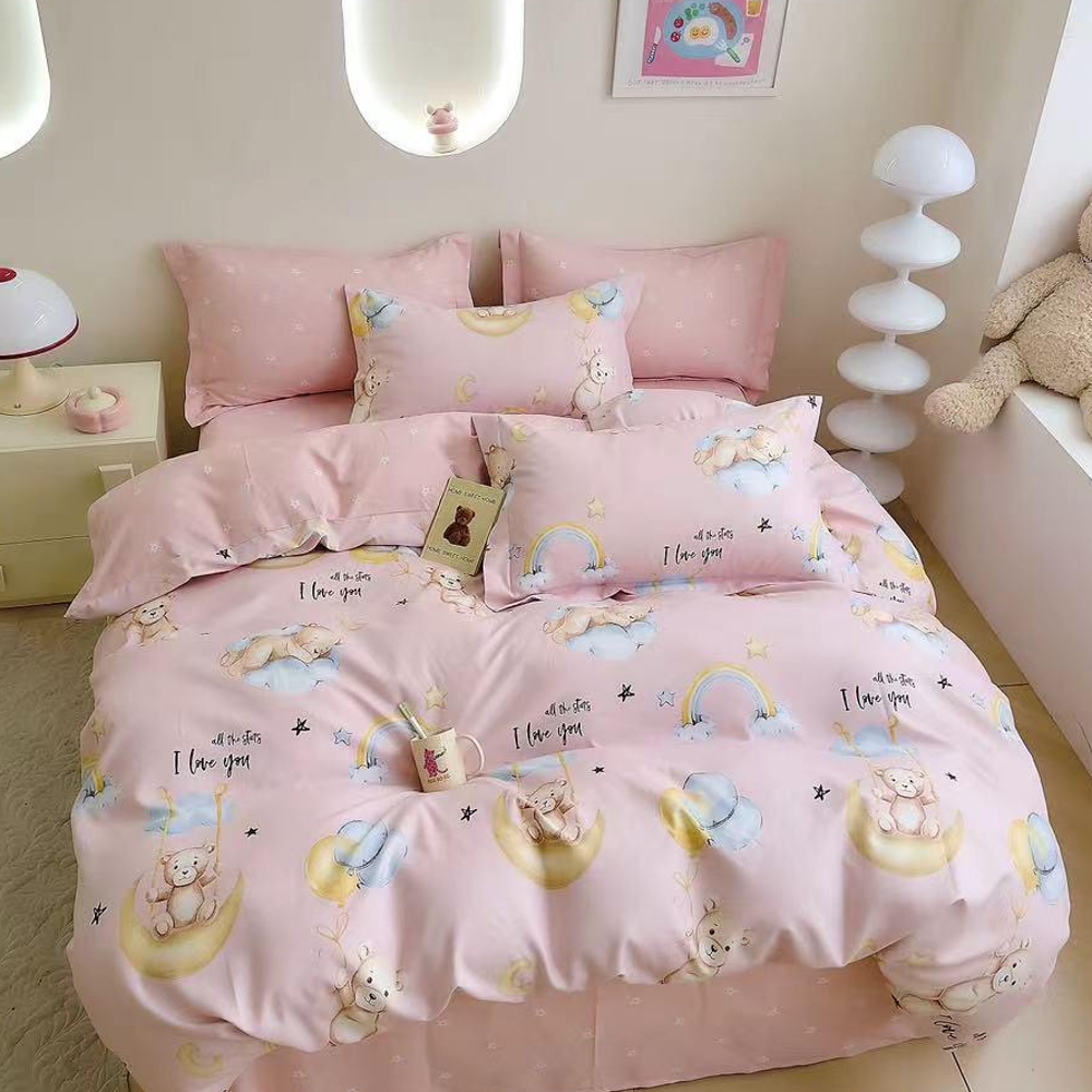 Lenjerie pat dublu cu ELASTIC, Finet, 6 piese, Roz, ursuleti