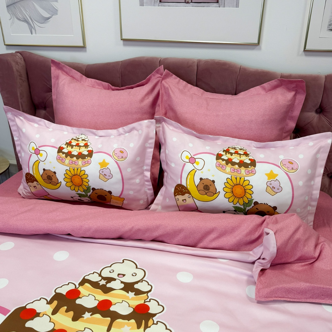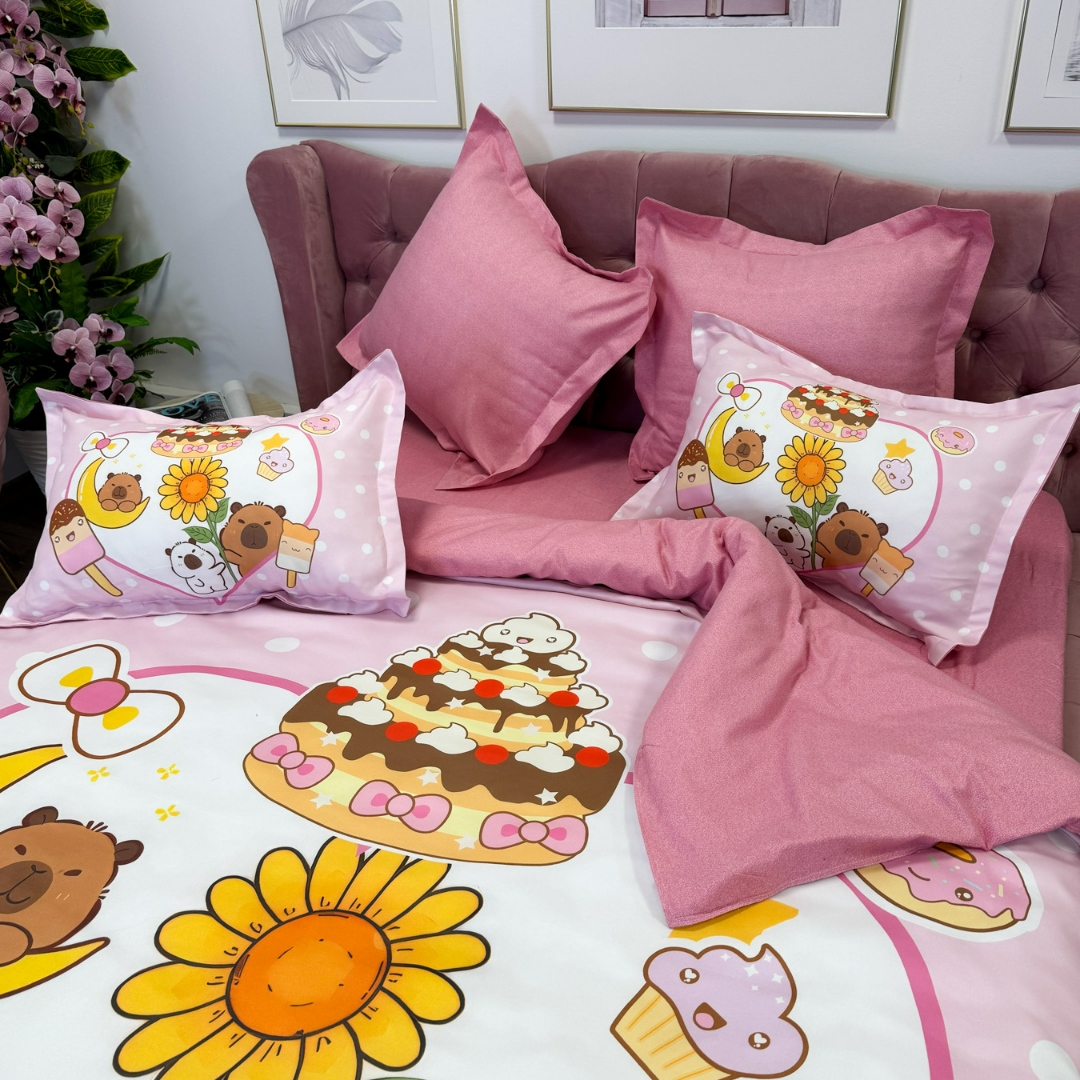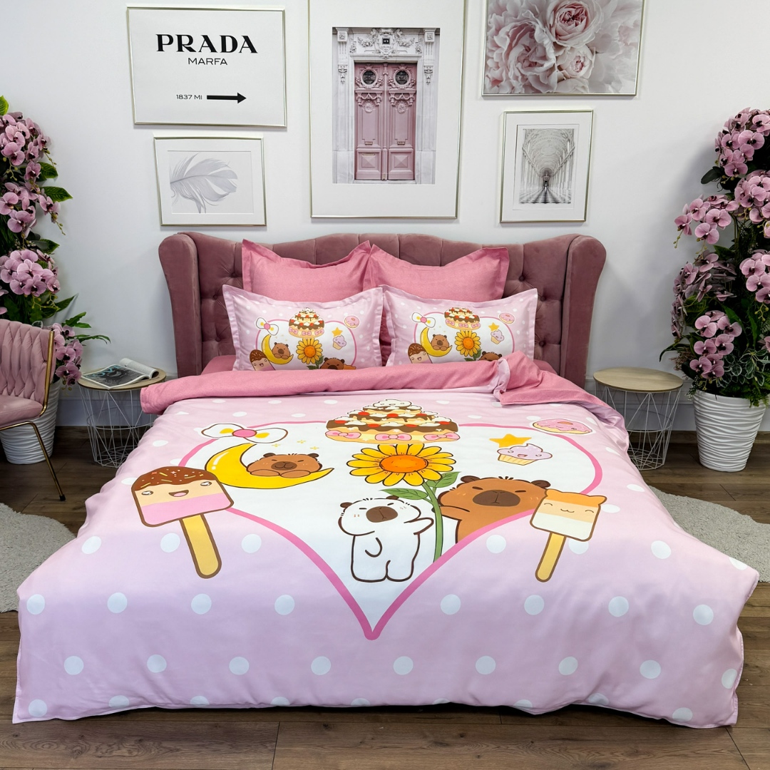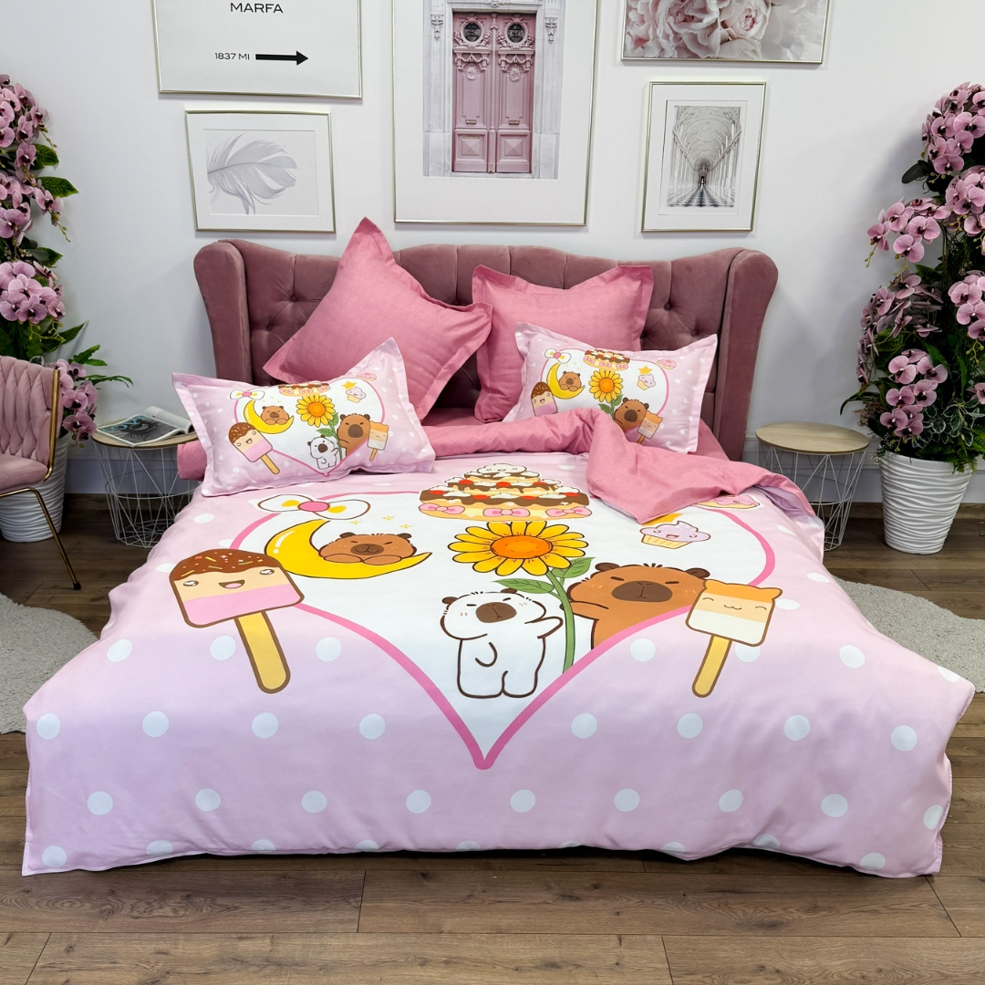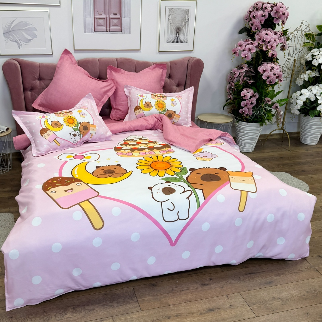Lenjerie pat dublu (160x200cm, 180x200cm), FINET, cu ELASTIC, 6 piese, IDENTICA CU POZA, Roz, Capibara, Inimioare, Flori, Buline