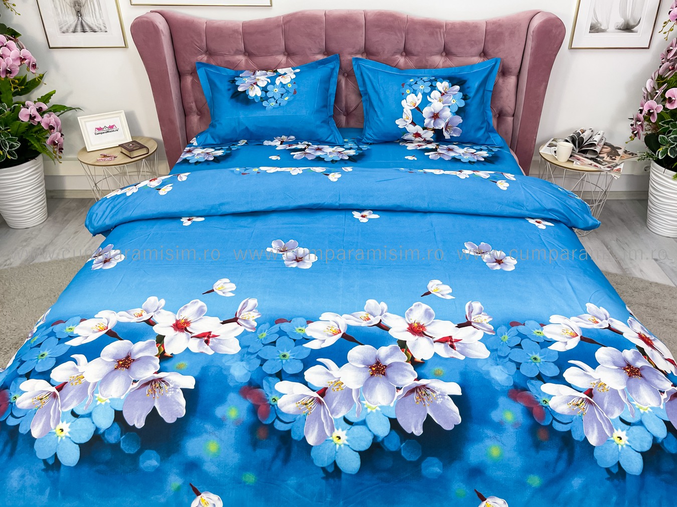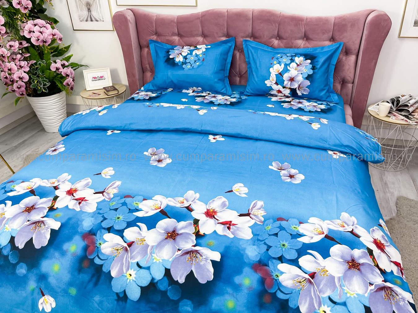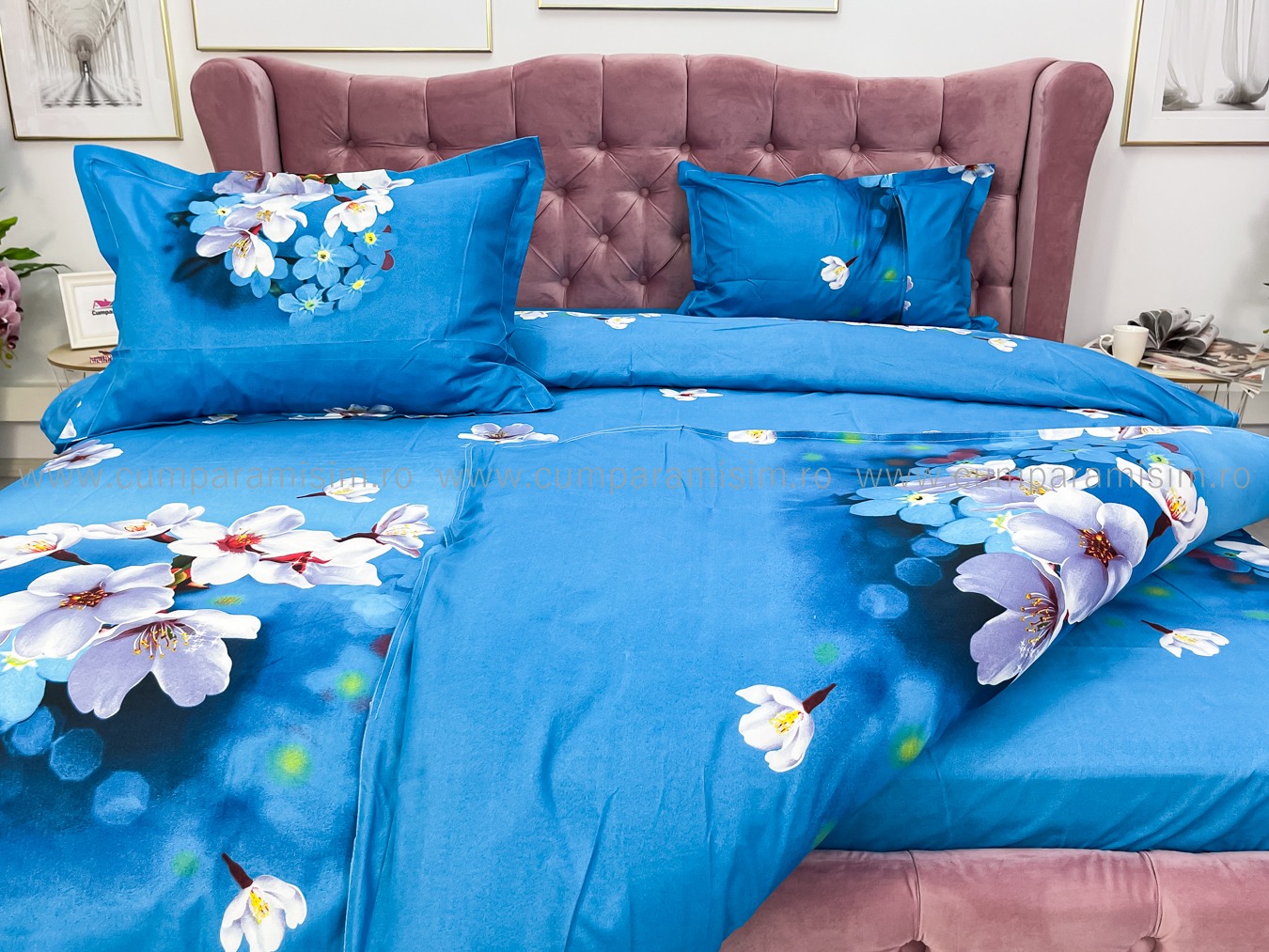 (OFERTA 3 la 199 Lei) Lenjerie pat dublu, 4 piese, IMPRIMEU 3D Multiplicat, Microfibra, Albastru, flori de cires