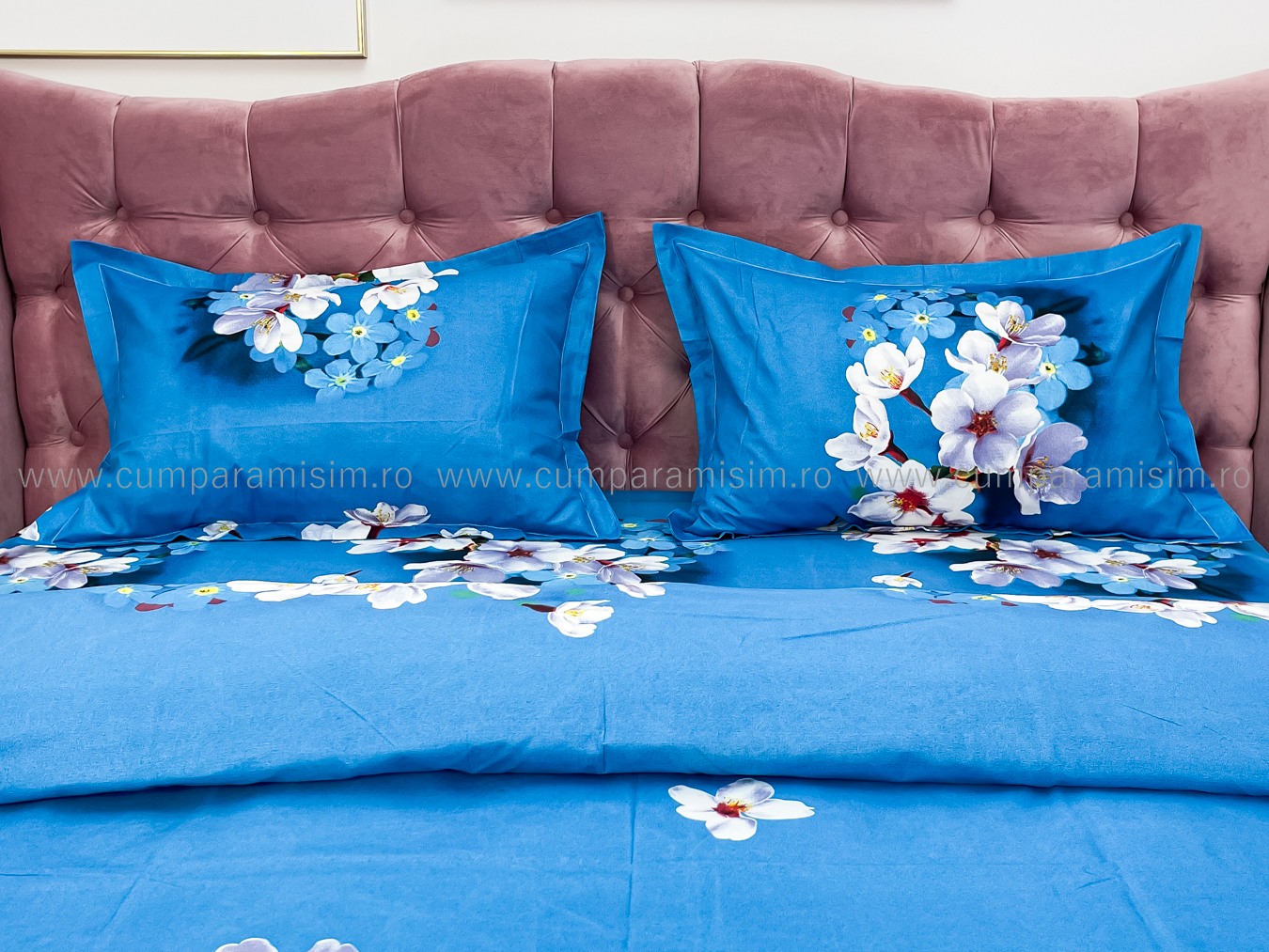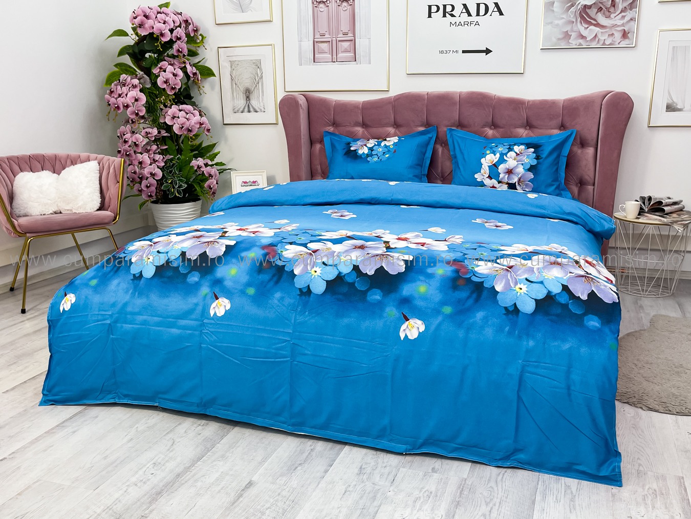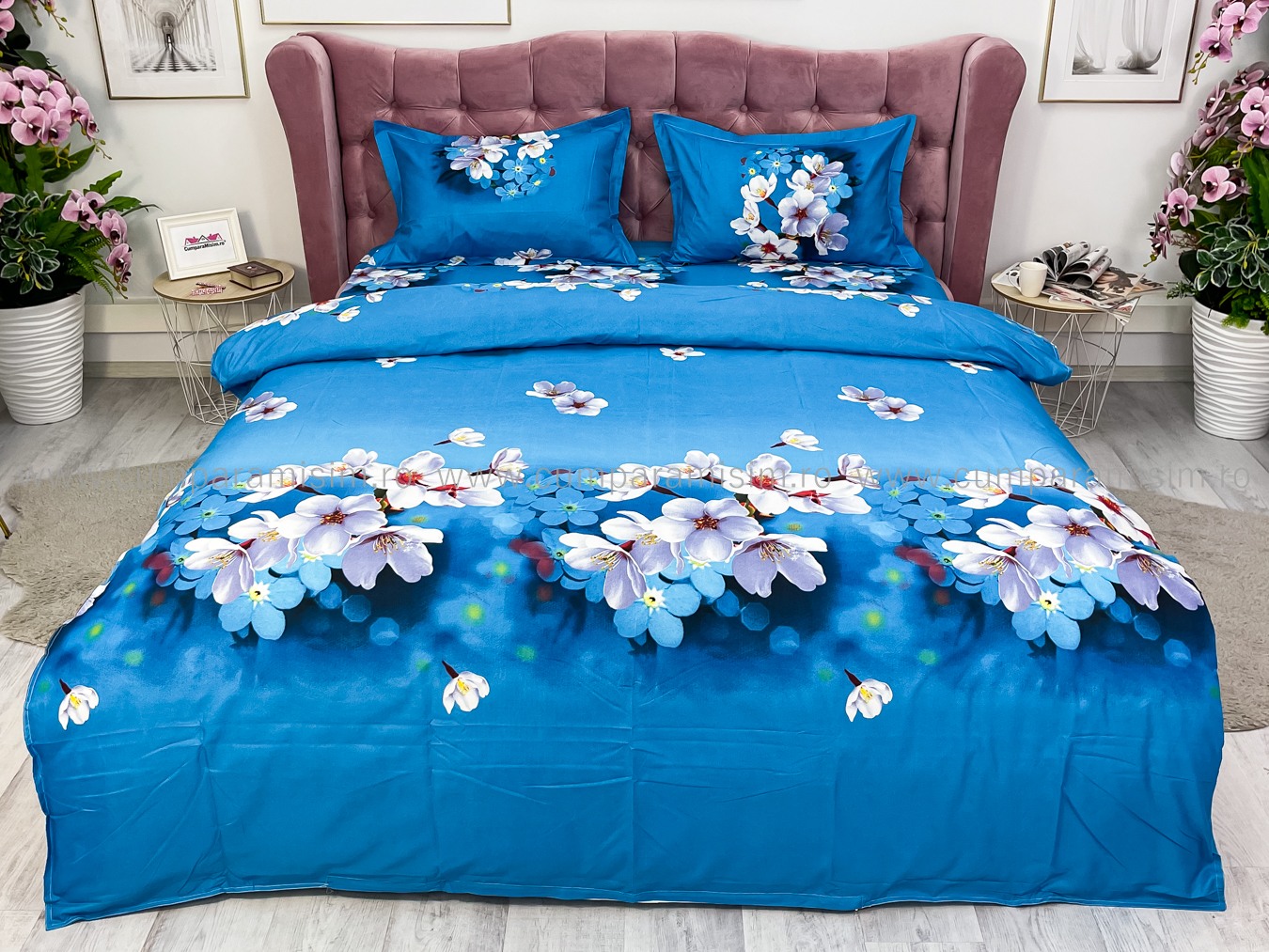 (OFERTA 3 la 199 Lei) Lenjerie pat dublu, 4 piese, IMPRIMEU 3D Multiplicat, Microfibra, Albastru, flori de cires