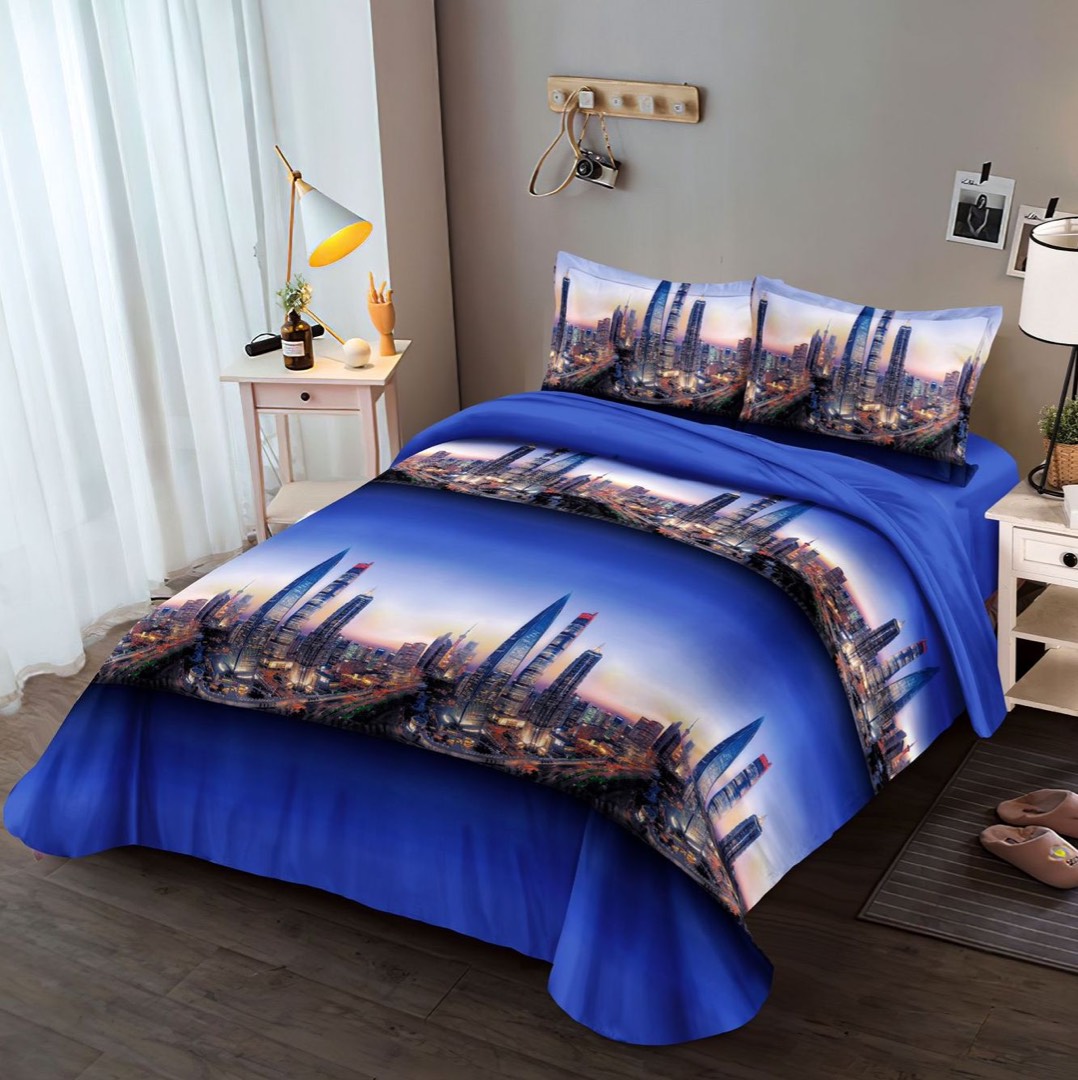 (OFERTA 3 la 199 Lei) Lenjerie pat dublu, 4 piese, IMPRIMEU 3D Multiplicat, Microfibra, Albastru, oras
