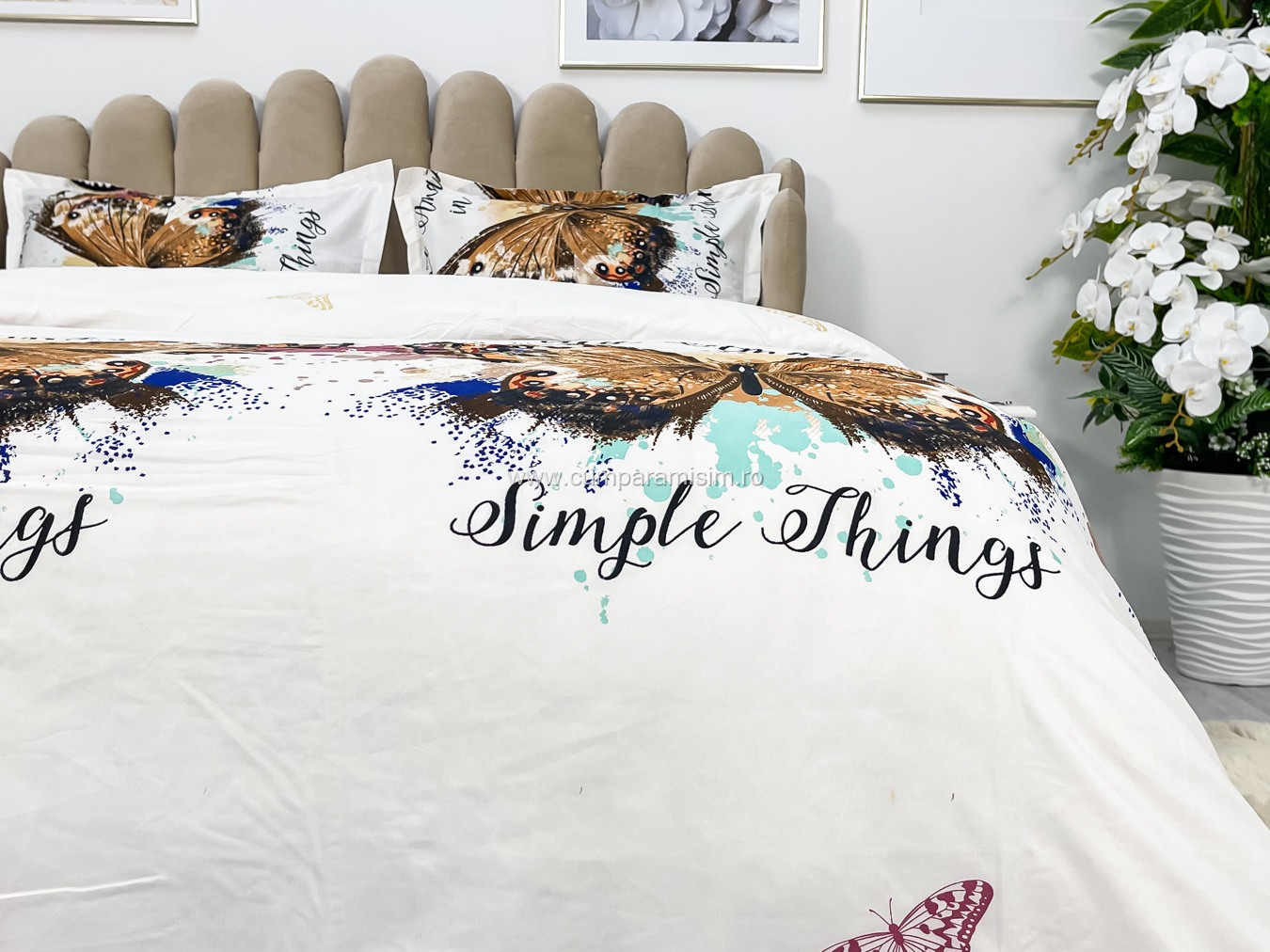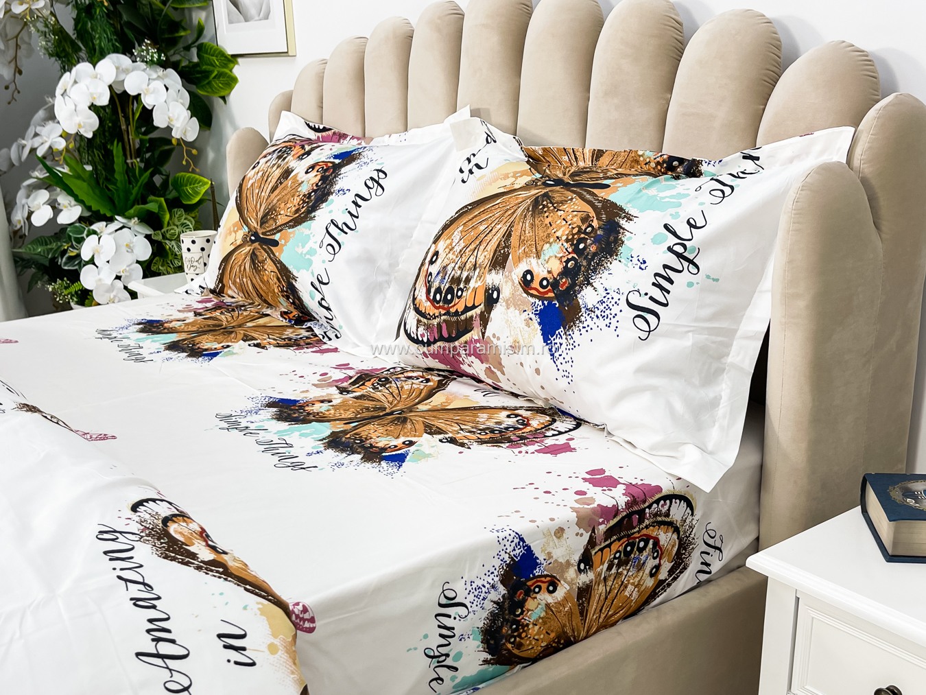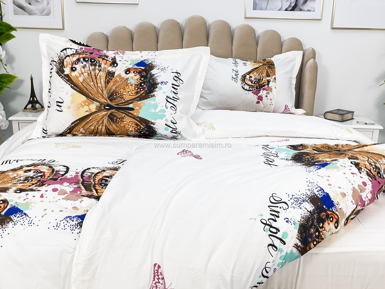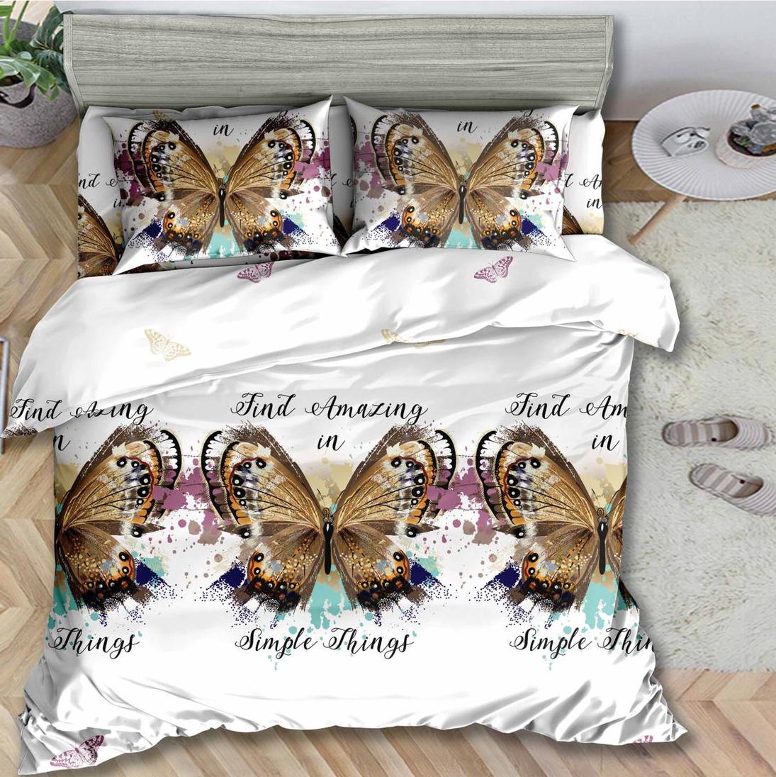 (OFERTA 3 la 199 Lei) Lenjerie pat dublu, 4 piese, IMPRIMEU 3D Multiplicat, Microfibra, Auriu, fluturi