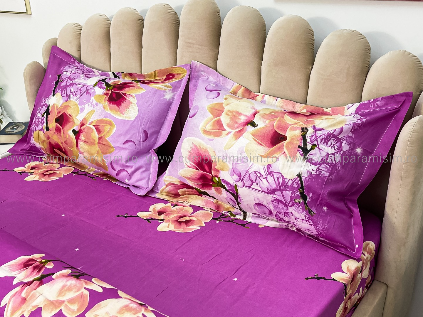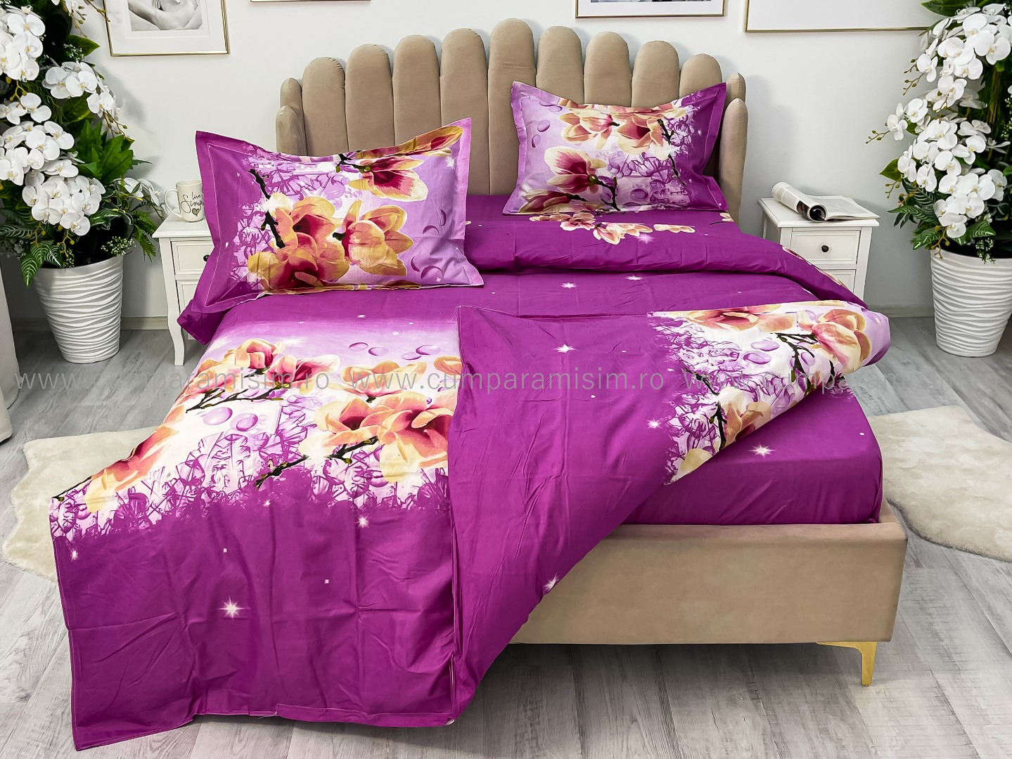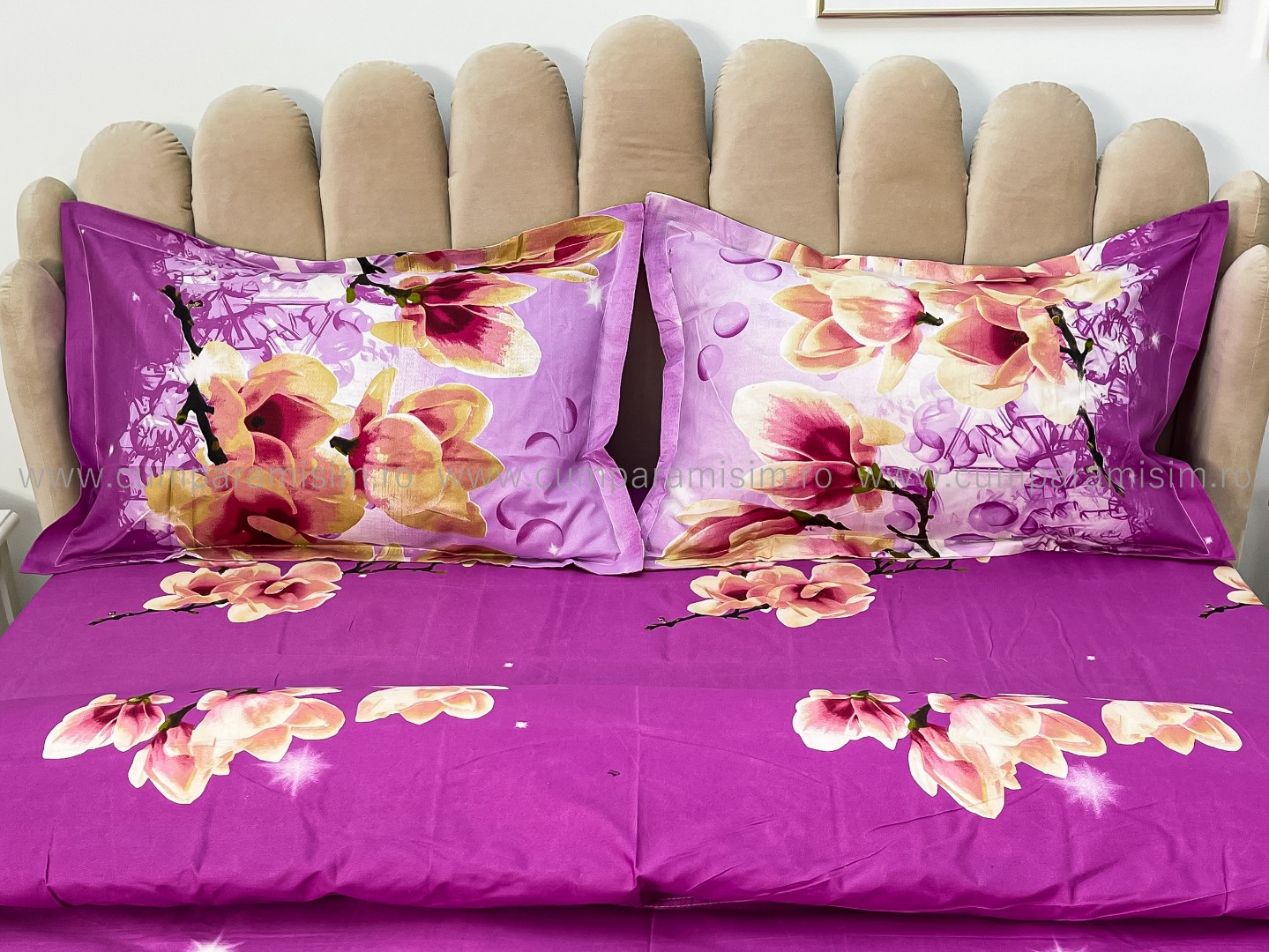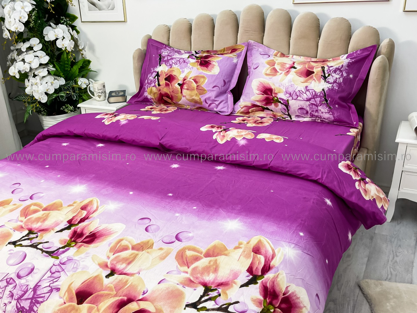 (OFERTA 3 la 199 Lei) Lenjerie pat dublu, 4 piese, IMPRIMEU 3D Multiplicat, Microfibra, Mov, magnolii