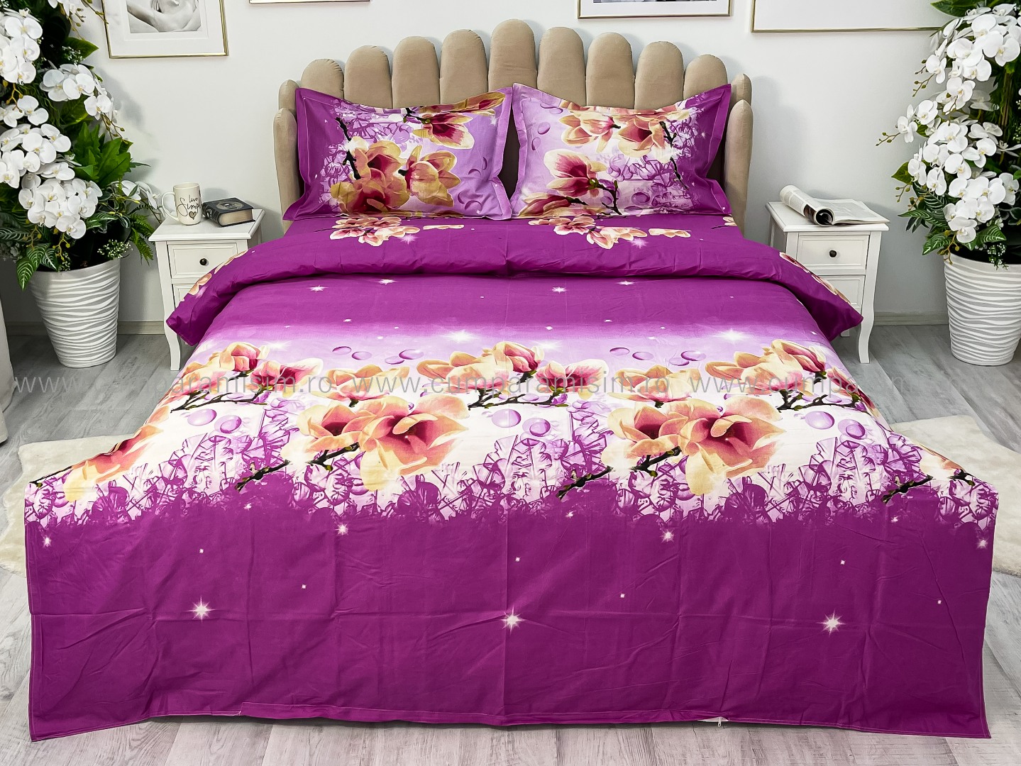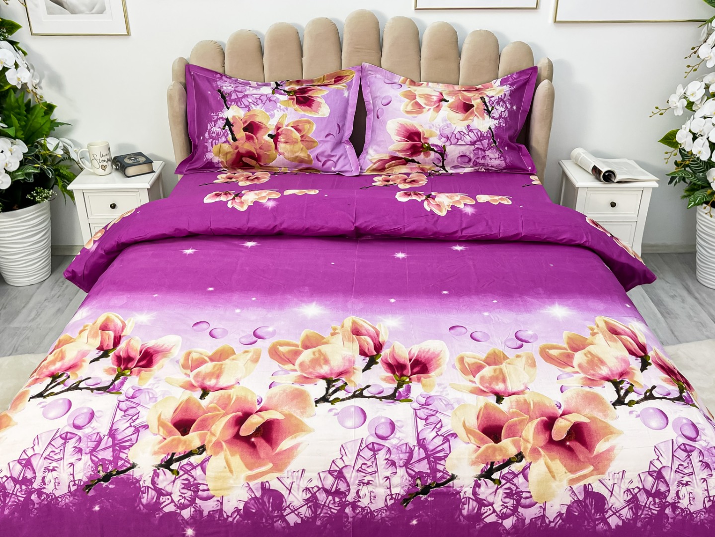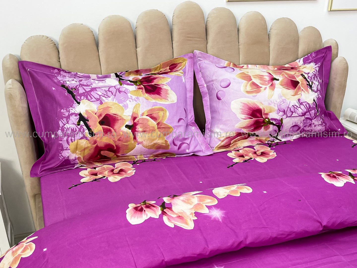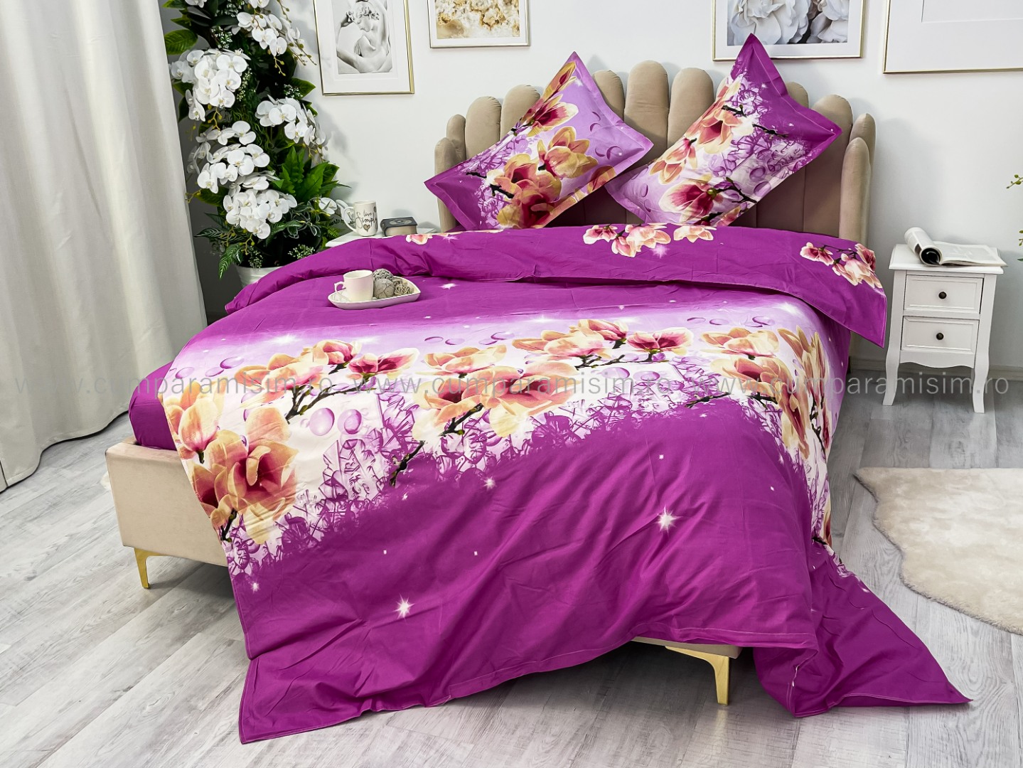 (OFERTA 3 la 199 Lei) Lenjerie pat dublu, 4 piese, IMPRIMEU 3D Multiplicat, Microfibra, Mov, magnolii