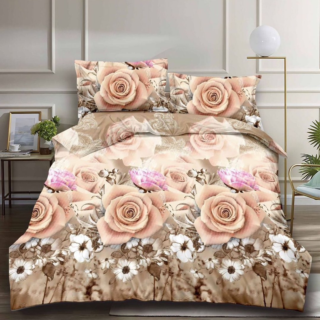 (OFERTA 3 la 199 Lei) Lenjerie pat dublu, 4 piese, IMPRIMEU 3D Multiplicat Multiplicat, Microfibra, Bej, flori