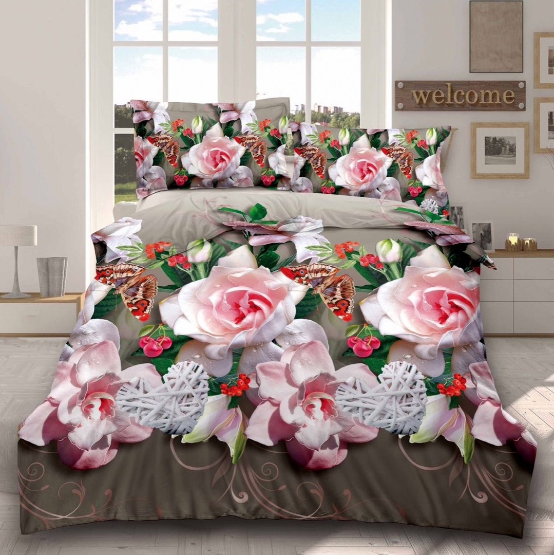 (OFERTA 3 la 199 Lei) Lenjerie pat dublu, 4 piese, IMPRIMEU 3D Multiplicat Multiplicat, Microfibra, Grej-Roz, flori, fluturi