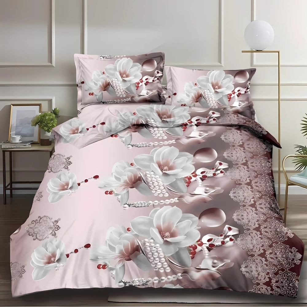 (OFERTA 3 la 199 Lei) Lenjerie pat dublu, 4 piese, IMPRIMEU 3D Multiplicat Multiplicat, Microfibra, Maro, flori