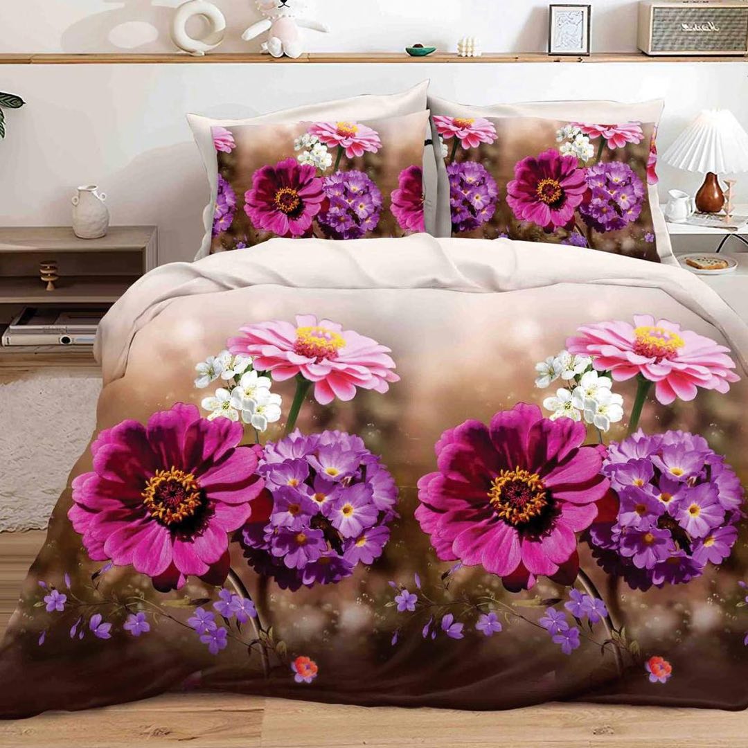 (OFERTA 3 la 199 Lei) Lenjerie pat dublu, 4 piese, IMPRIMEU 3D Multiplicat Multiplicat, Microfibra, Mov, flori