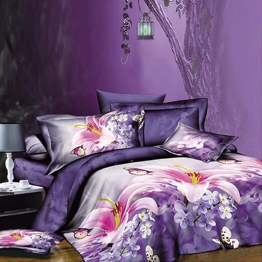 (OFERTA 3 la 199 Lei) Lenjerie pat dublu, 4 piese, IMPRIMEU 3D Multiplicat Multiplicat, Microfibra, Mov, fluturi, flori