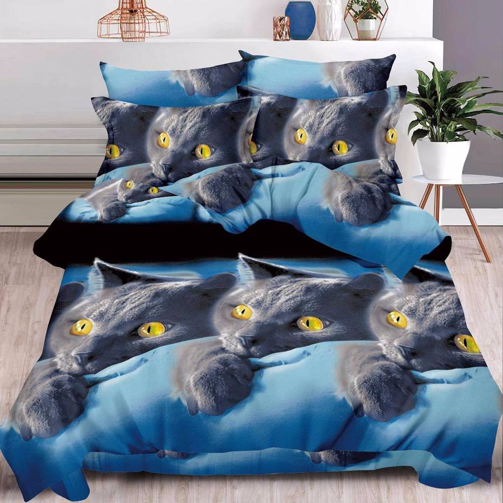 Lenjerie pat dublu, 6 PIESE, IMPRIMEU 3D Multiplicat, Microfibra, Albastru, pisici