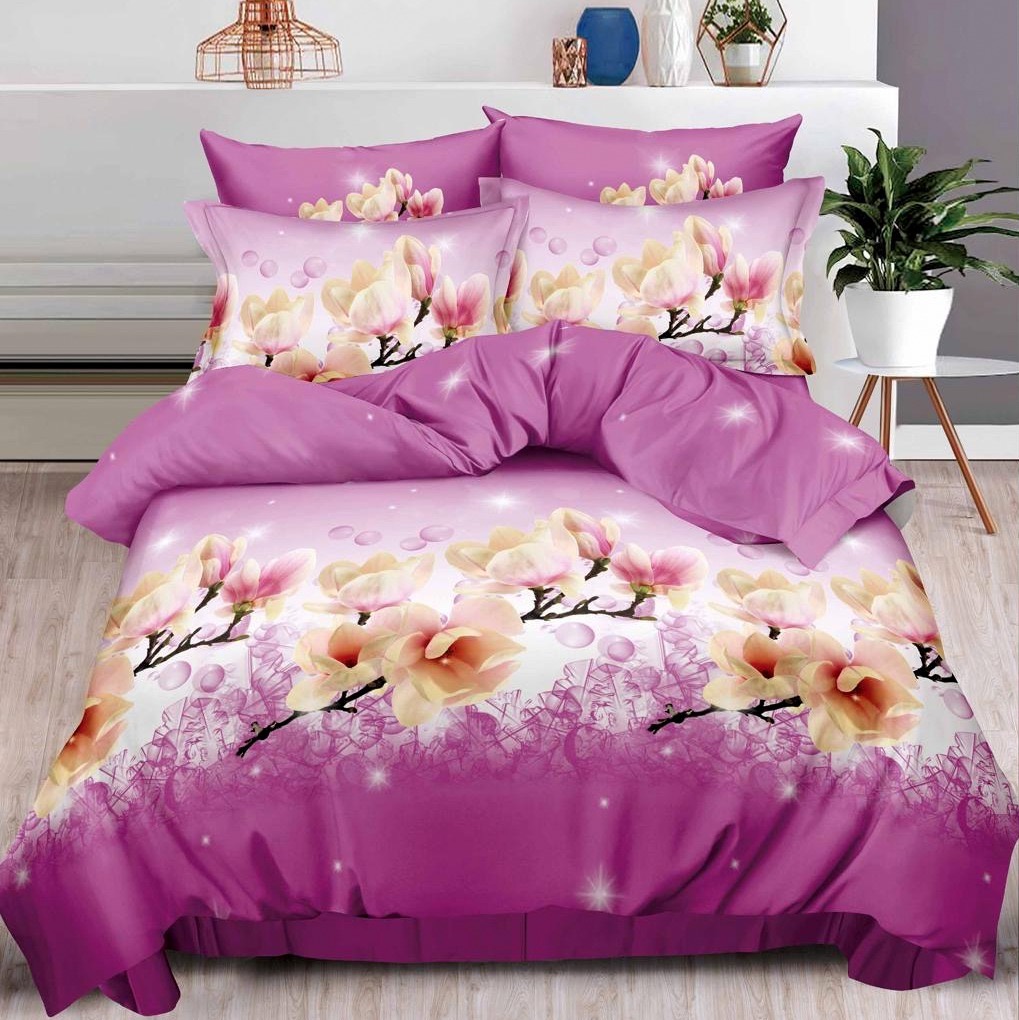 Lenjerie pat dublu, 6 PIESE, IMPRIMEU 3D Multiplicat, Microfibra, Roz, magnolii
