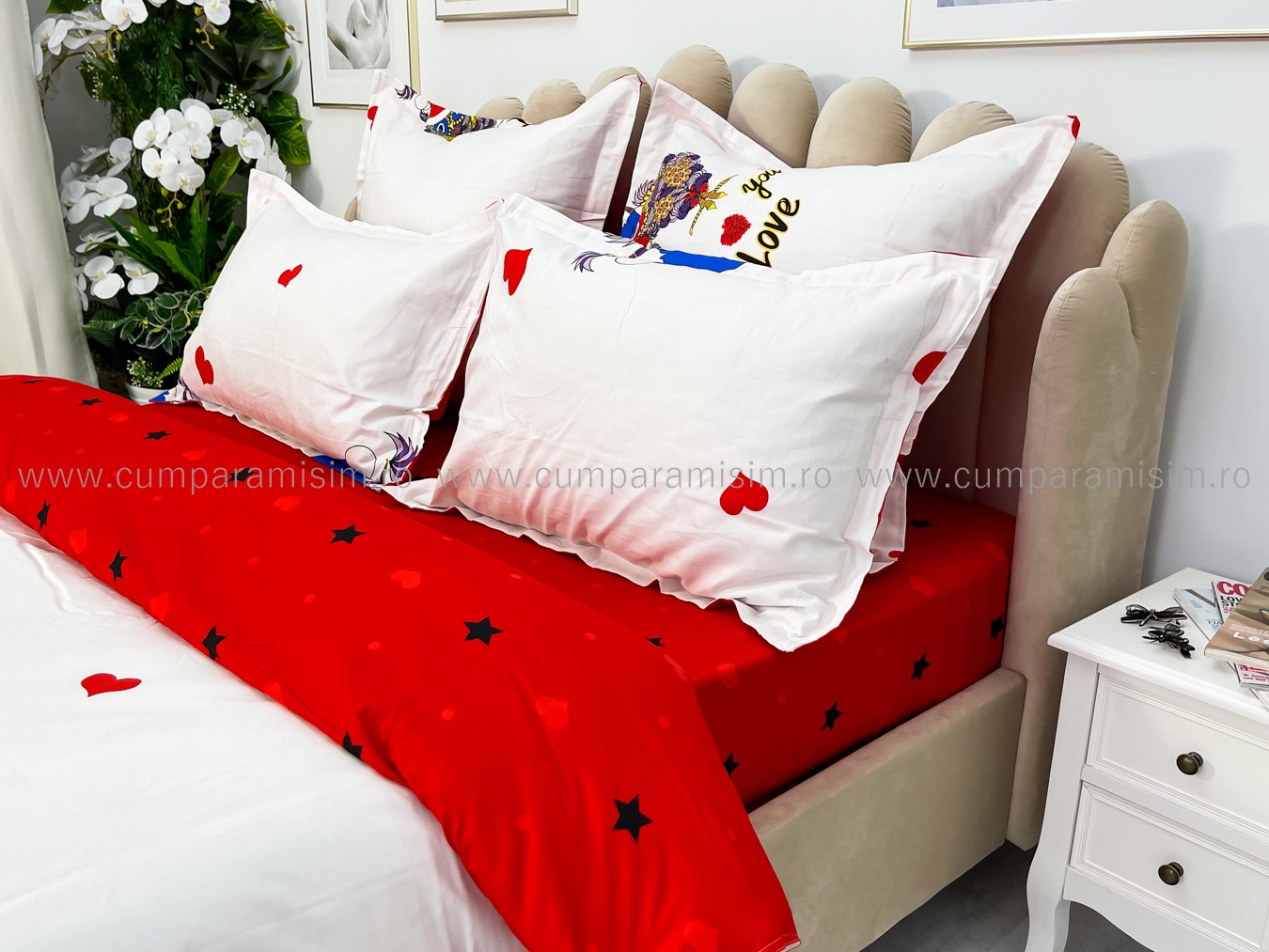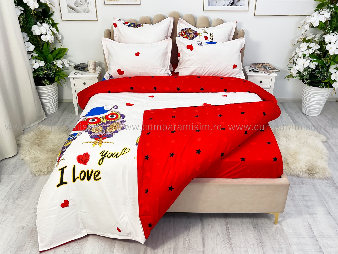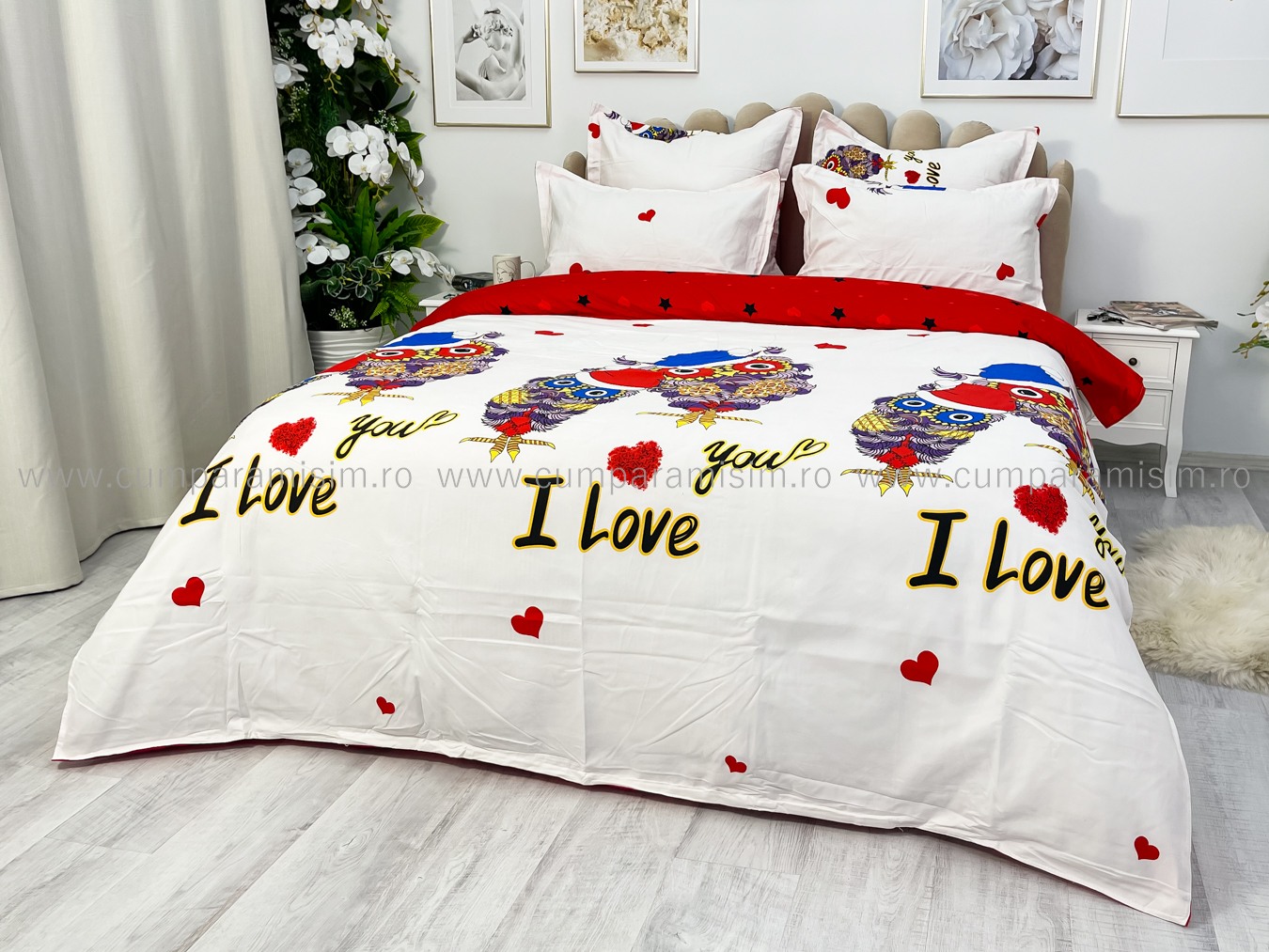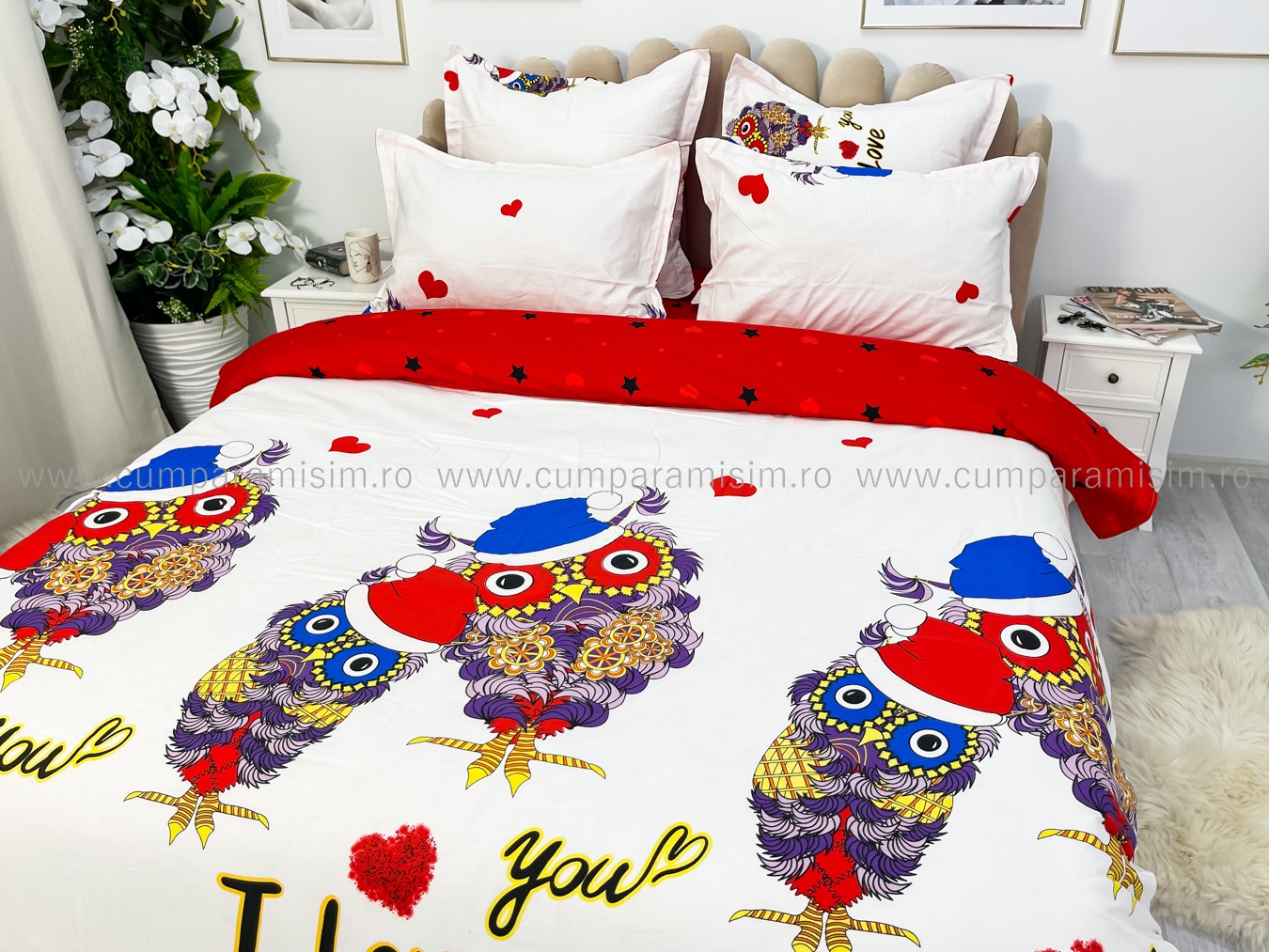 (OFERTA TRIO) Lenjerie pat dublu, FINET, 6 piese, Alb-Rosu, bufnite