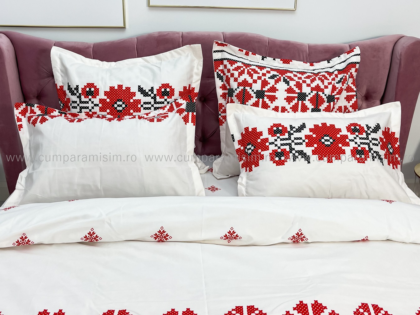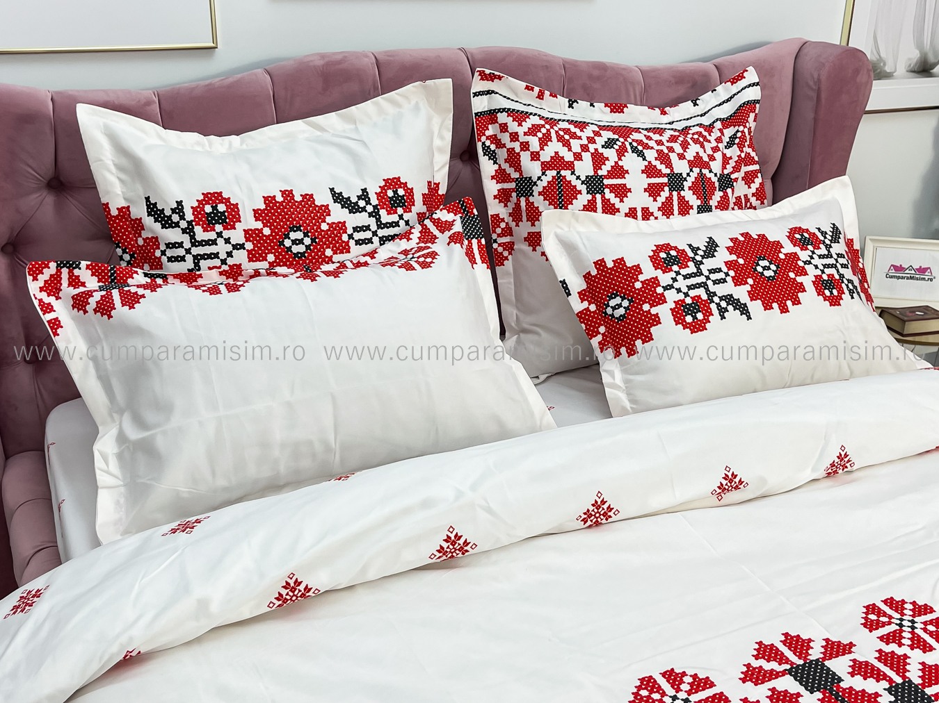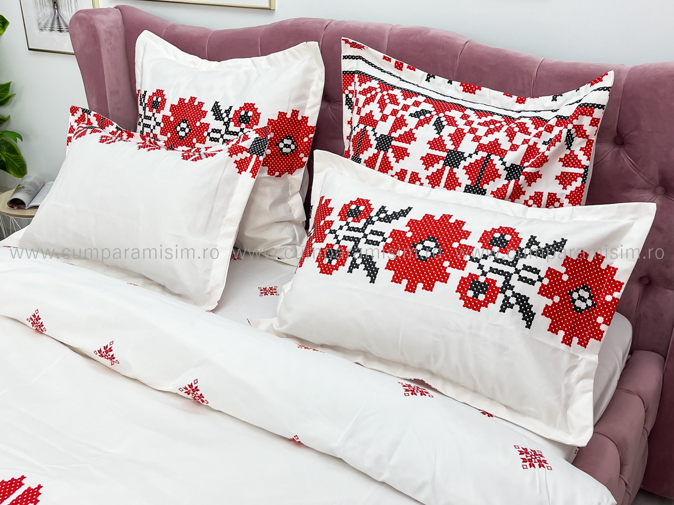 (OFERTA TRIO) Lenjerie pat dublu, FINET, 6 piese, Alb-Rosu, model traditional