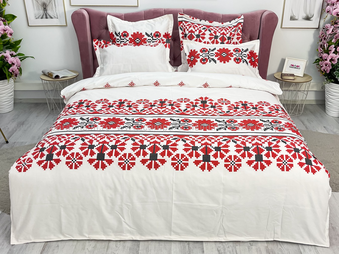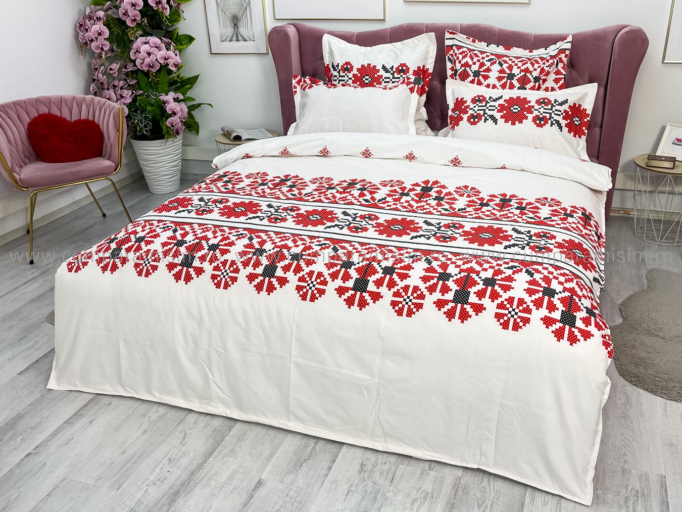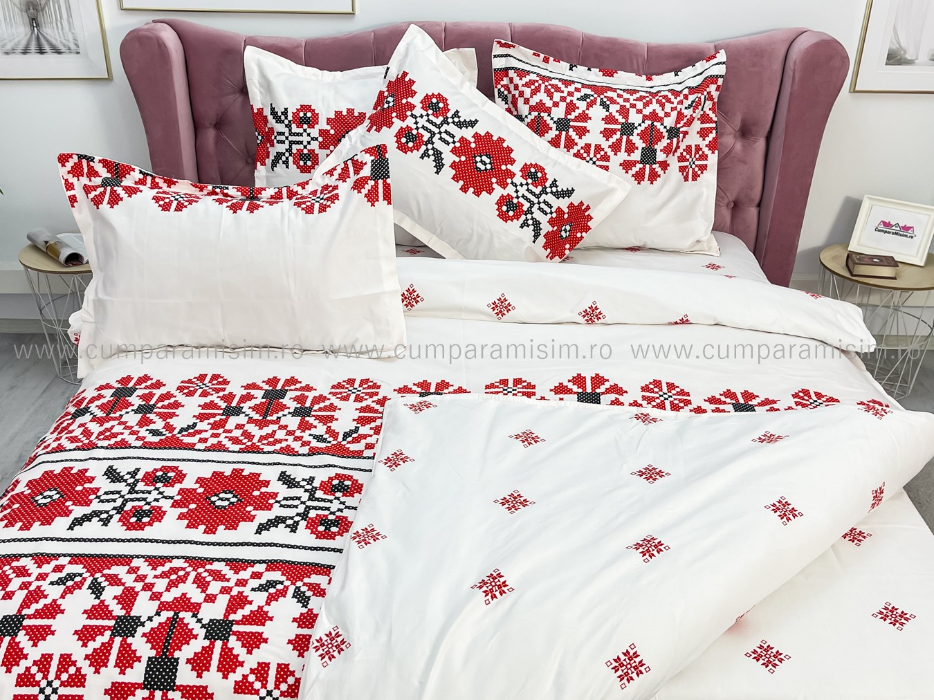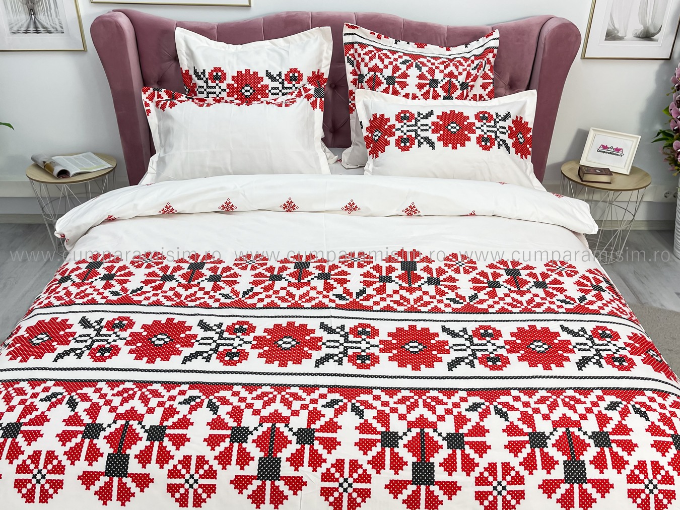 (OFERTA TRIO) Lenjerie pat dublu, FINET, 6 piese, Alb-Rosu, model traditional