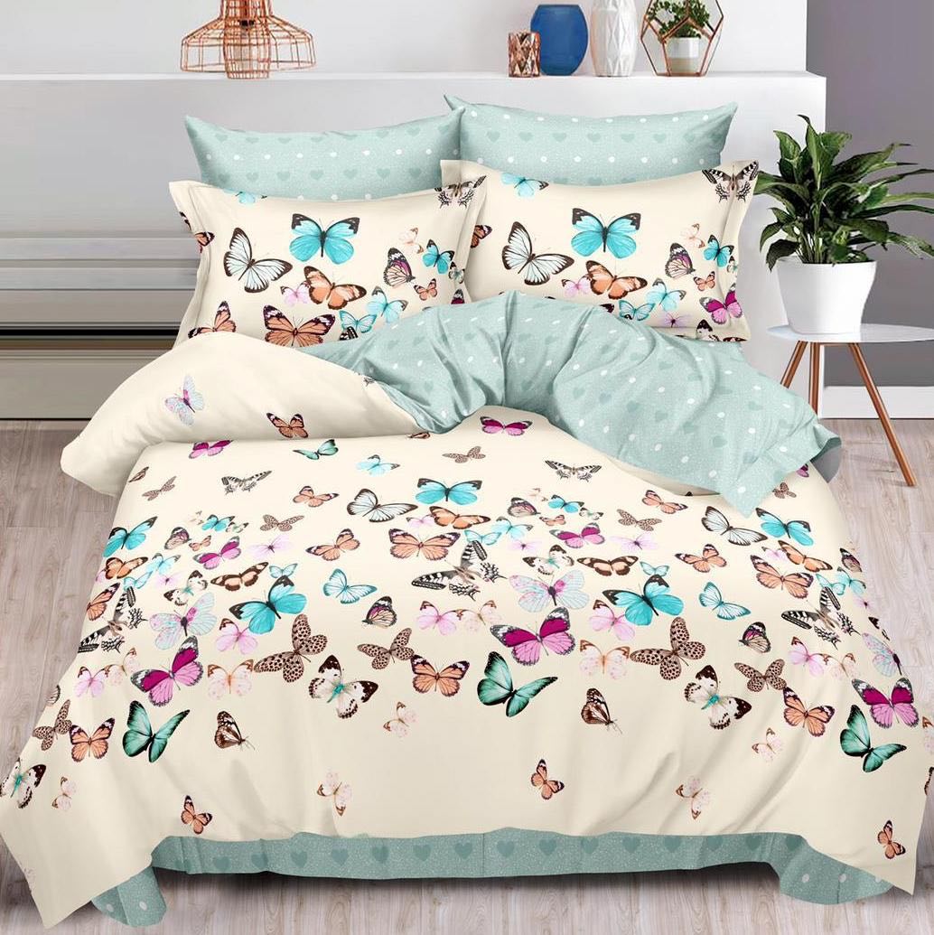 Lenjerie pat dublu cu ELASTIC, Finet, 6 piese, Bleu, fluturi