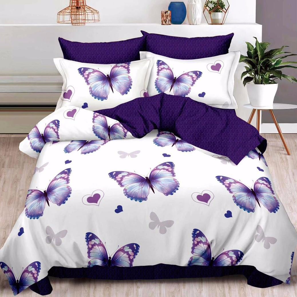 Lenjerie pat dublu cu ELASTIC, Finet, 6 piese, Mov, fluturi, inimioare