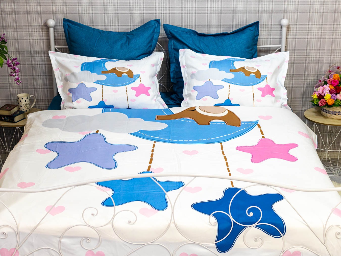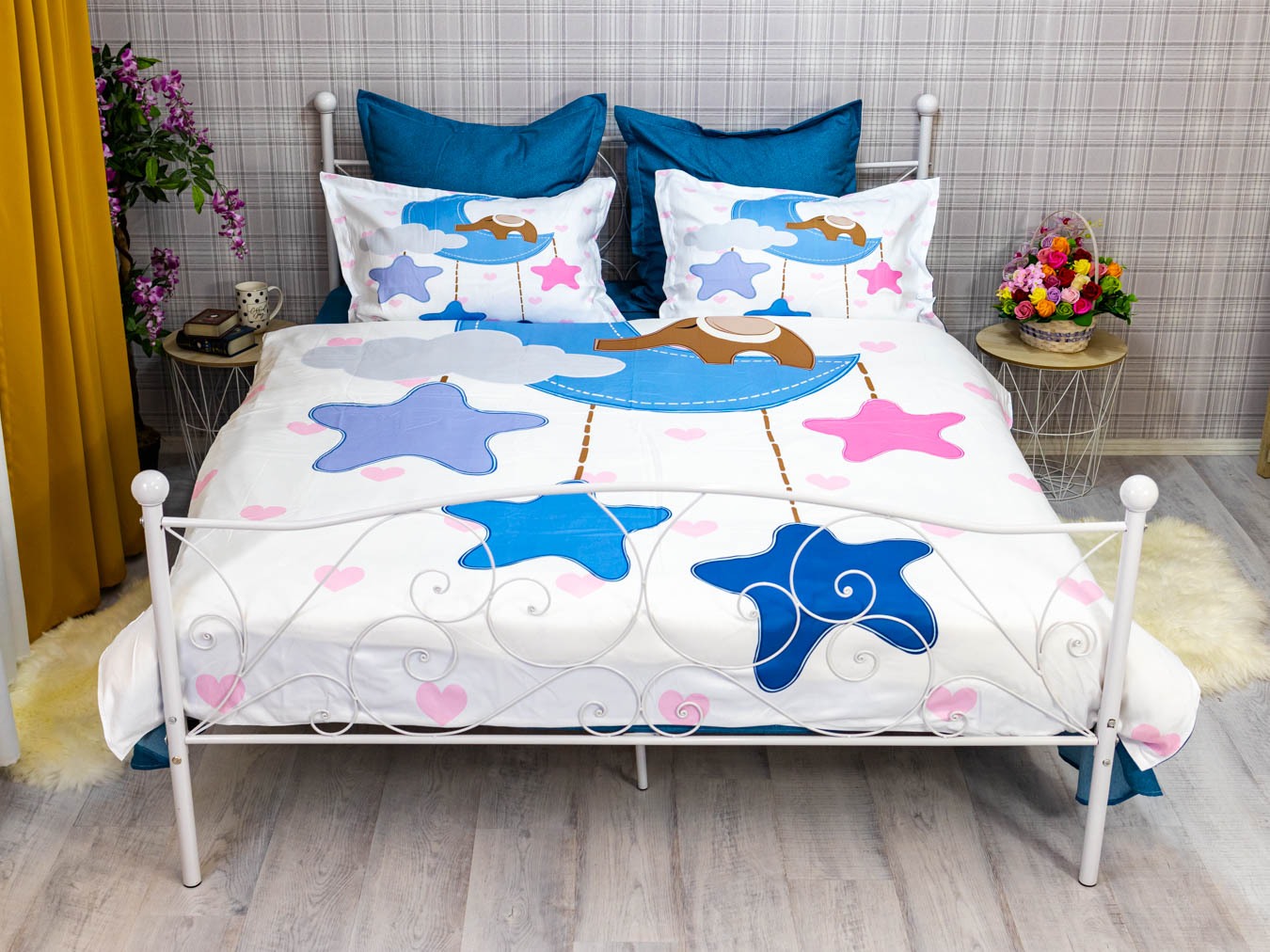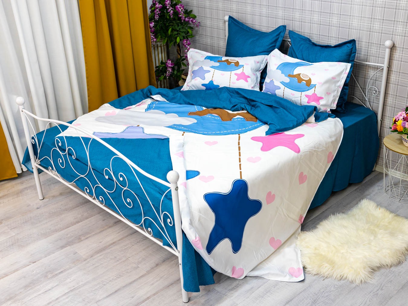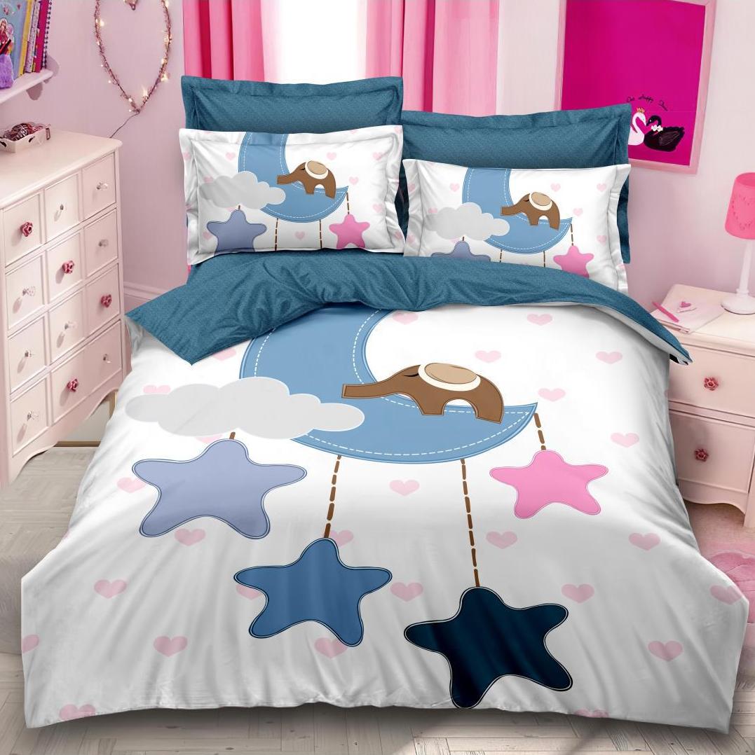 (OFERTA TRIO) Lenjerie pat dublu, FINET, 6 piese, IDENTICA CU POZA, Albastru, stelute