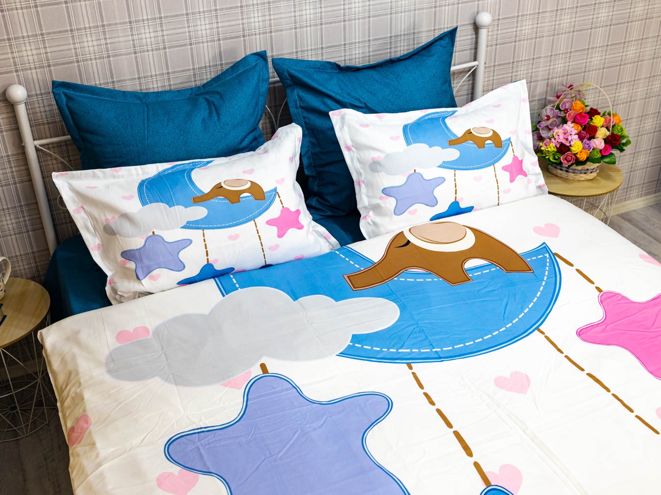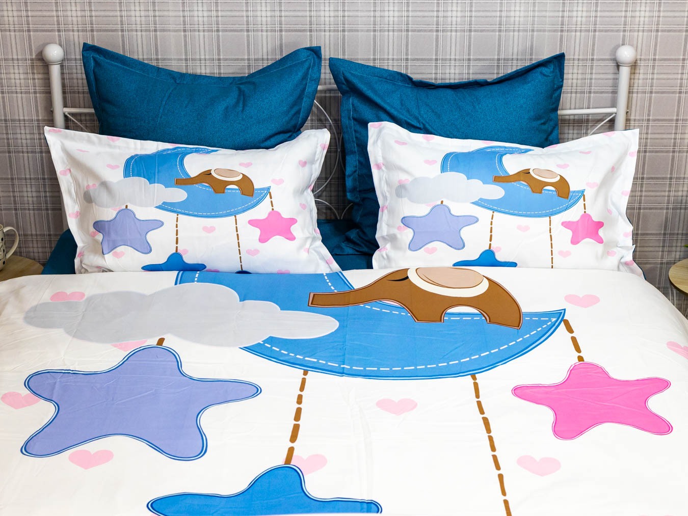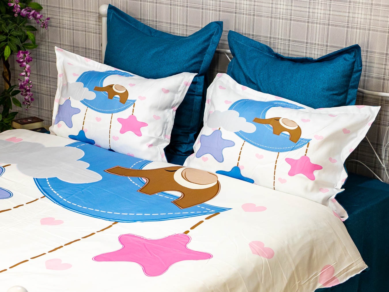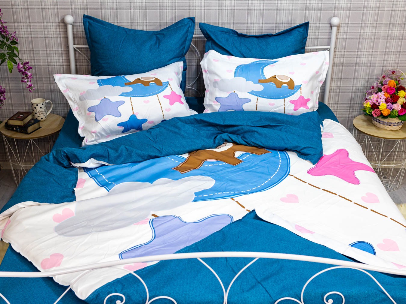 (OFERTA TRIO) Lenjerie pat dublu, FINET, 6 piese, IDENTICA CU POZA, Albastru, stelute