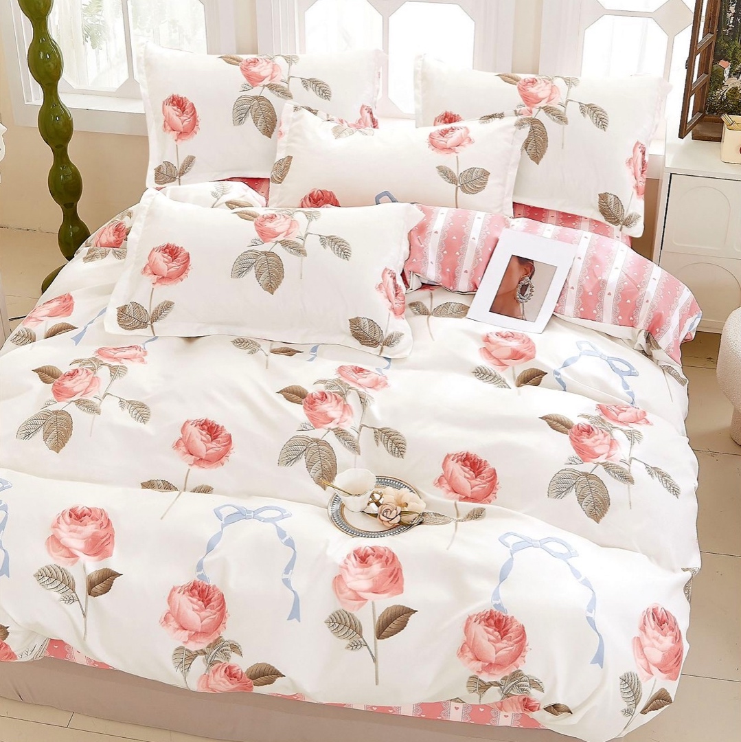 Lenjerie pat dublu, Finet, 6 piese, Roz, trandafiri