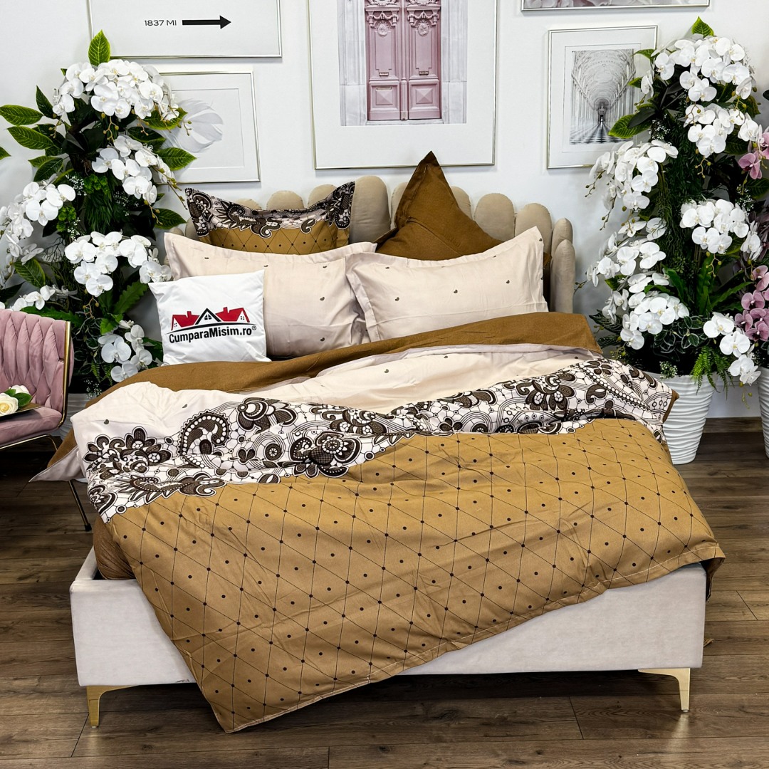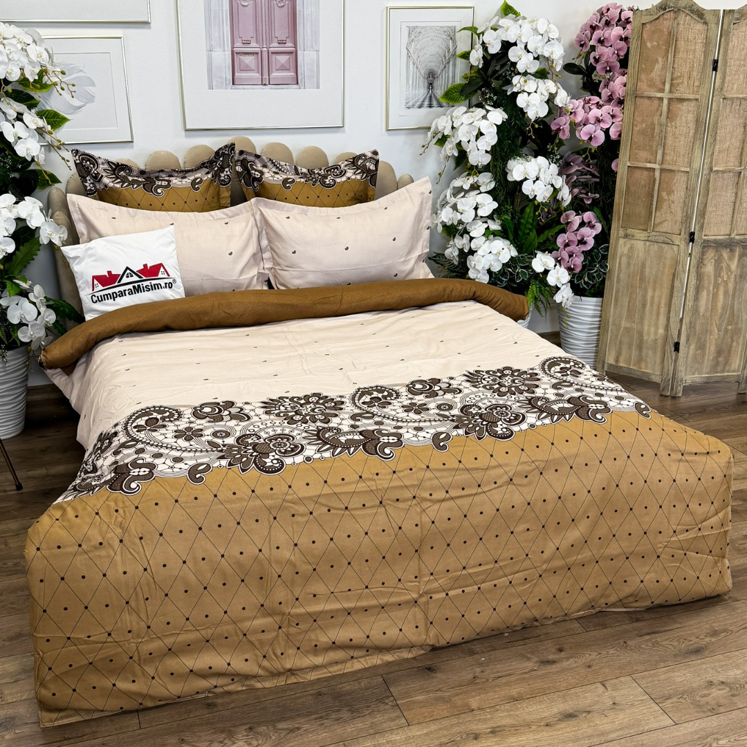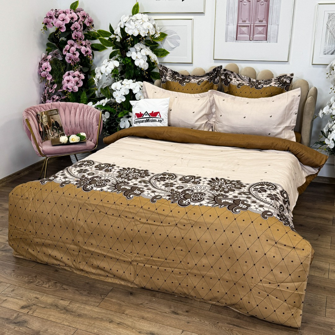 (OFERTA TRIO) Lenjerie pat dublu, FINET, cu elastic, 6 piese, Bej, Maro , Flori