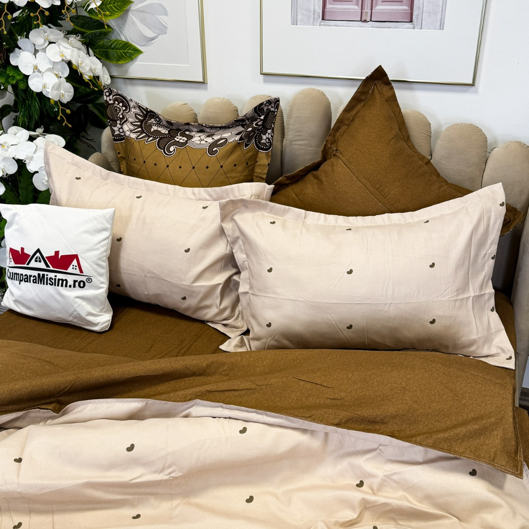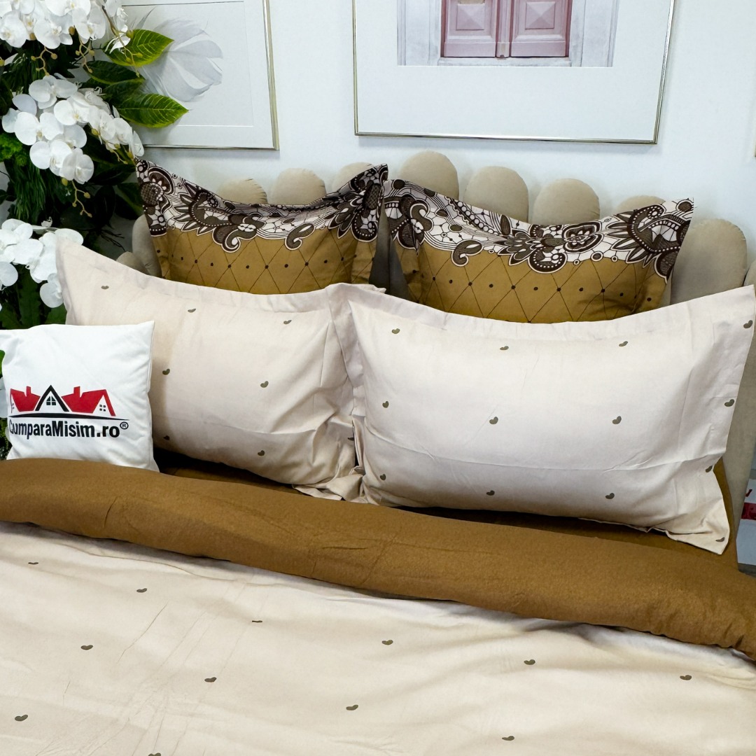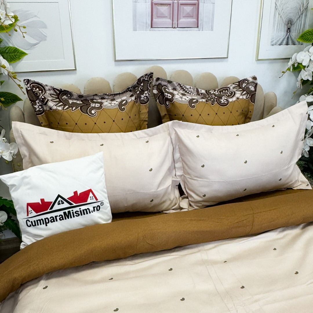 (OFERTA TRIO) Lenjerie pat dublu, FINET, cu elastic, 6 piese, Bej, Maro , Flori