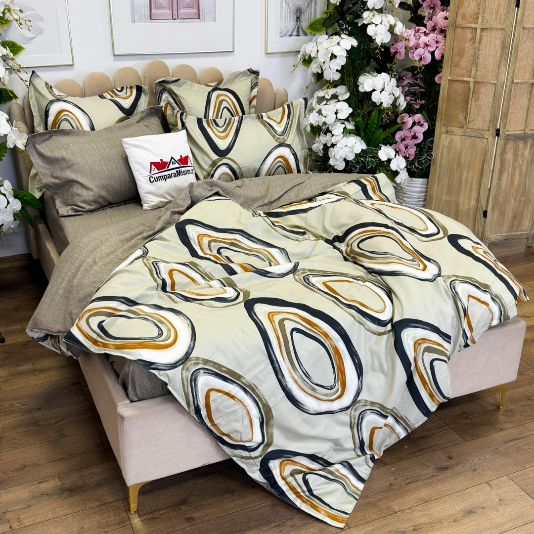 (OFERTA TRIO) Lenjerie pat dublu, FINET, cu elastic, 6 piese, Gri, Abstract
