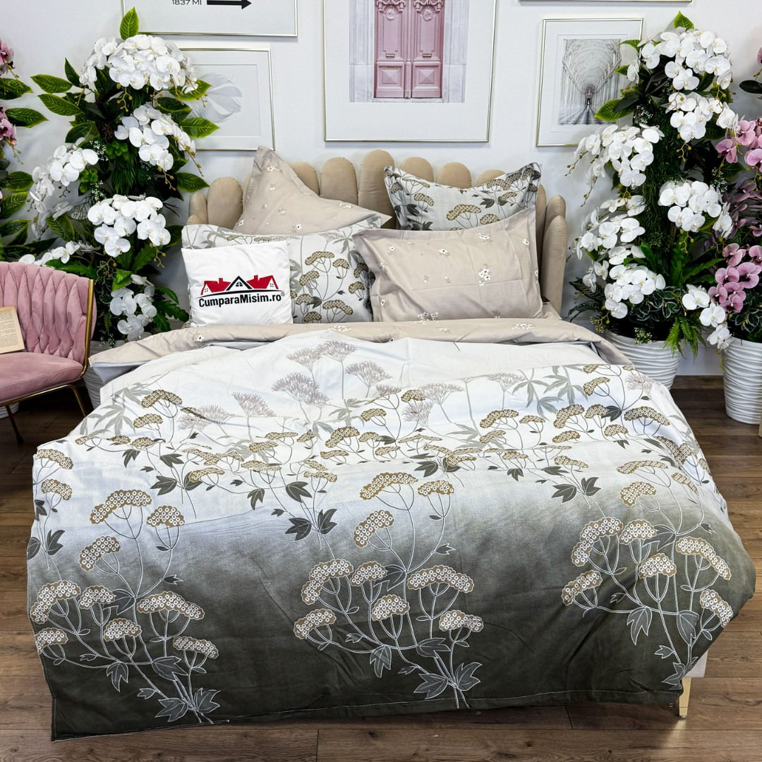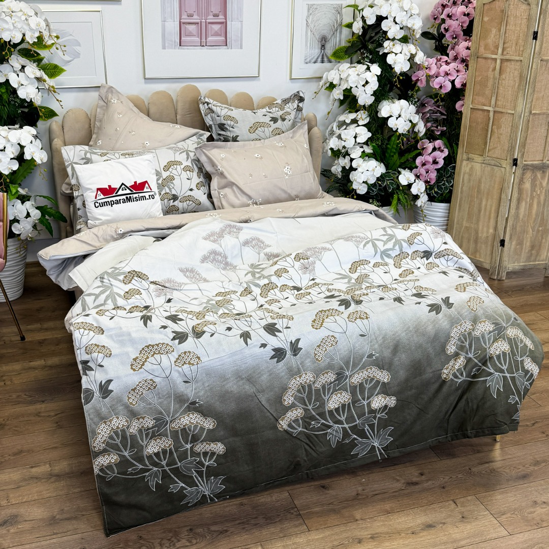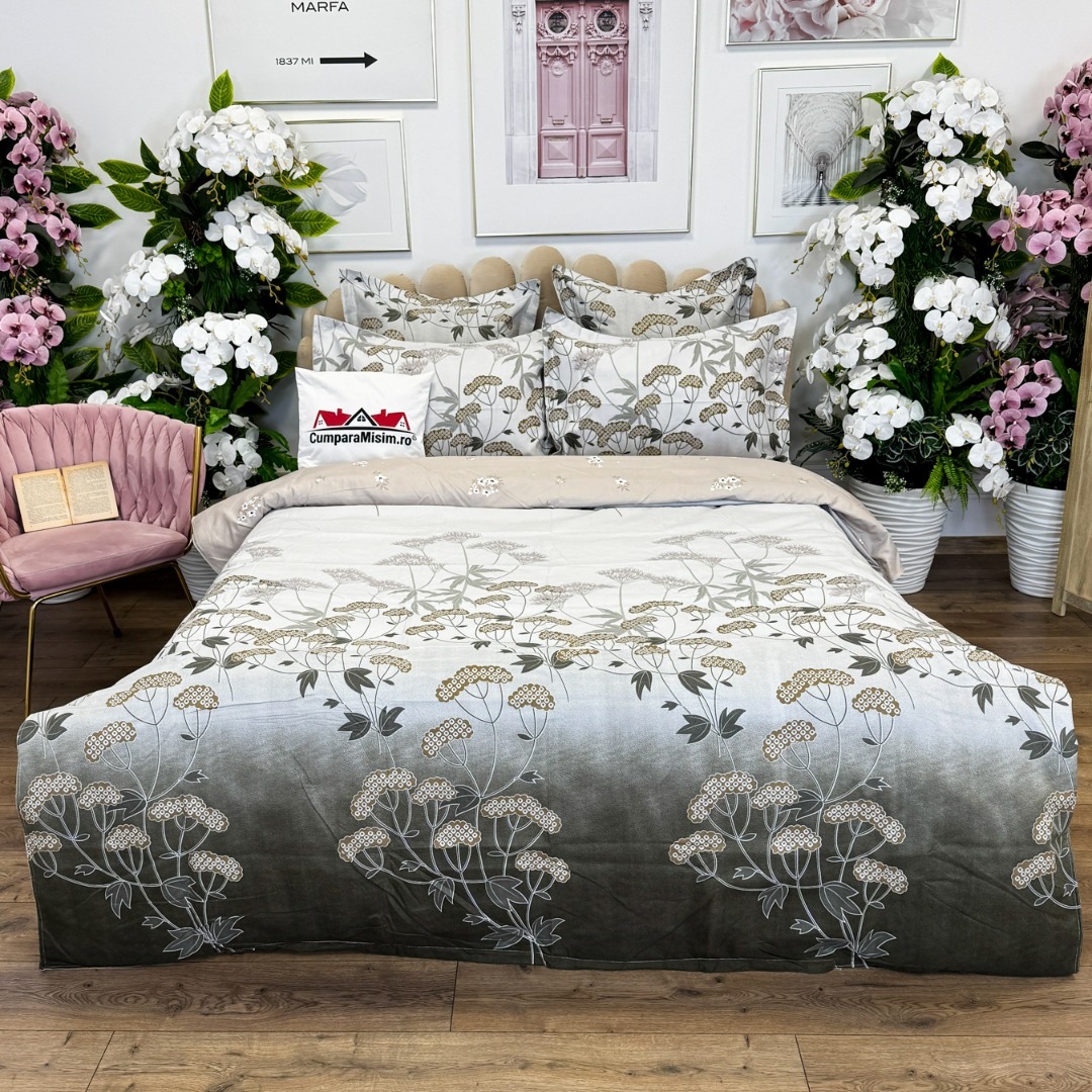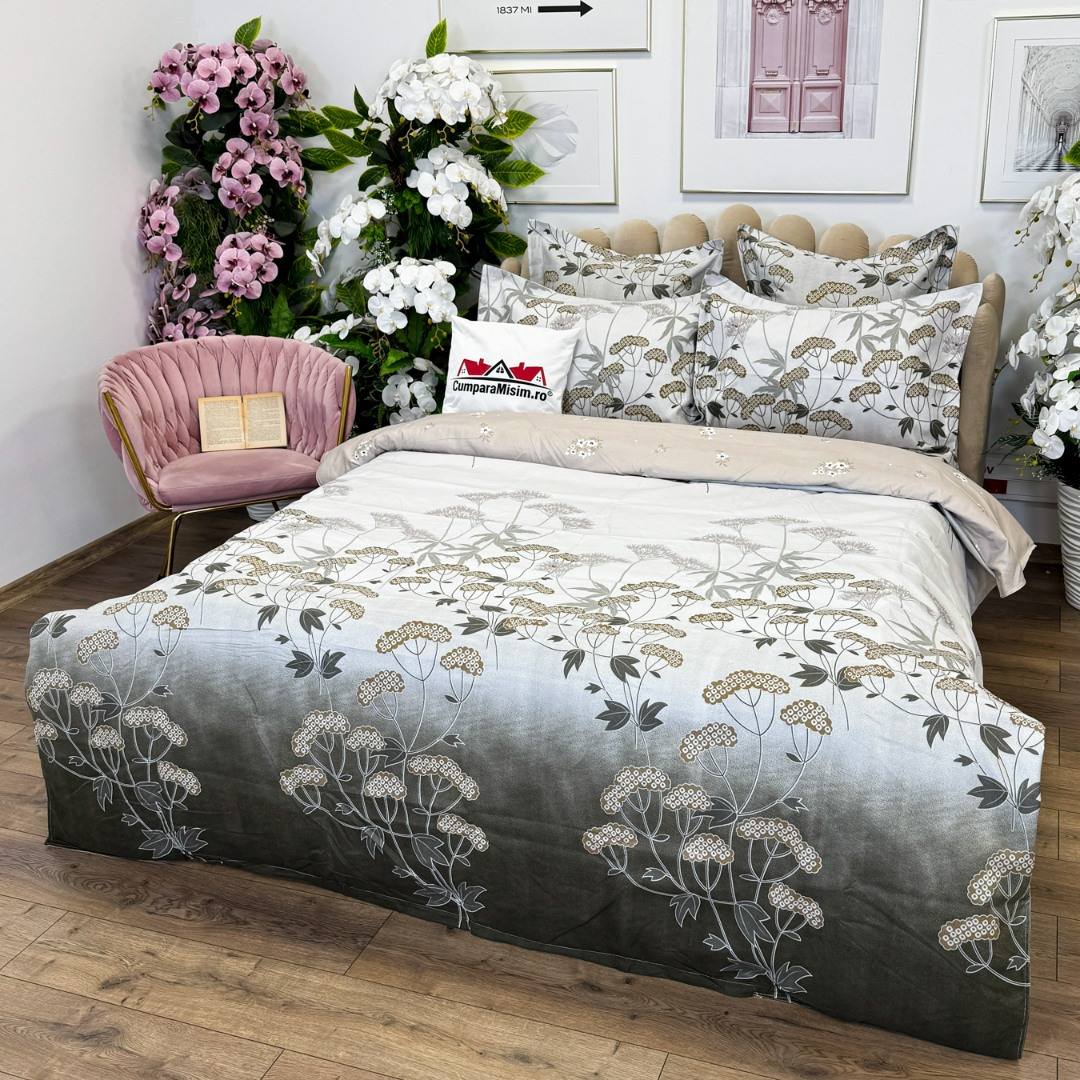 (OFERTA TRIO) Lenjerie pat dublu, FINET, cu elastic, 6 piese, Gri, Flori