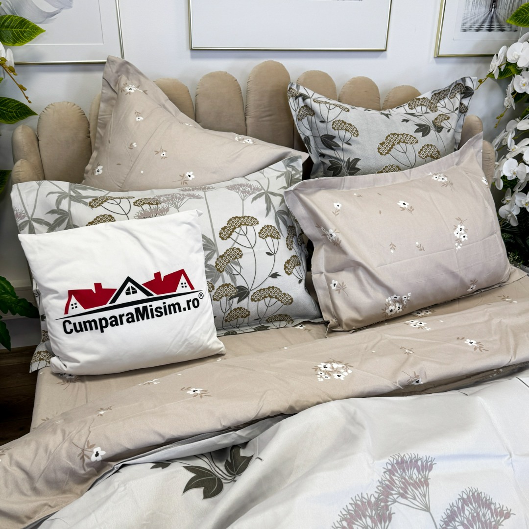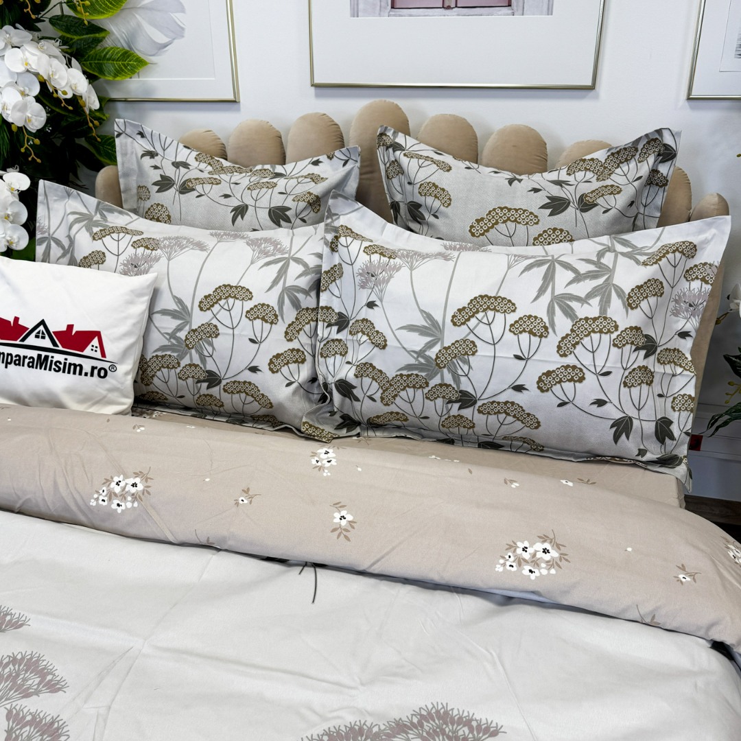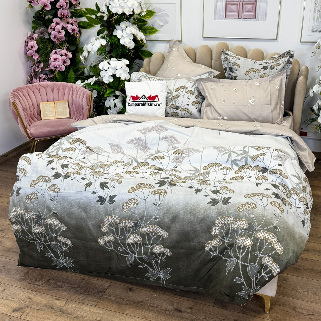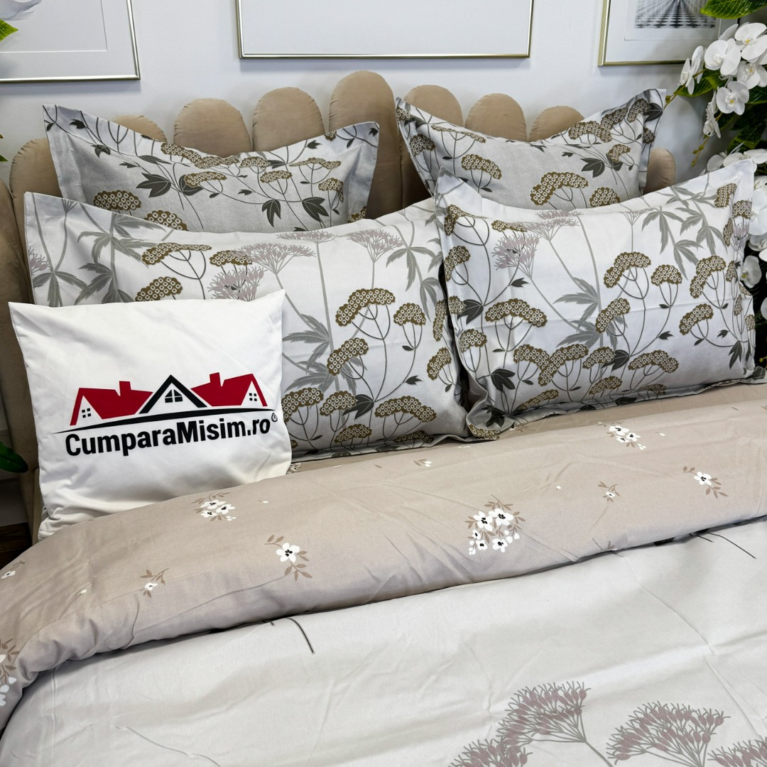 (OFERTA TRIO) Lenjerie pat dublu, FINET, cu elastic, 6 piese, Gri, Flori