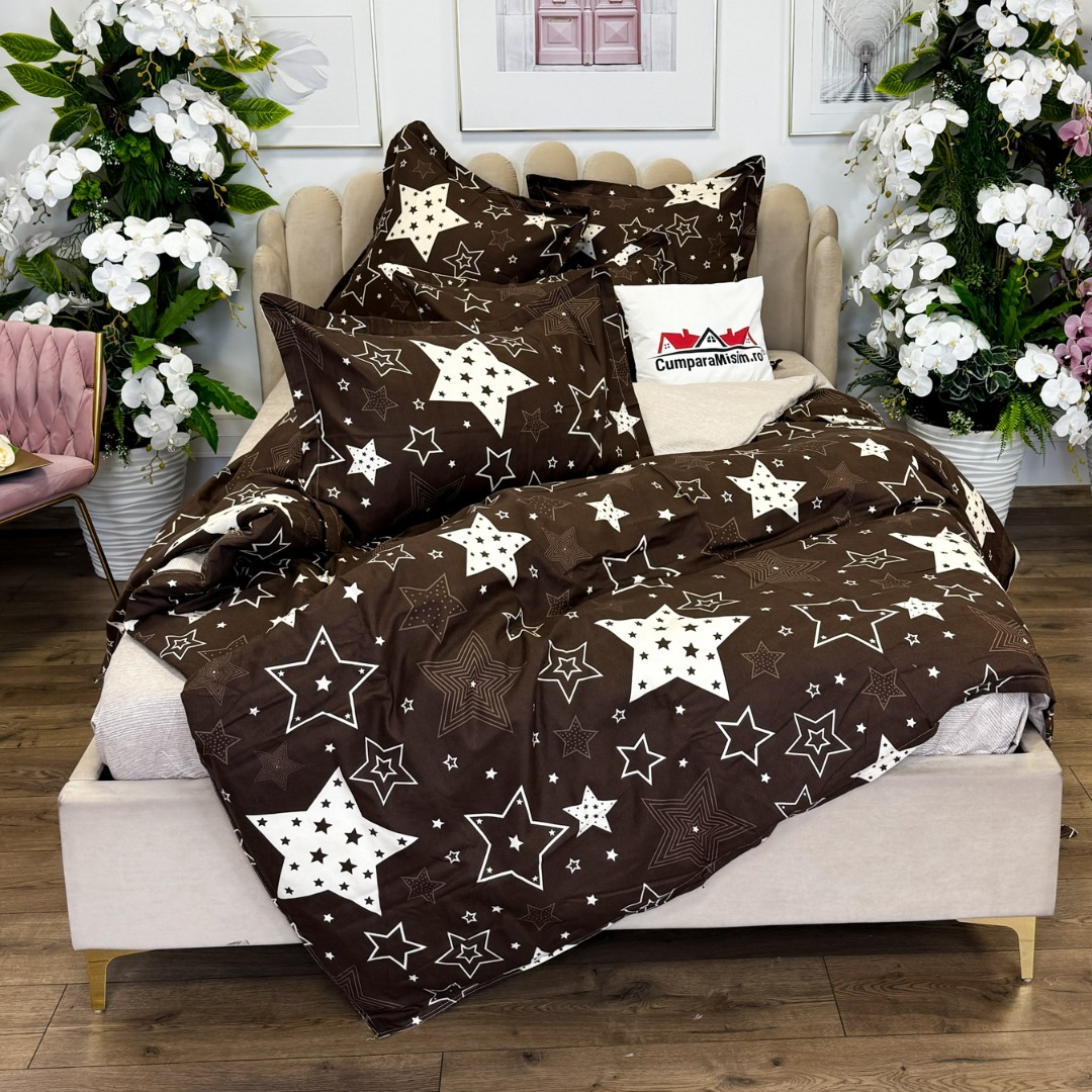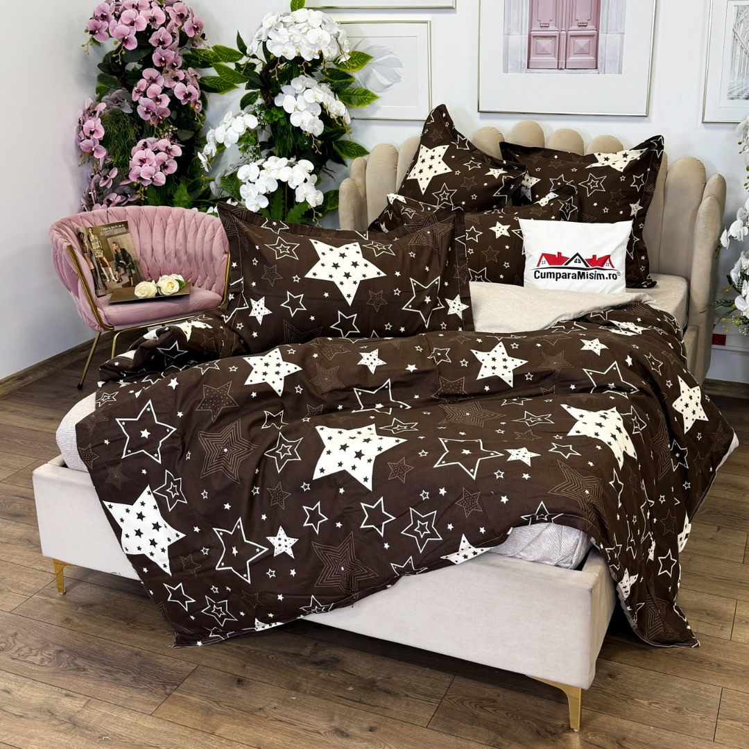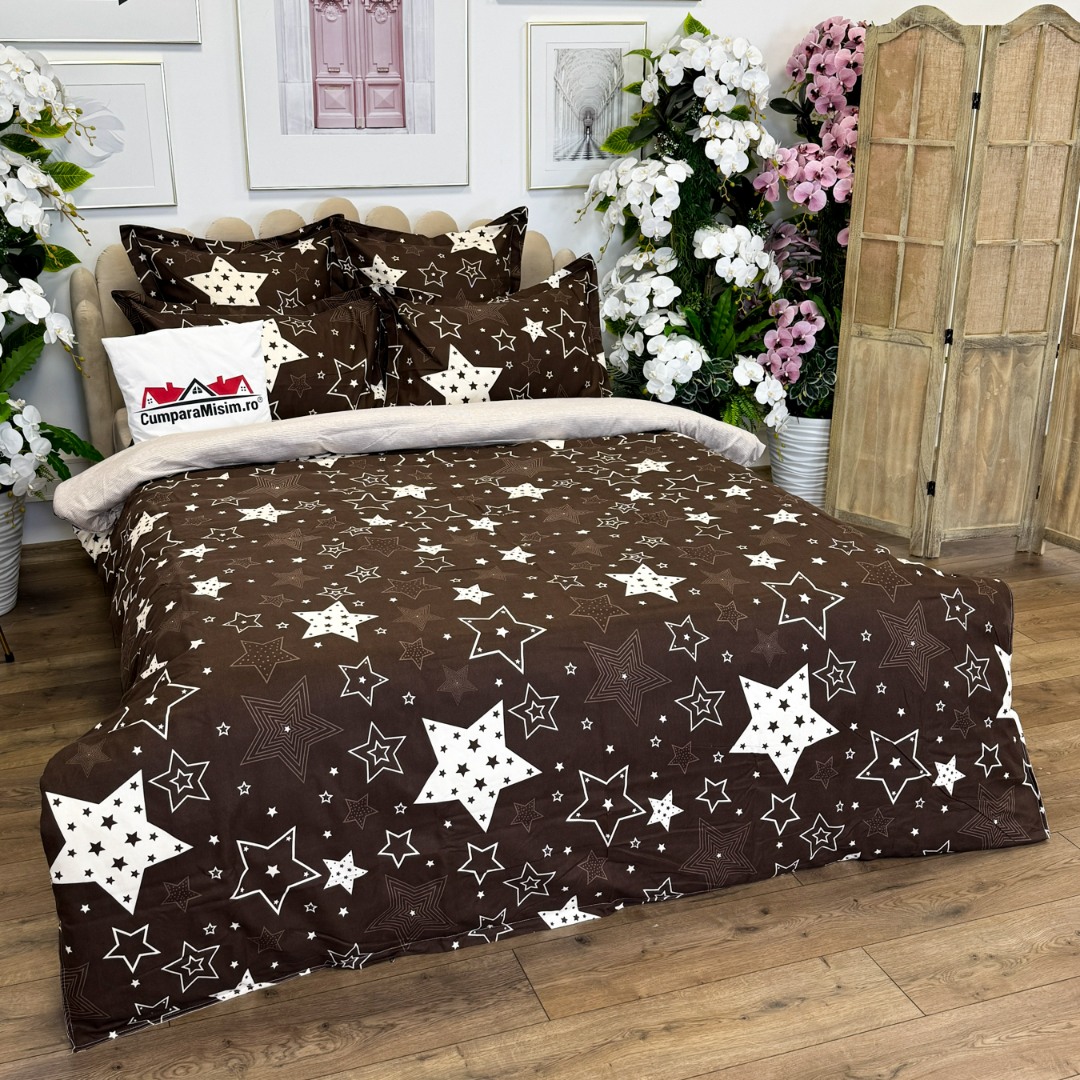 (OFERTA TRIO) Lenjerie pat dublu, FINET, cu elastic, 6 piese, Maro, Bej, Stelute