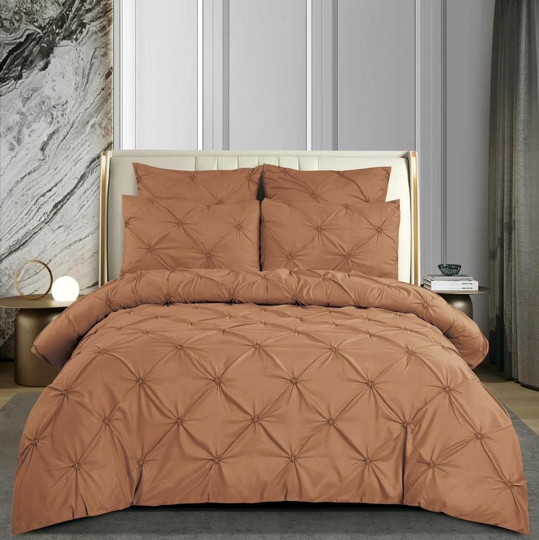 (OFERTA TRIO) Lenjerie pat dublu, FINET cu ELASTIC, 6 piese, PLIURI BRODATE, Maro