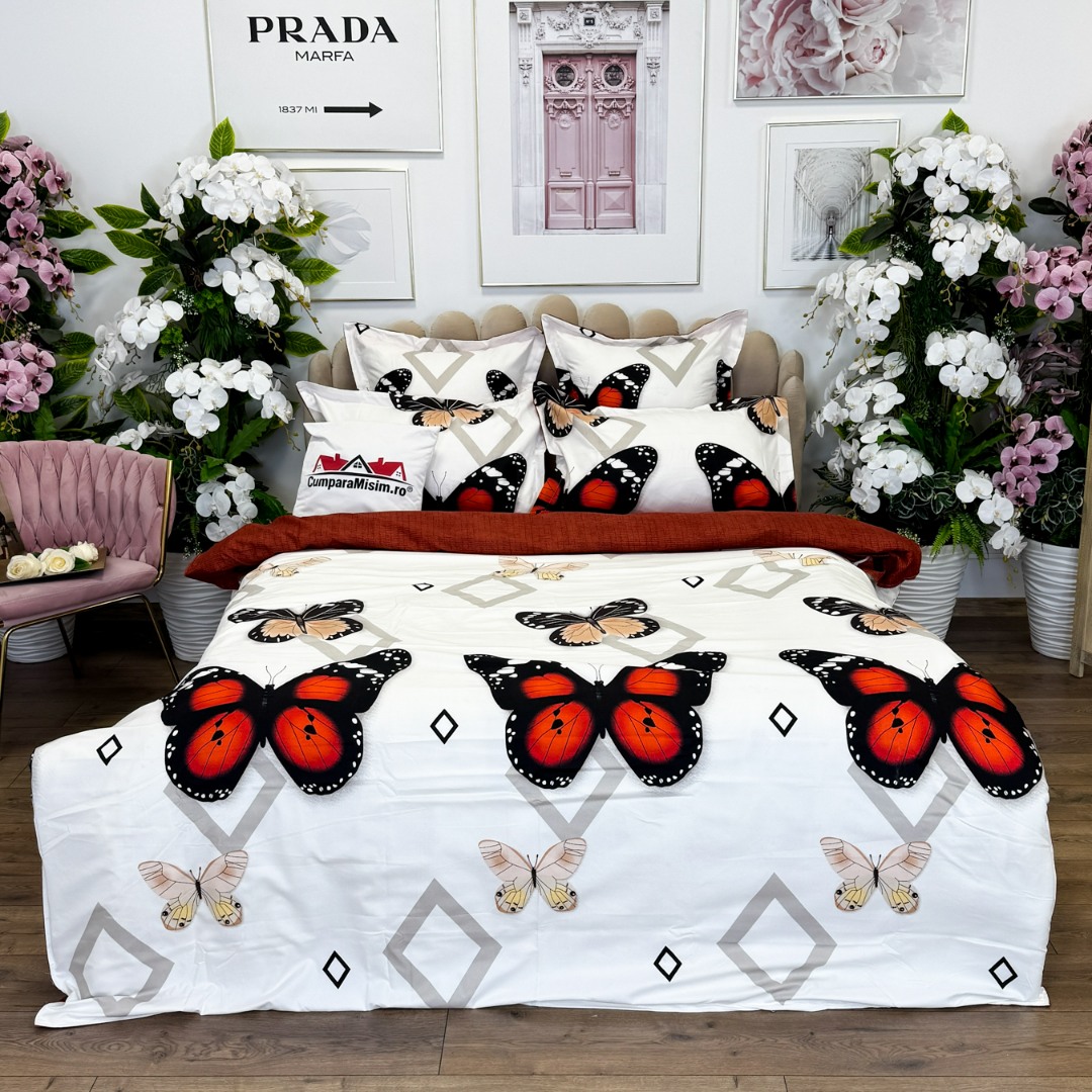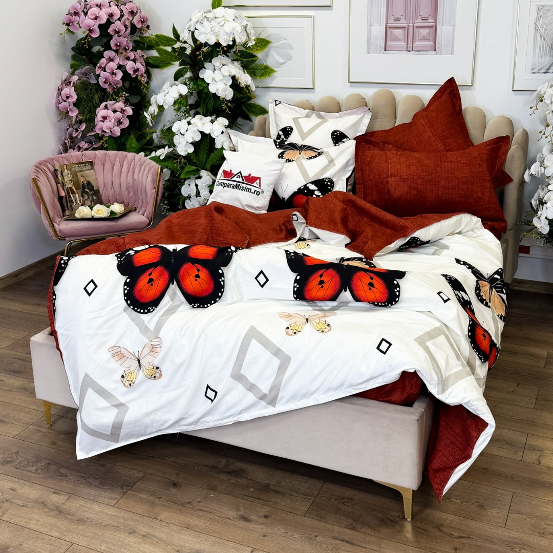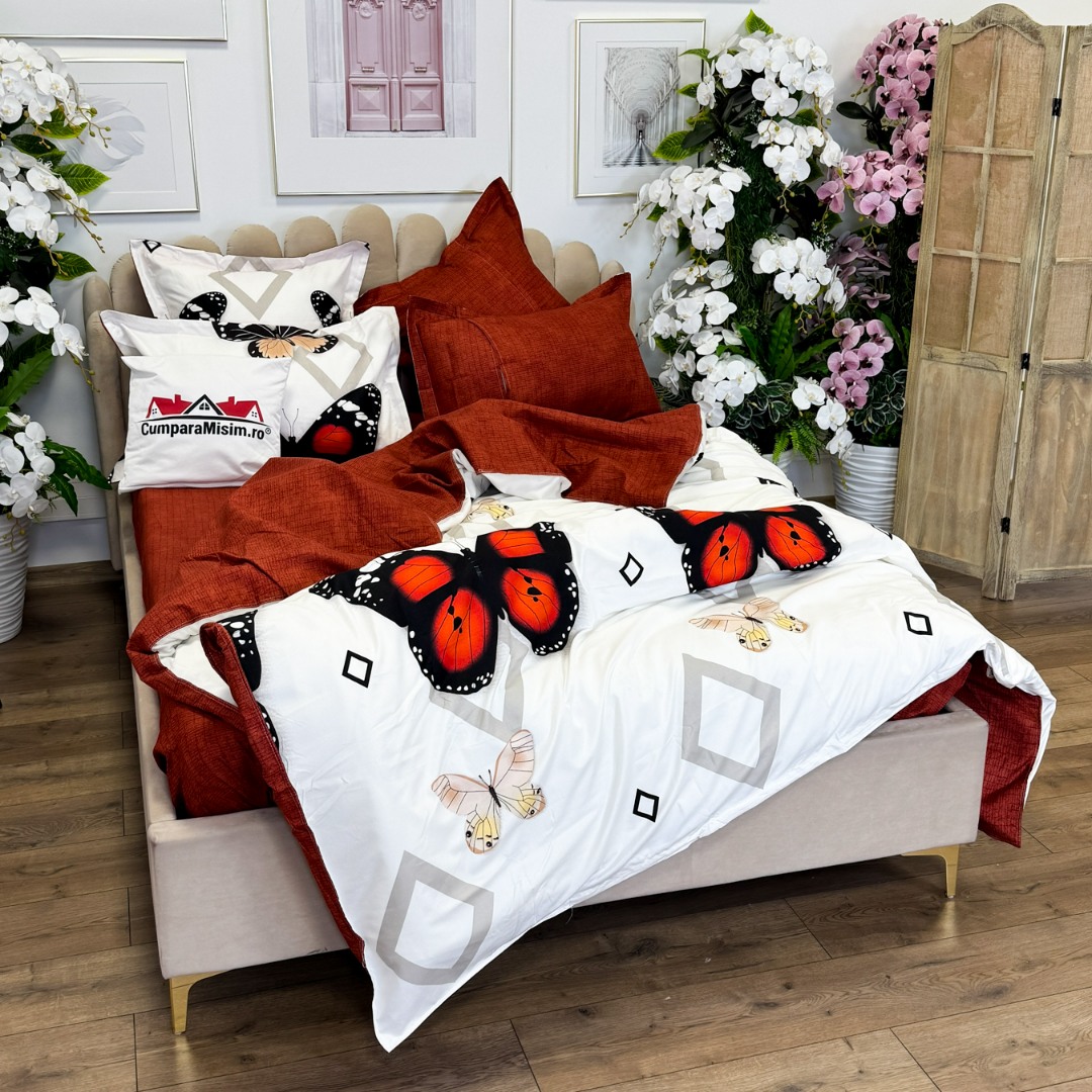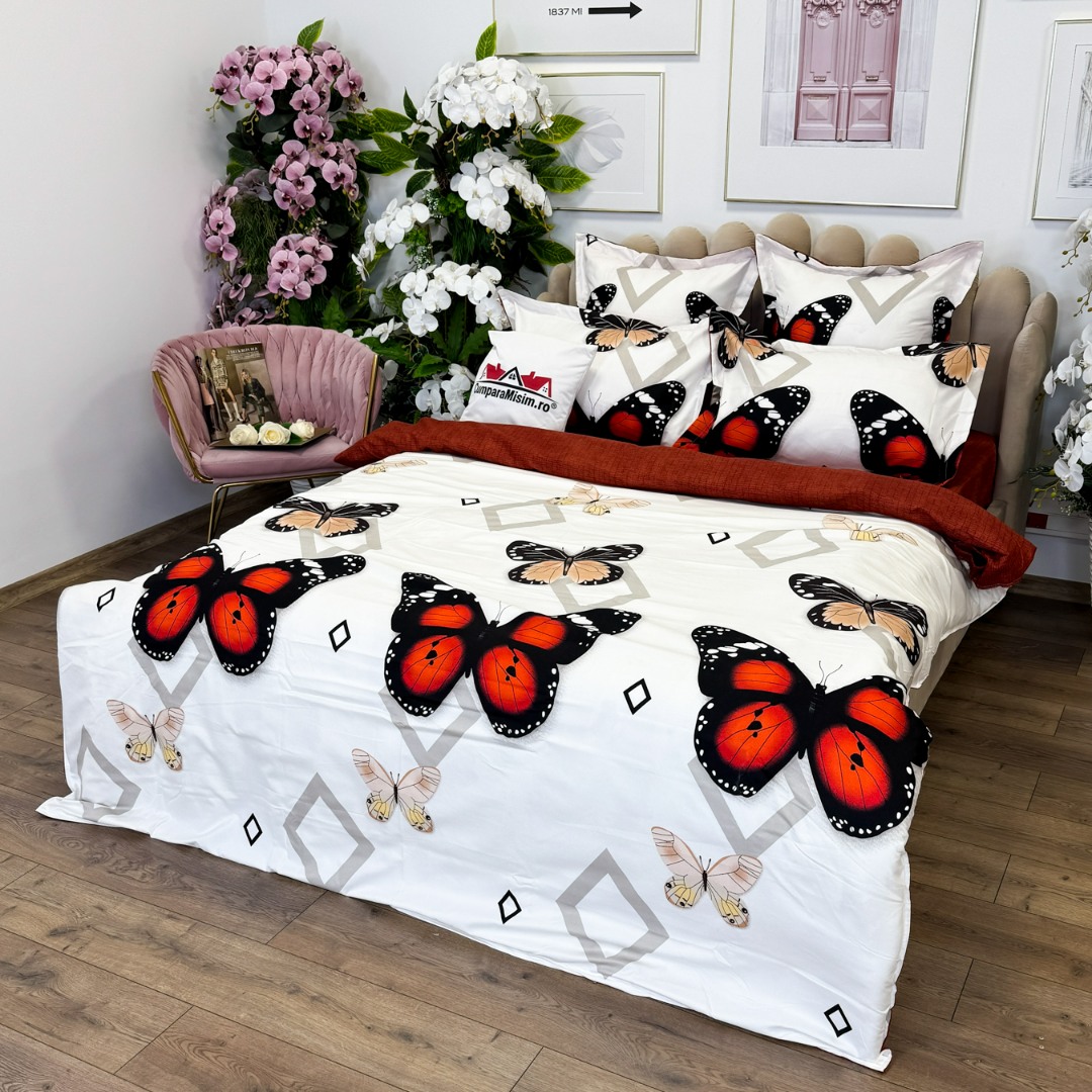 (OFERTA TRIO) Lenjerie pat dublu, FINET, cu elastic, 6 piese, Rosu, fluturi, forme geometrice