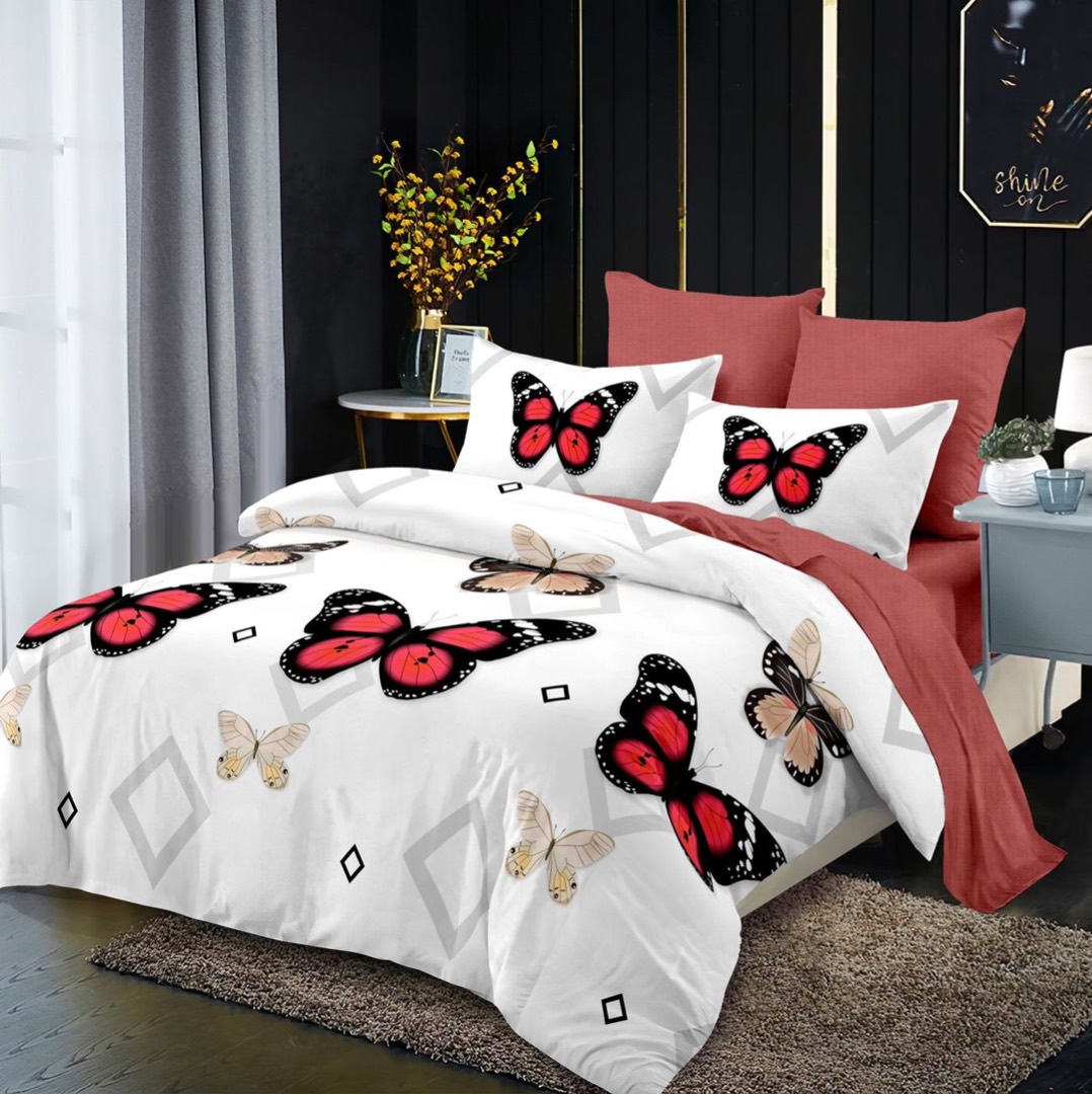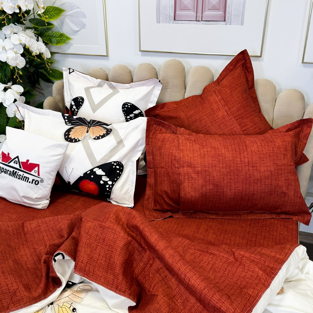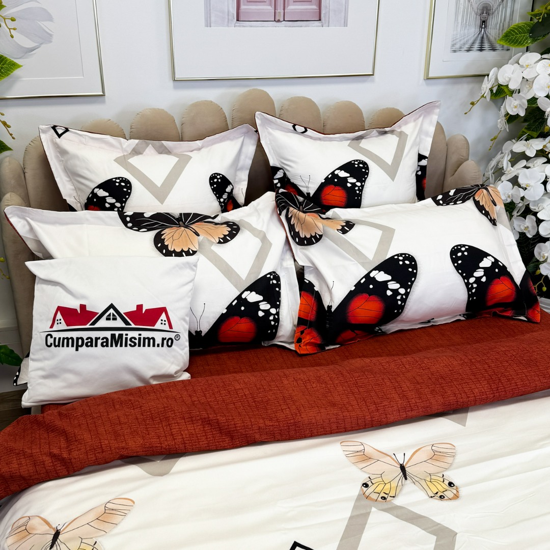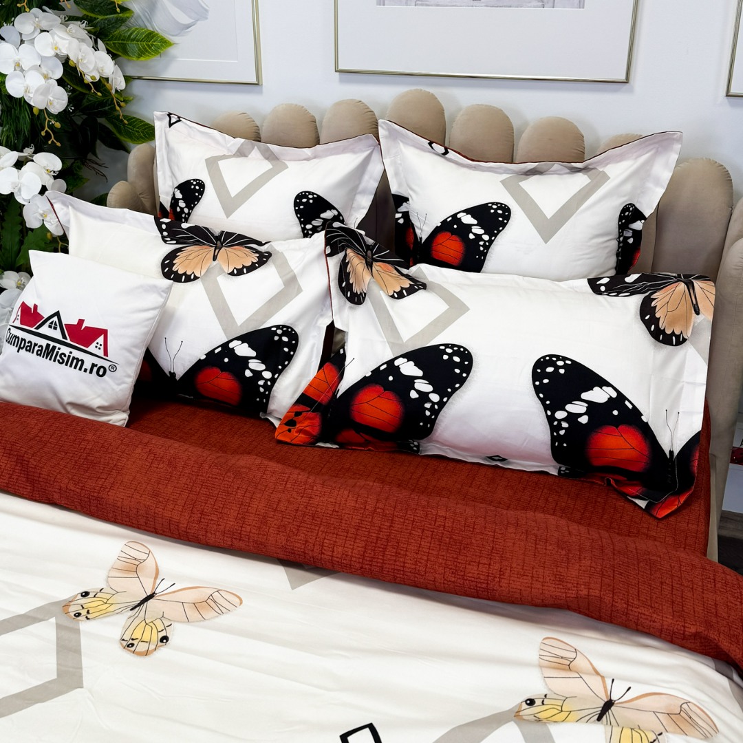 (OFERTA TRIO) Lenjerie pat dublu, FINET, cu elastic, 6 piese, Rosu, fluturi, forme geometrice