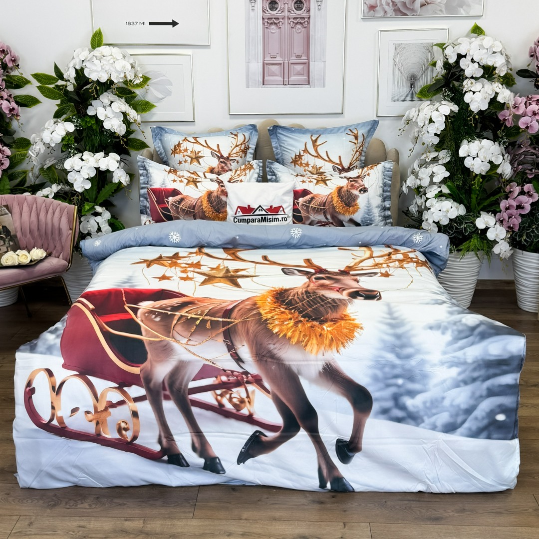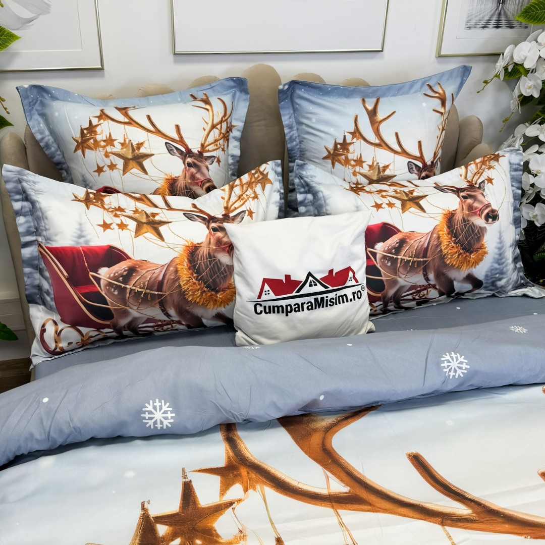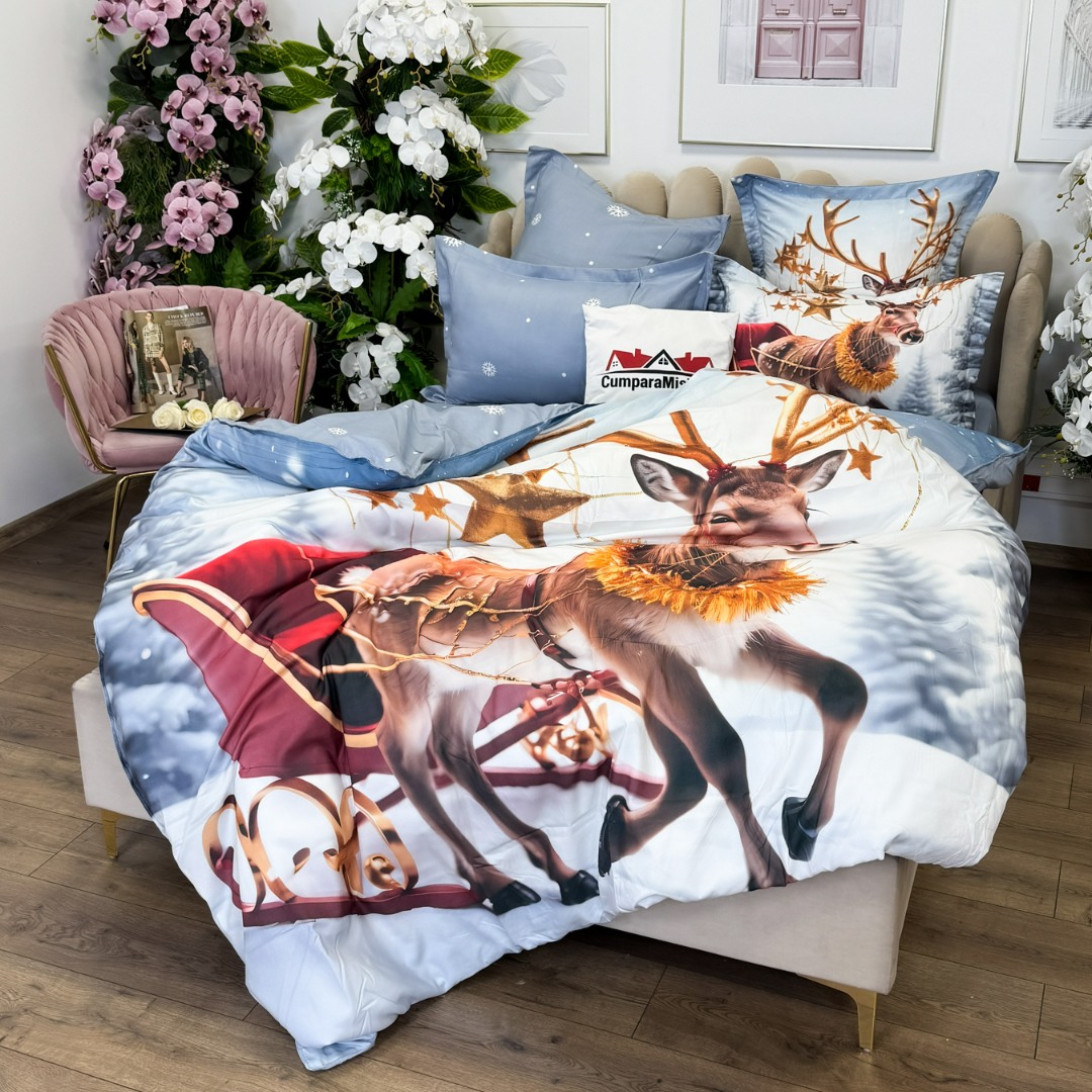 Lenjerie de pat Craciun din bumbac 100% finet - Confort si Eleganta Festiva Transforma-ti dormitorul intr-un colt de poveste de Craciun cu aceasta lenjerie de pat din bumbac 100% finet, imprimata cu motive festive exact asa cum sunt prezentate in poza de produs. Setul aduce nu doar un design spectaculos, ci si un confort maxim, datorita materialului de inalta calitate. Finetul este cunoscut pentru textura sa moale, neteda si placuta la atingere, oferind un somn odihnitor si o senzatie
