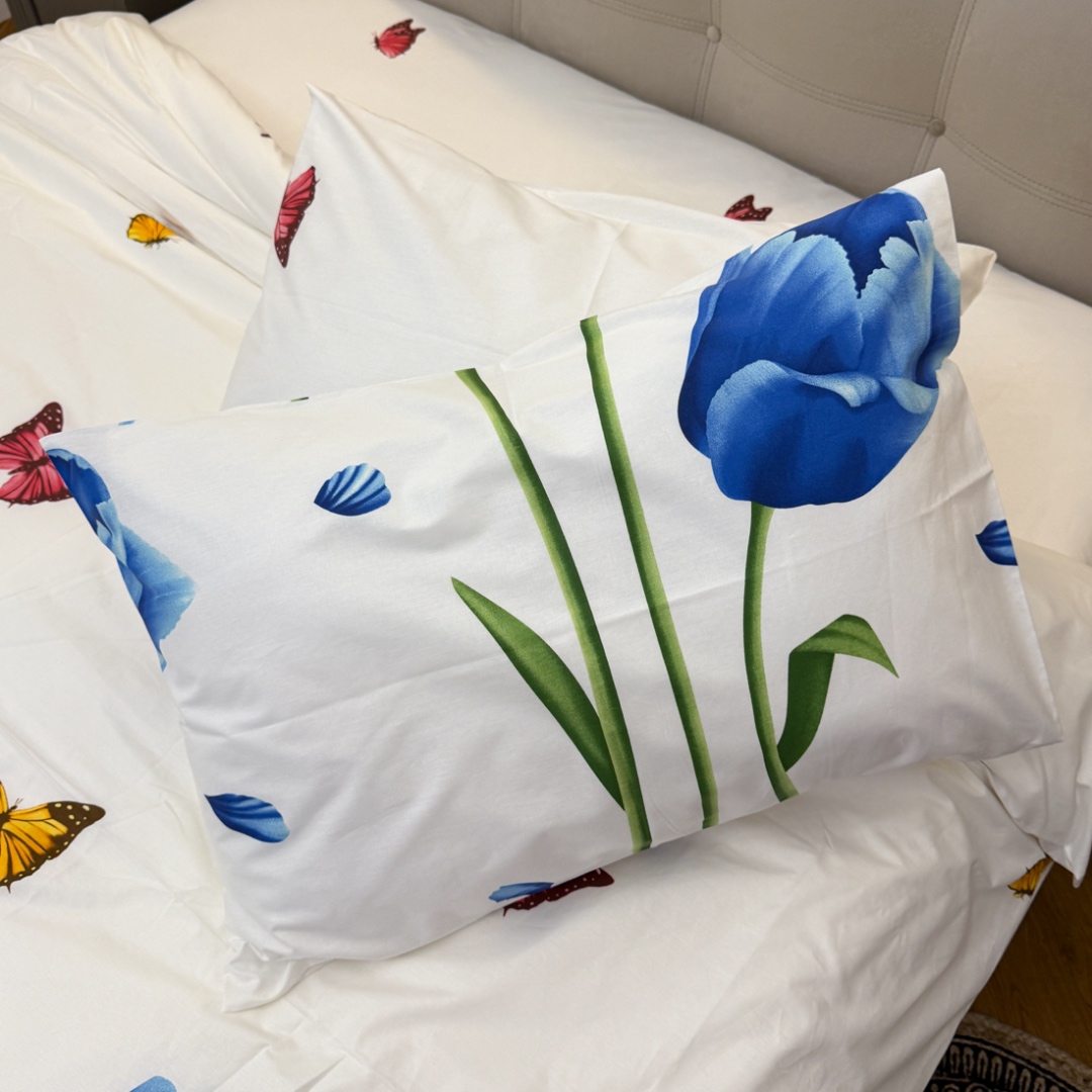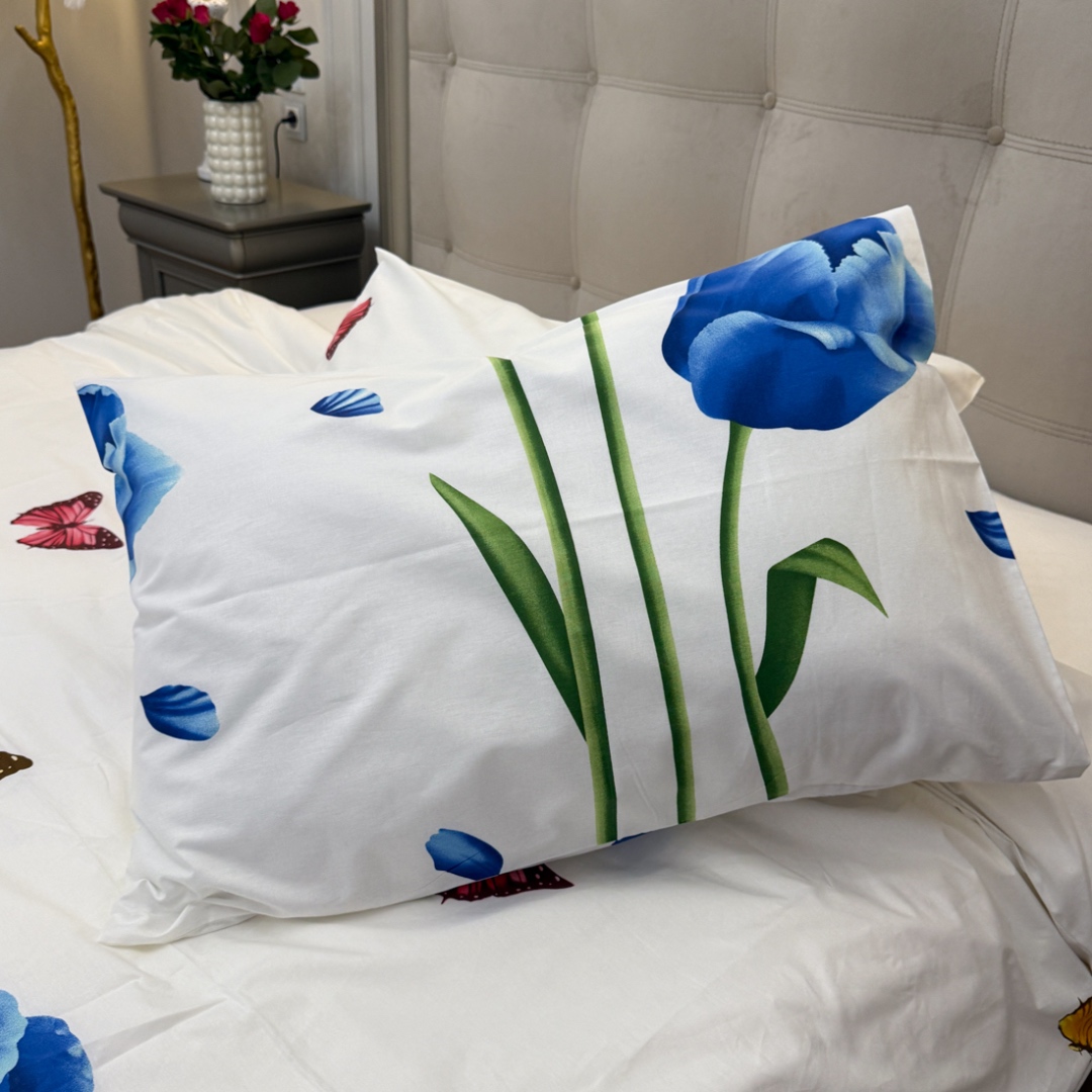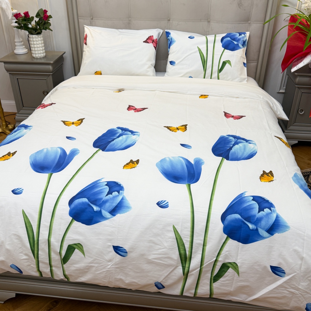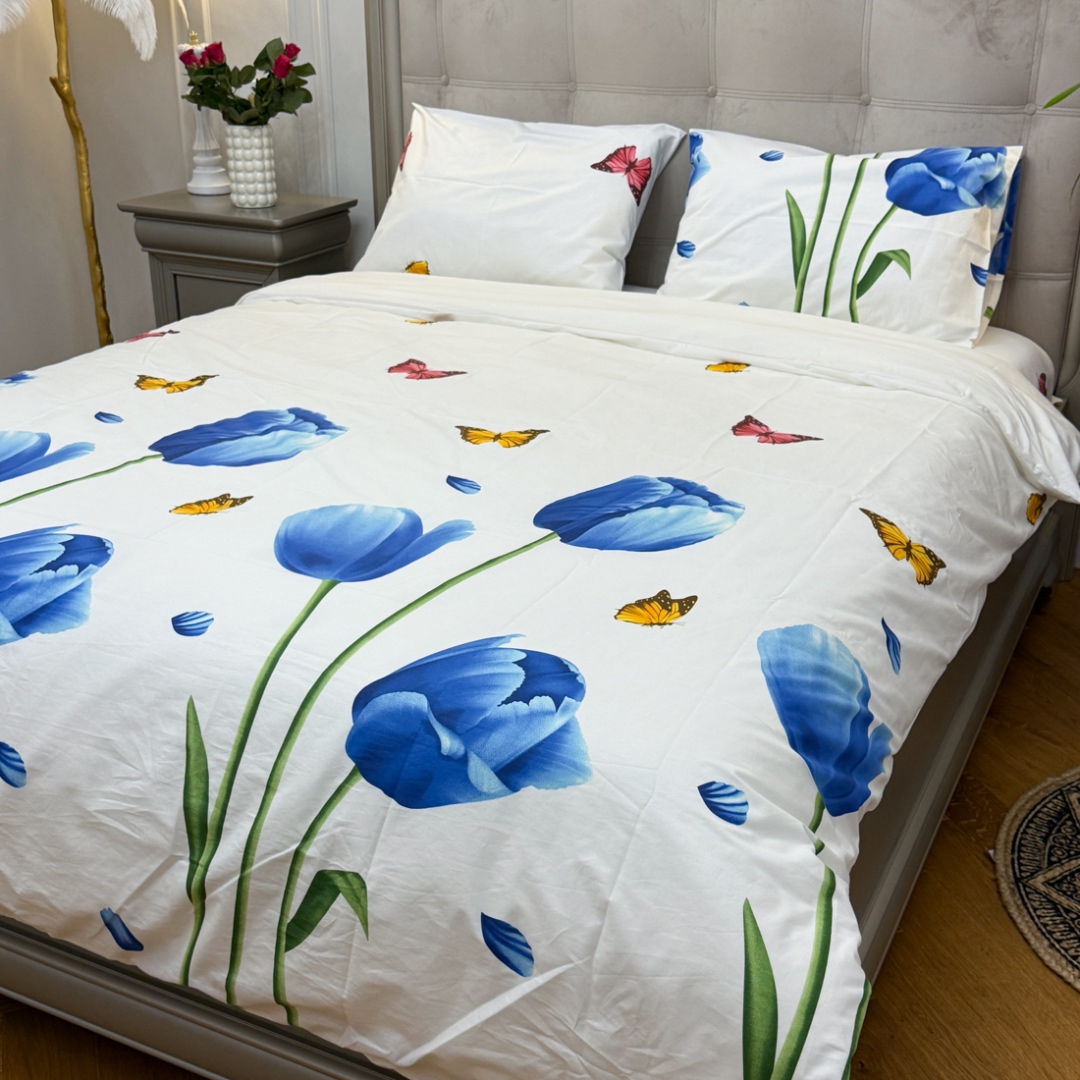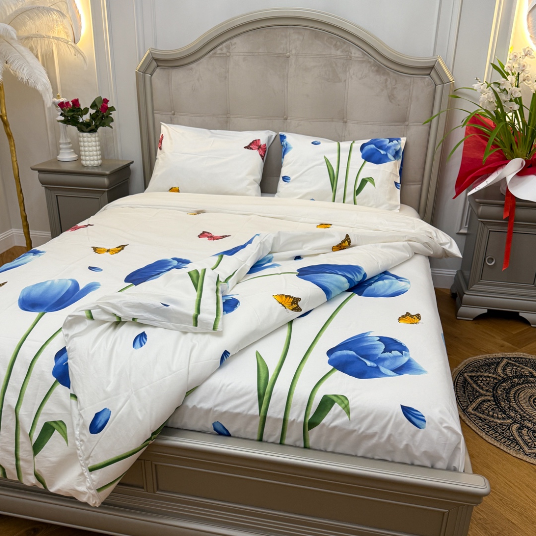 Lenjerie Pat Dublu, Bumbac Ranforce, 4 piese, Atelier Cumparamisim - Lux Suprem, Rafinament Desavarsit, Confort Regal, Alb, Albastru, Lalele