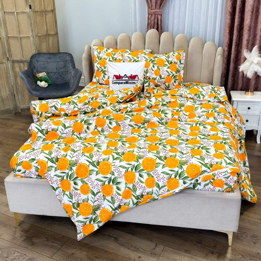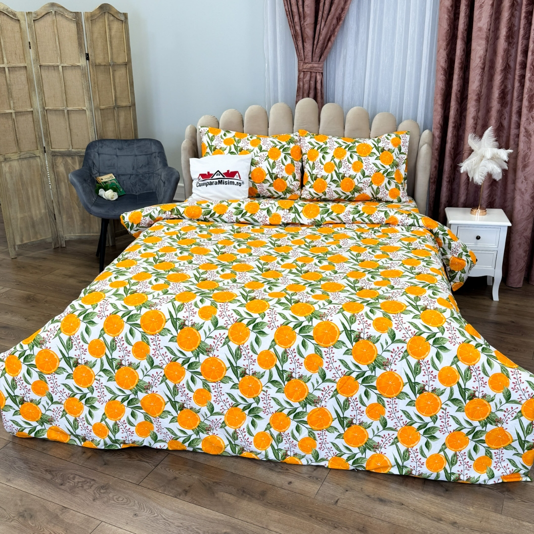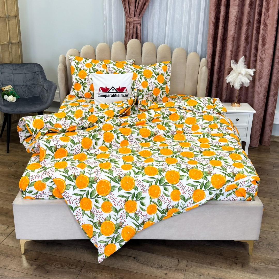Lenjerie Pat Dublu, Bumbac Ranforce, 4 piese, Atelier Cumparamisim - Lux Suprem, Rafinament Desavarsit, Confort Regal,Alb,Portocaliu, portocale