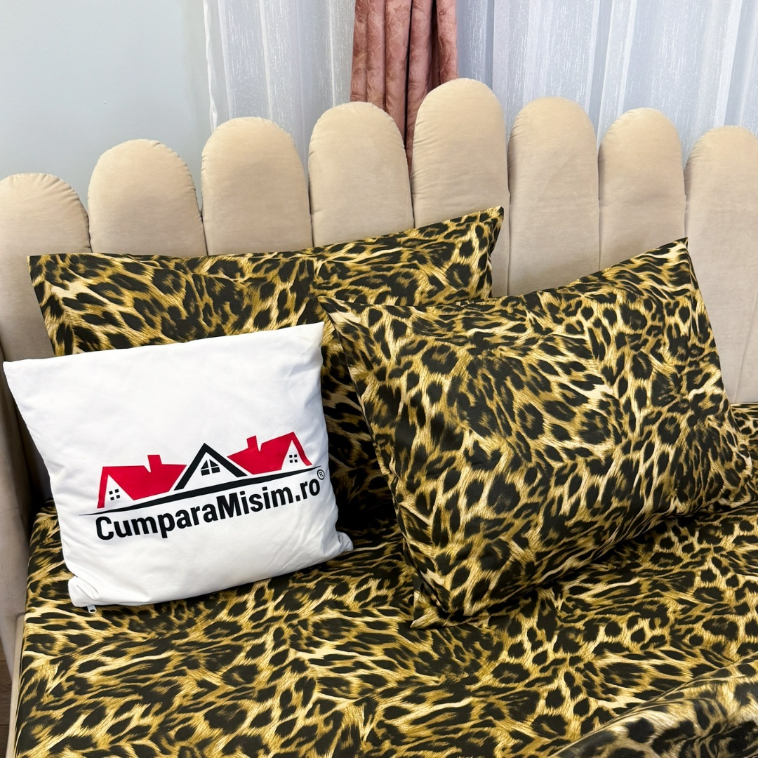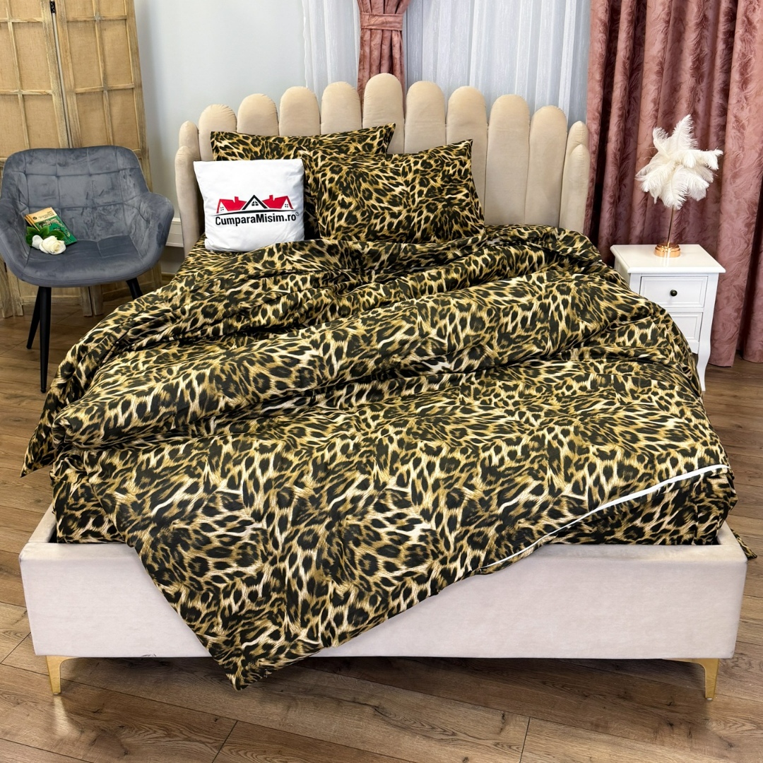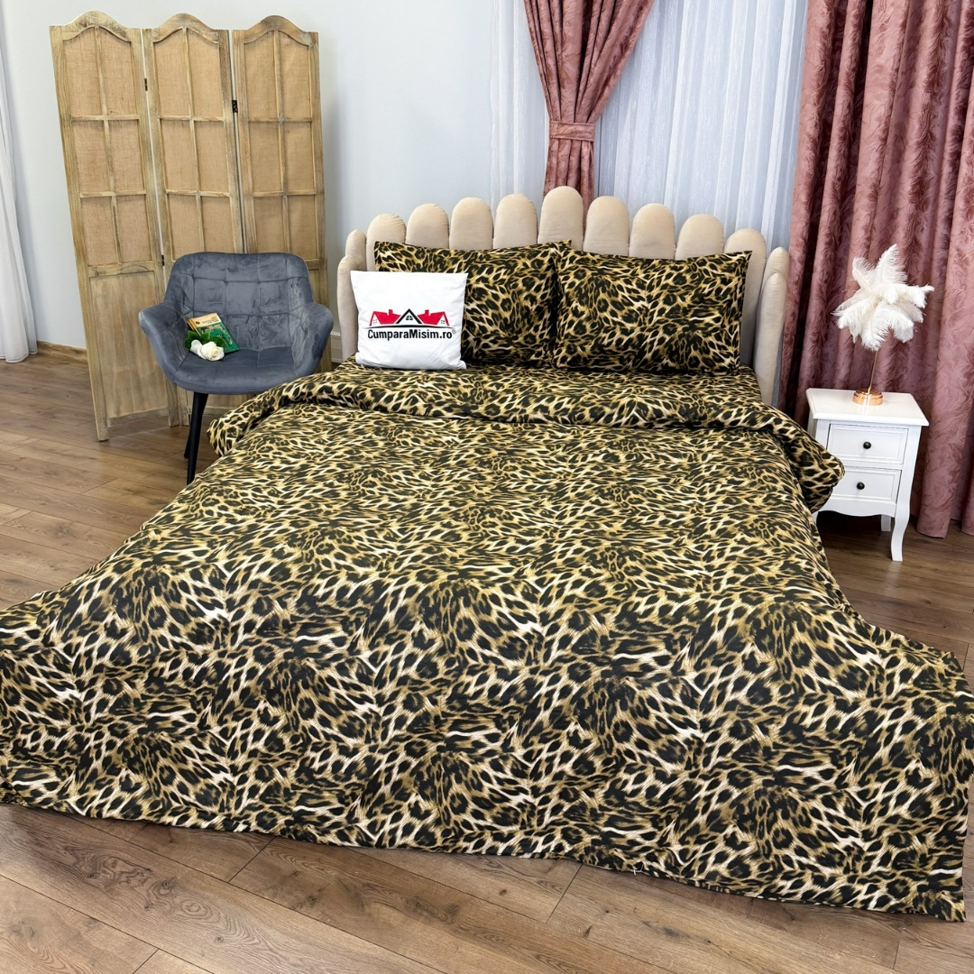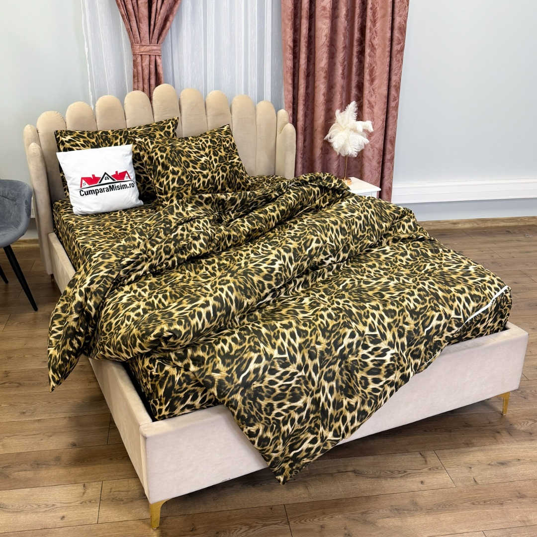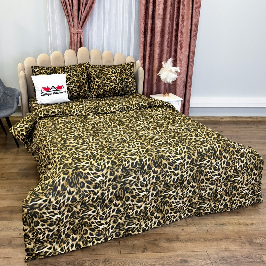 Lenjerie Pat Dublu, Bumbac Ranforce, 4 piese, Atelier Cumparamisim - Lux Suprem, Rafinament Desavarsit, Confort Regal, Maro, animal print