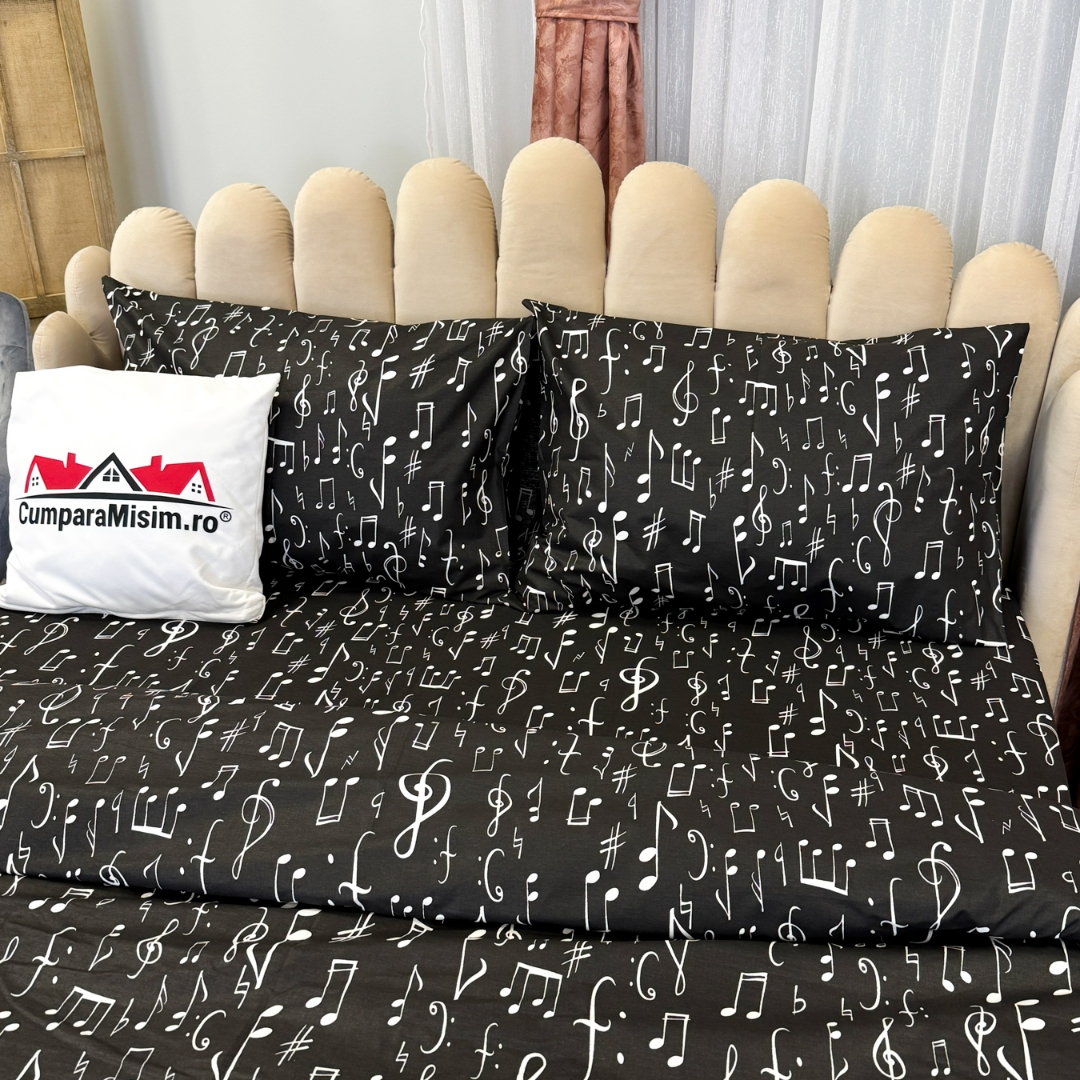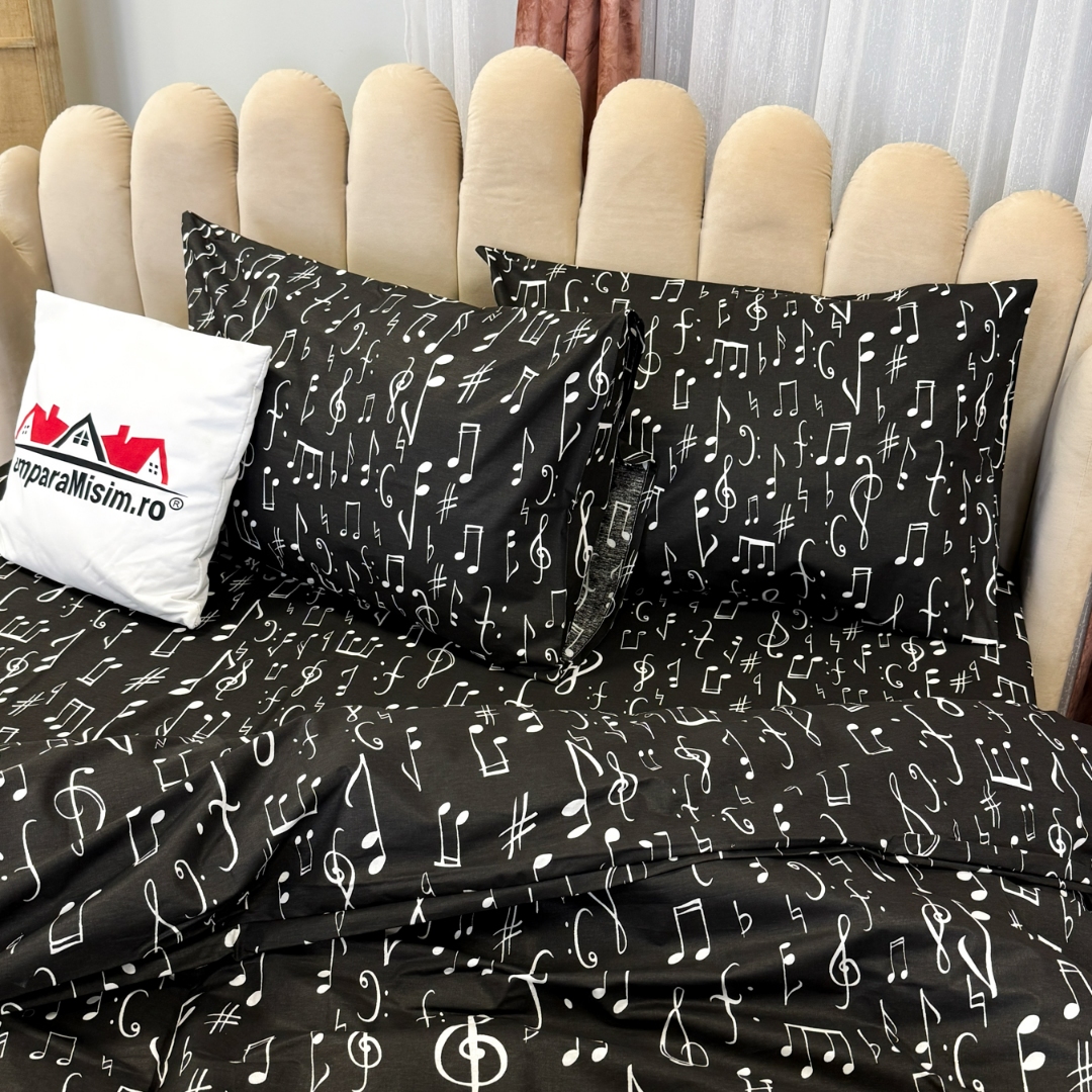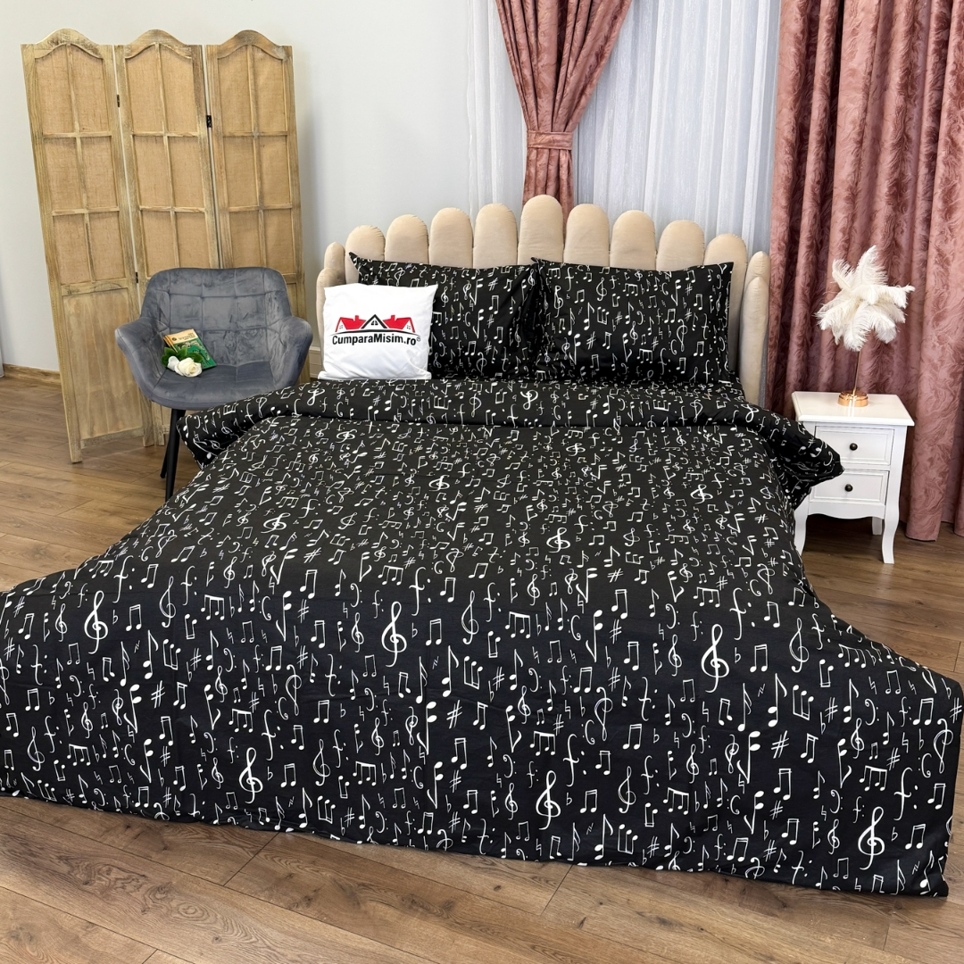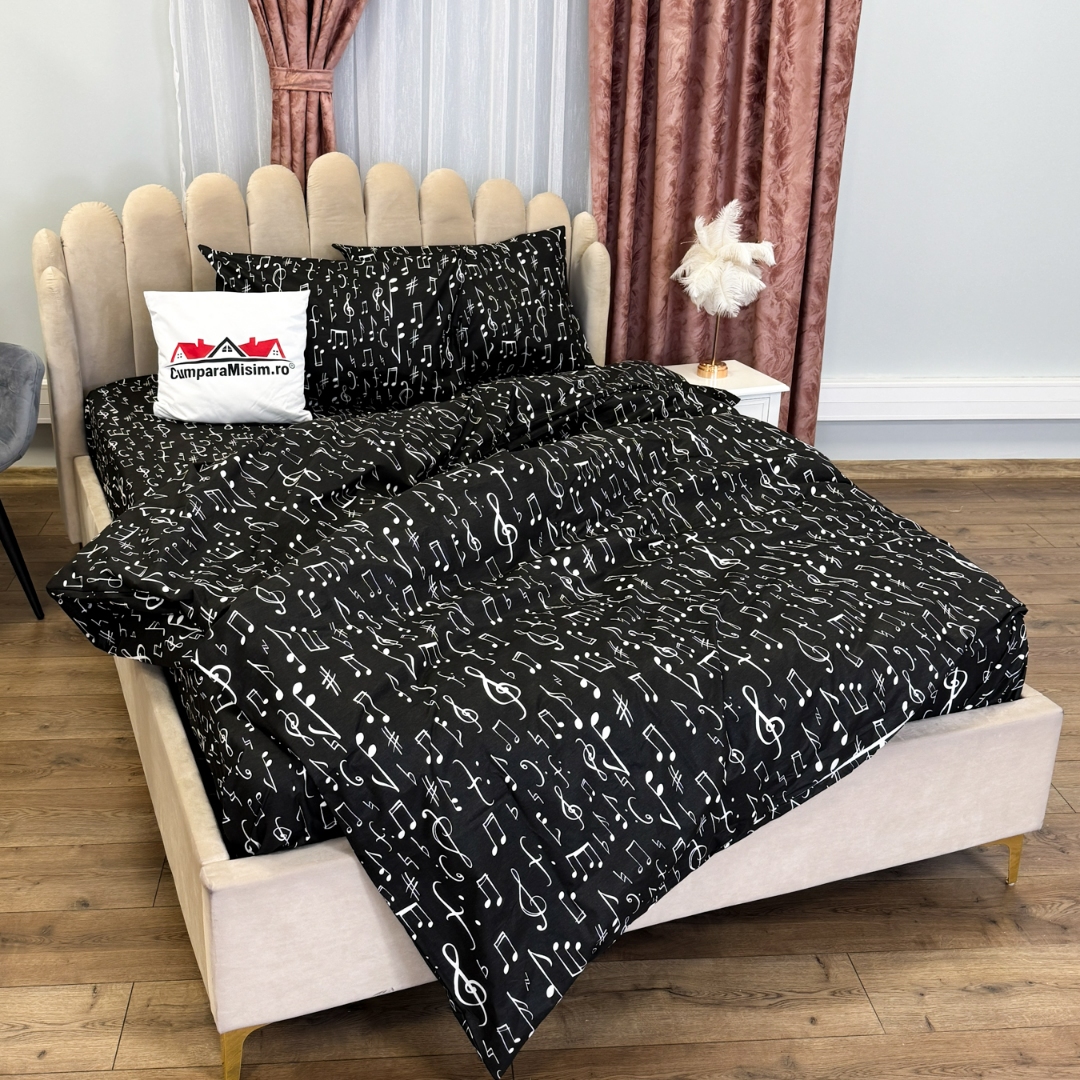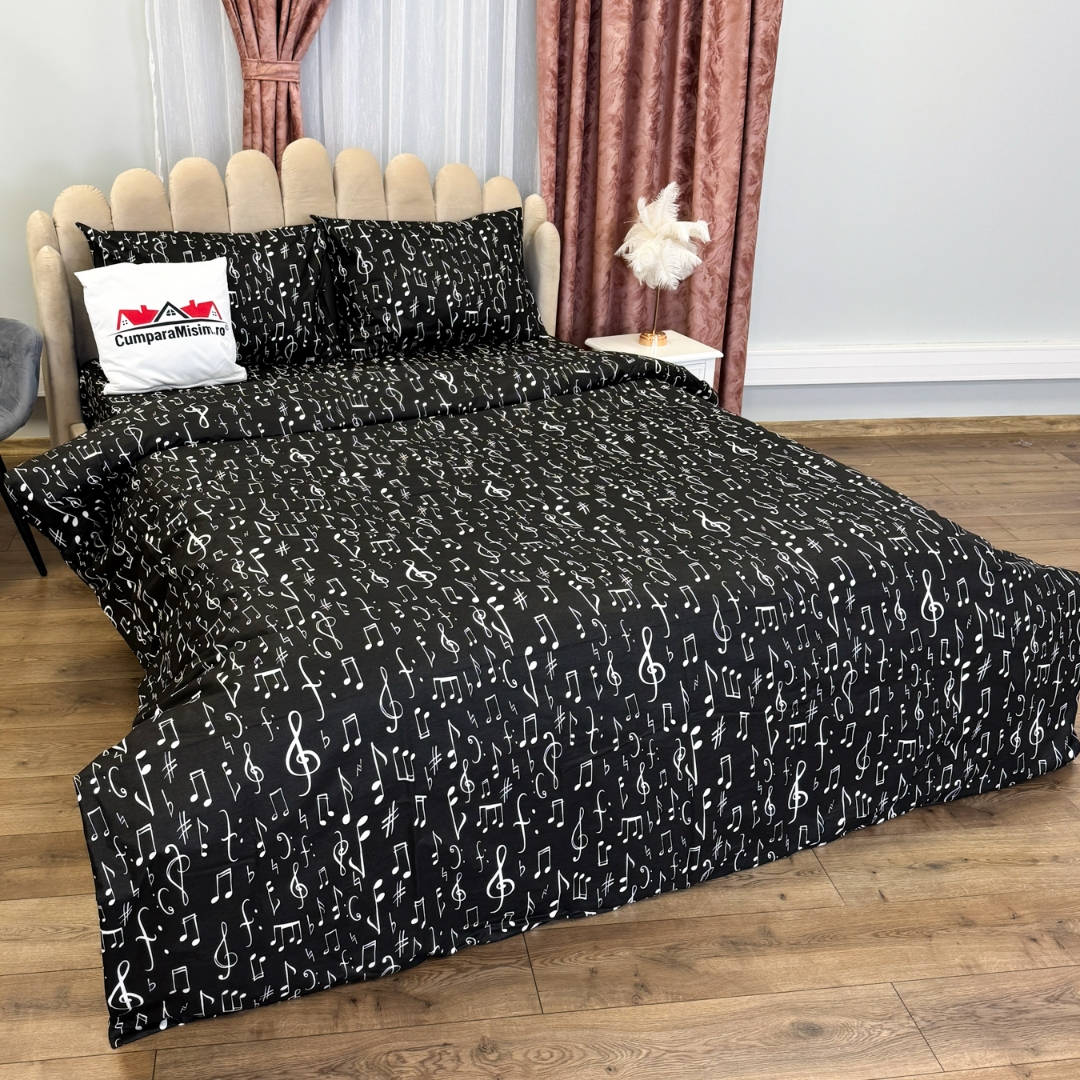 Lenjerie Pat Dublu, Bumbac Ranforce, 4 piese, Atelier Cumparamisim - Lux Suprem, Rafinament Desavarsit, Confort Regal, Negru, note muzicale