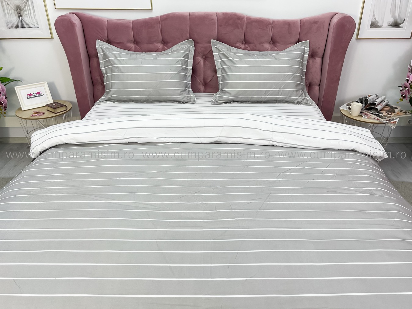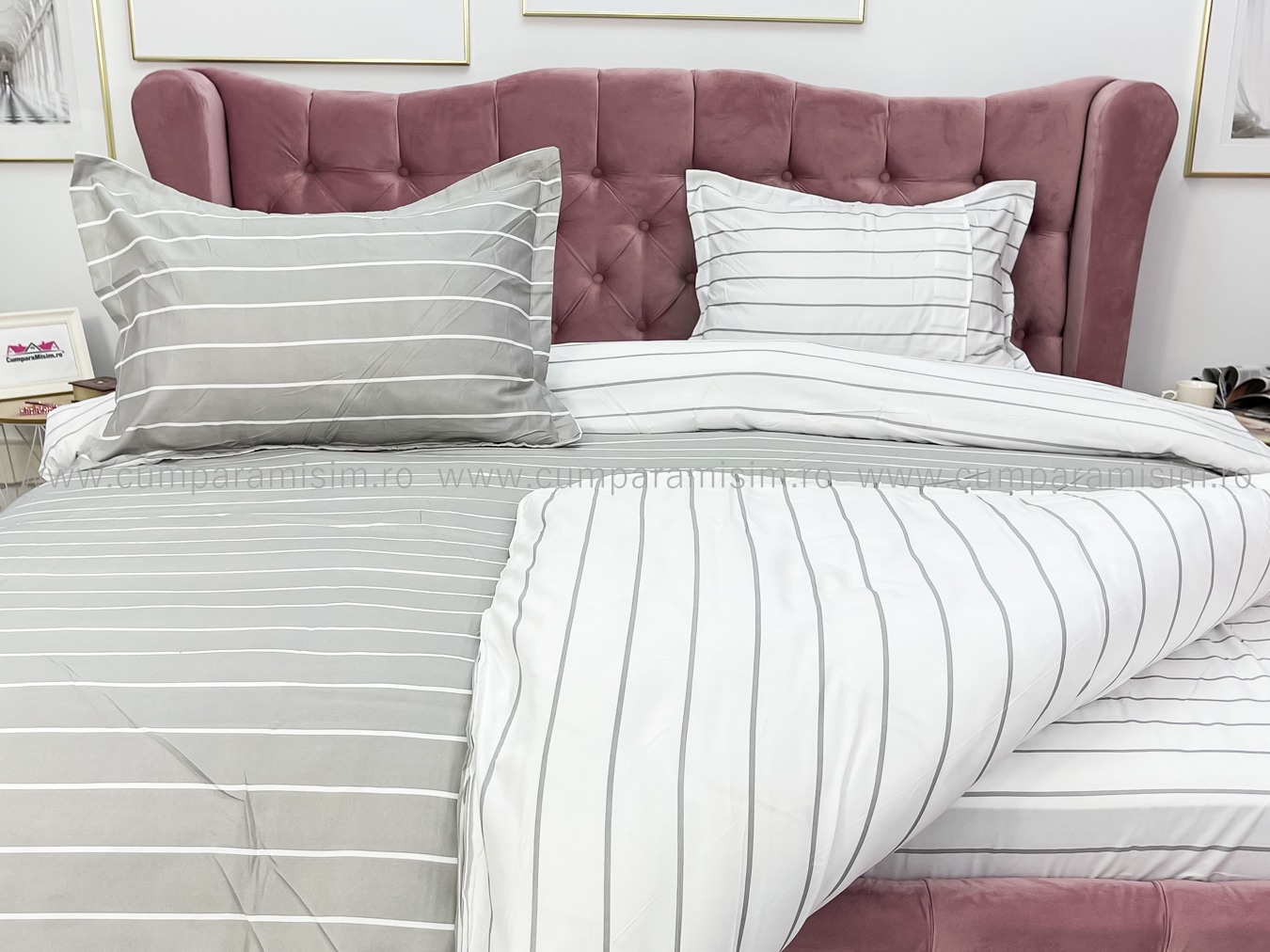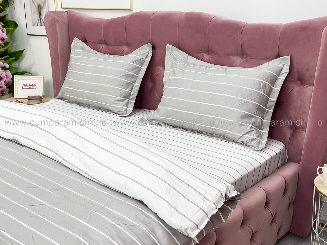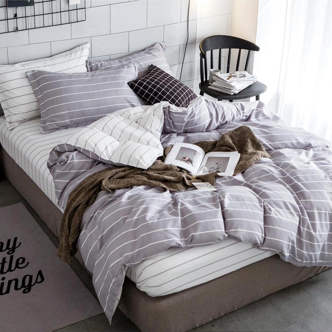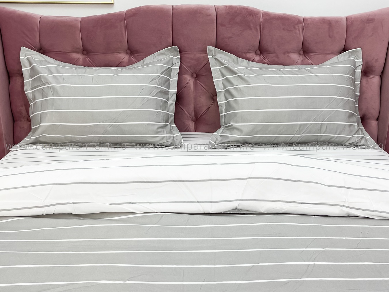(OFERTA 3 la 219 Lei) Lenjerie pat dublu cu Elastic (160x200cm si 180x200cm), bumbac satinat, Gri, dungi