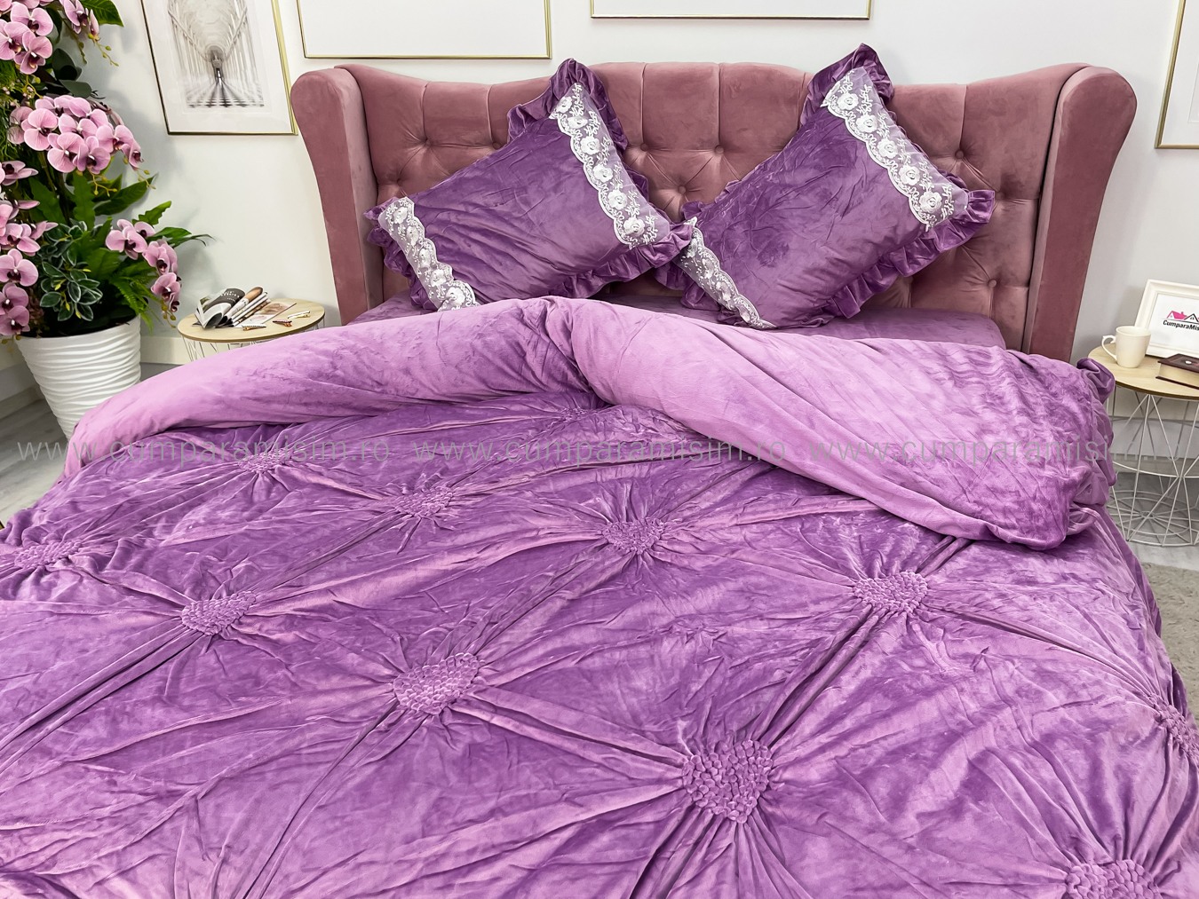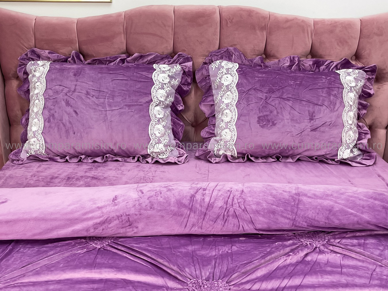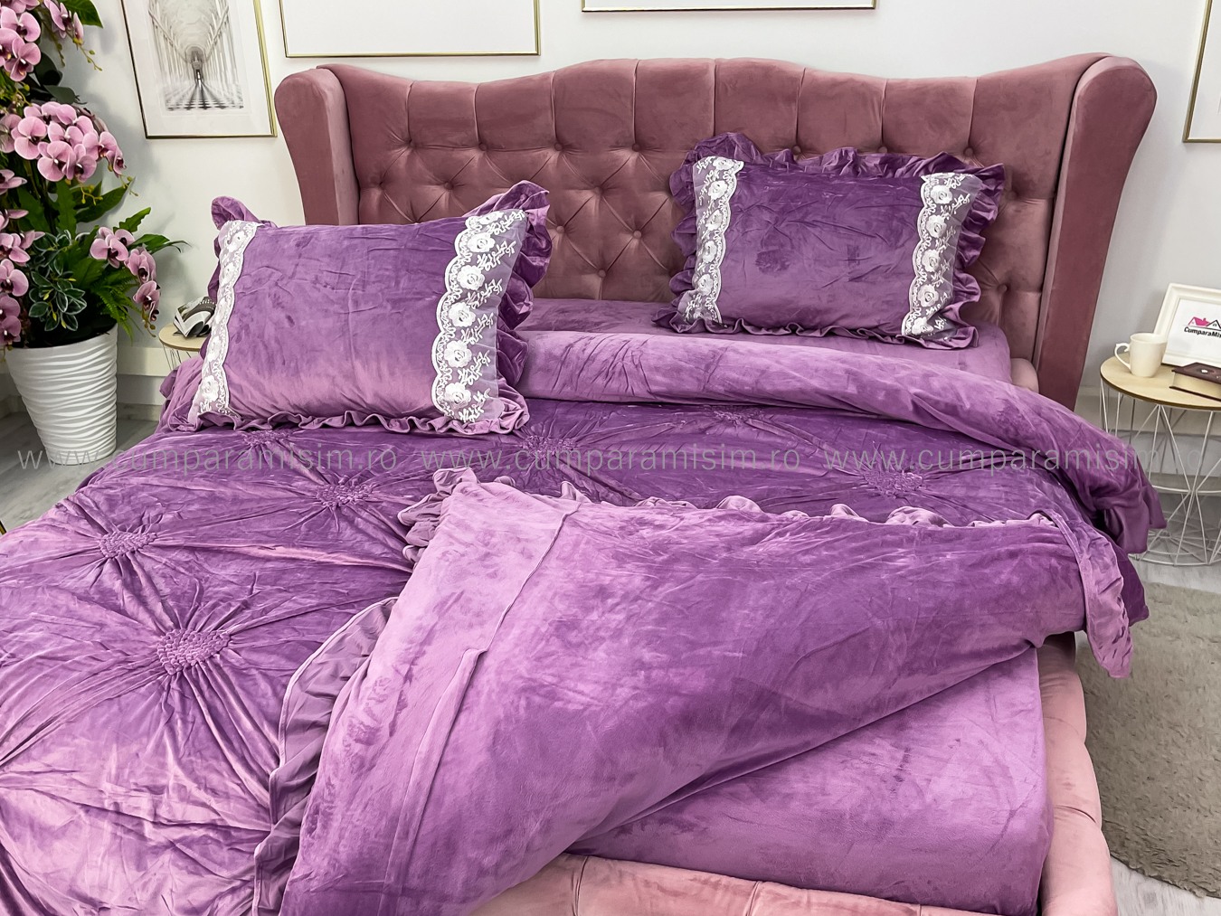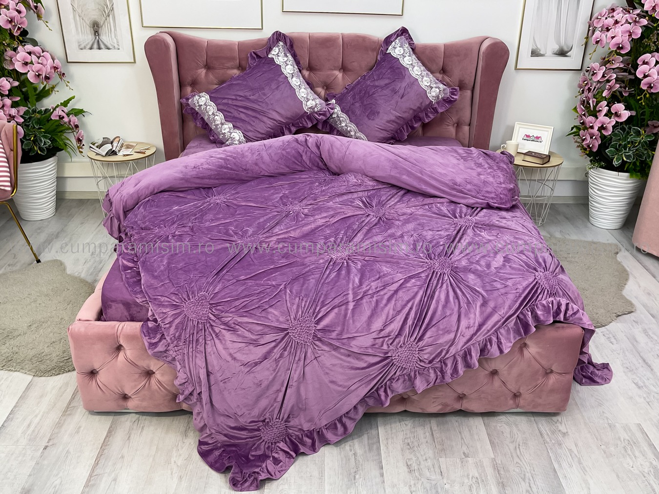 Lenjerie pat dublu, Catifea Deluxe, cu pliuri brodate, 4 piese, Jojo Home, Lila Very Perry