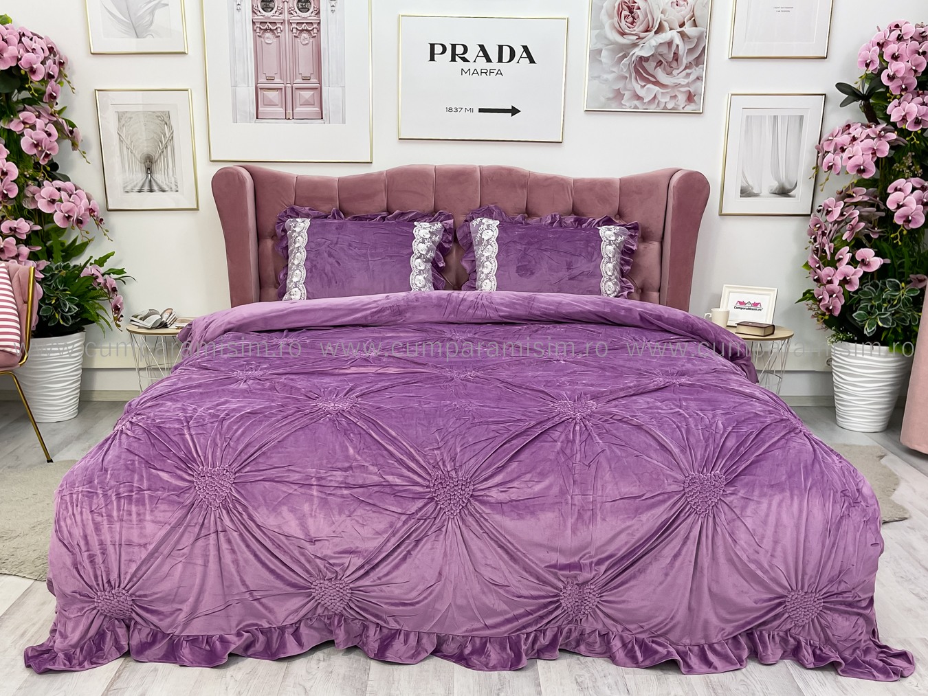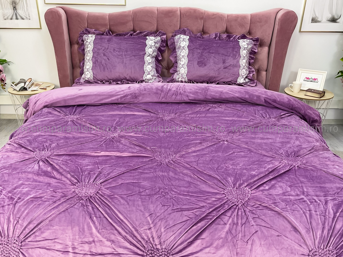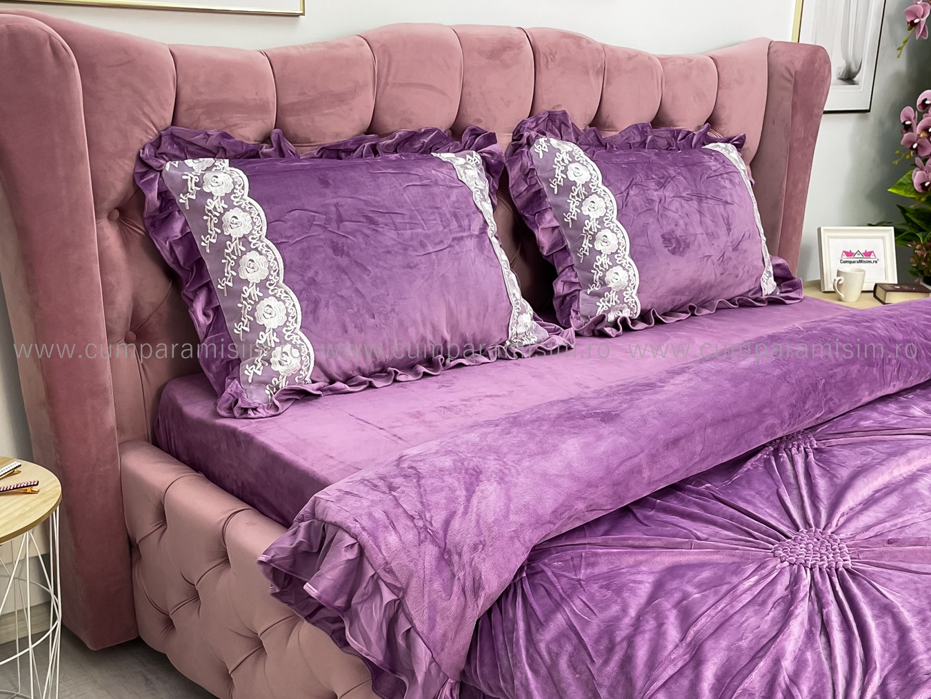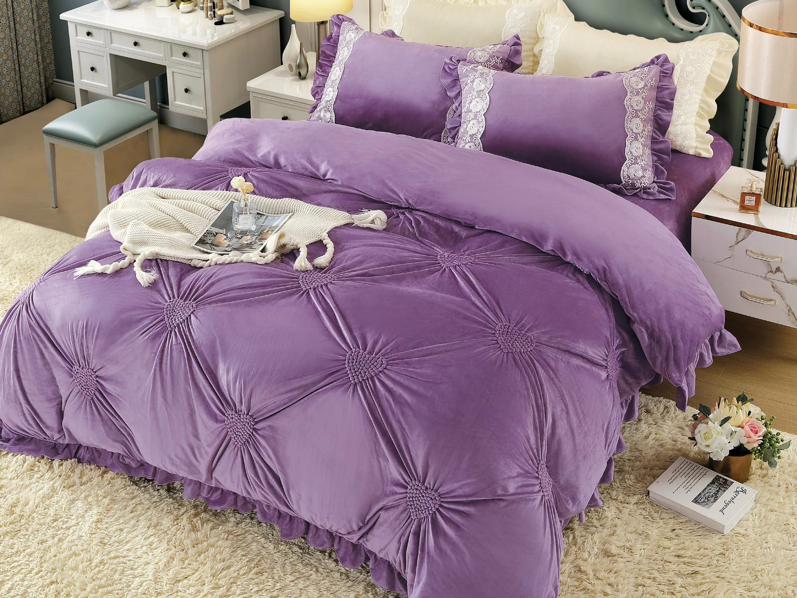 Lenjerie pat dublu, Catifea Deluxe, cu pliuri brodate, 4 piese, Jojo Home, Lila Very Perry