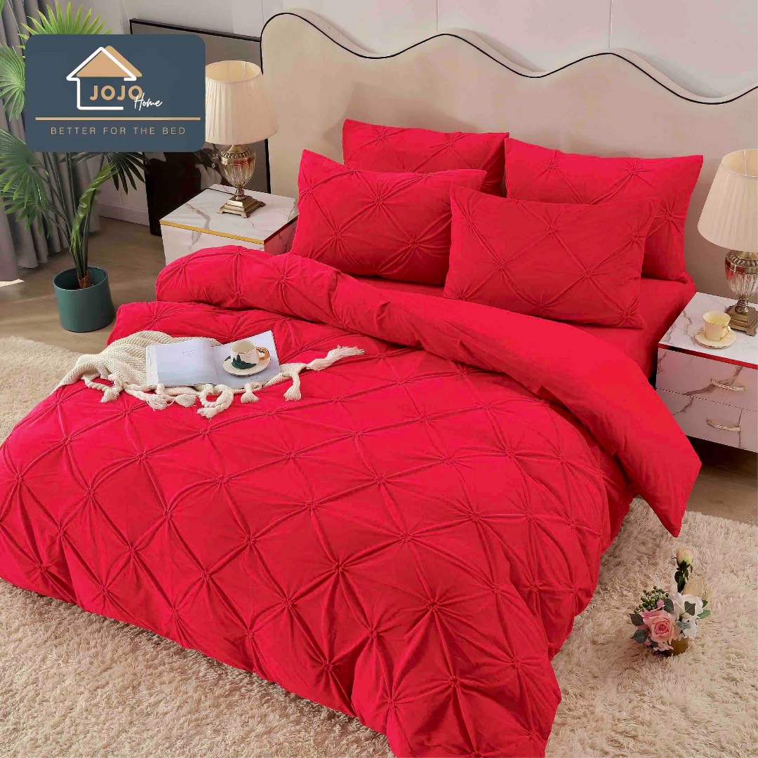 Lenjerie pat dublu, Catifea Deluxe, cu pliuri brodate, 4 piese, Jojo Home, Rosu