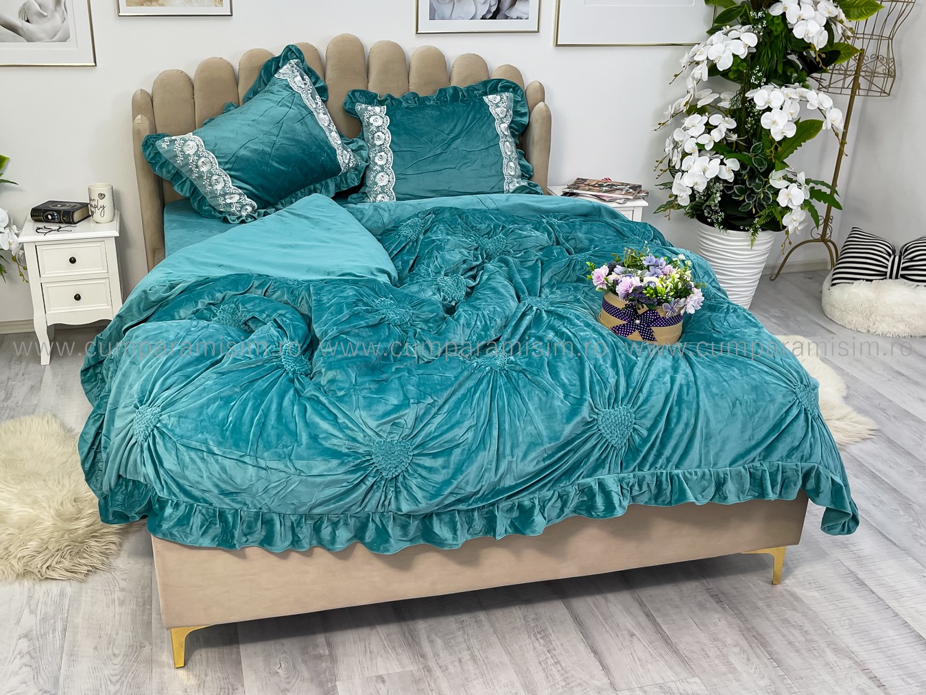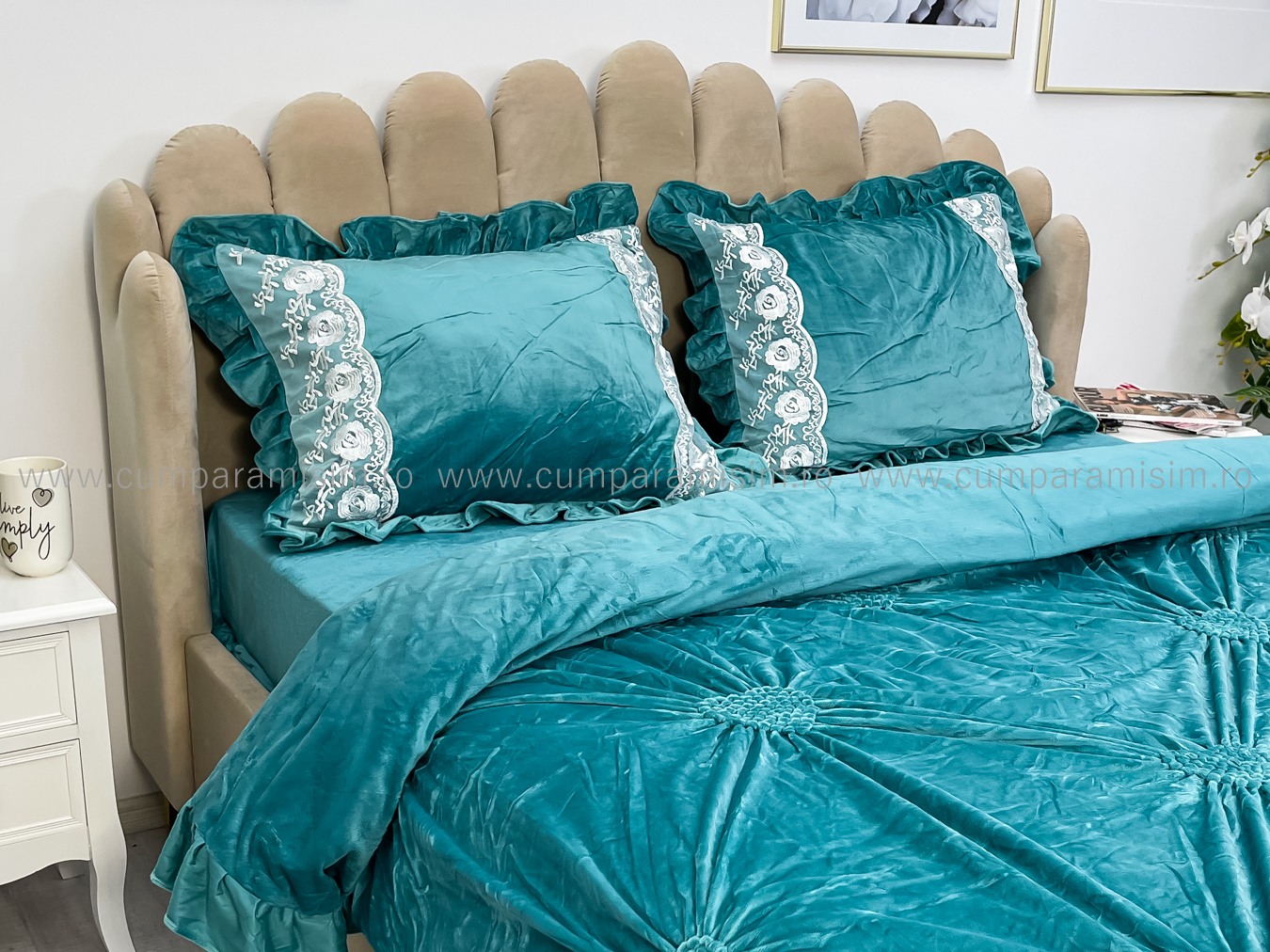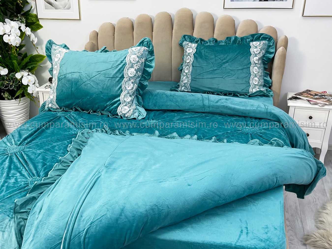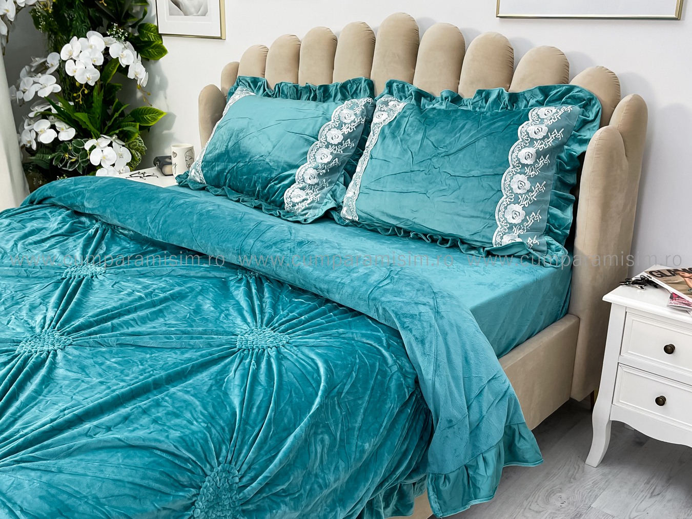 Lenjerie pat dublu, Catifea Deluxe, cu pliuri brodate, 4 piese, Jojo Home, Turquoise