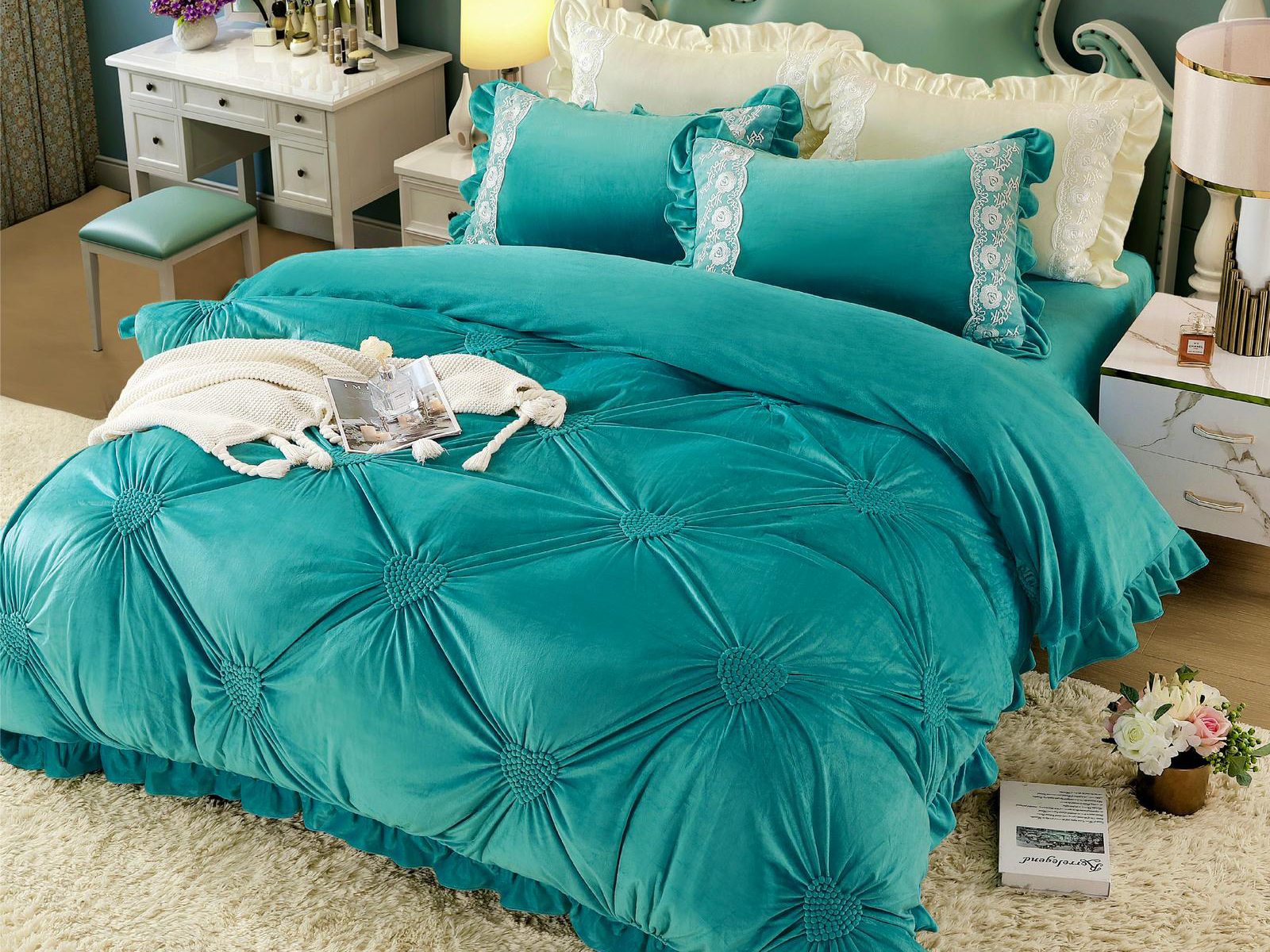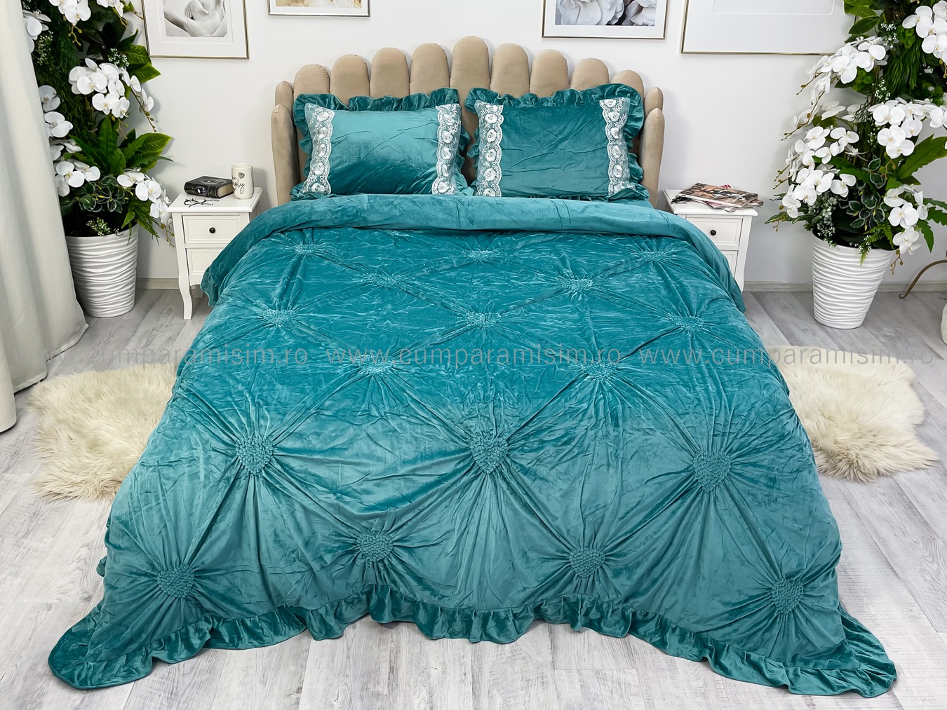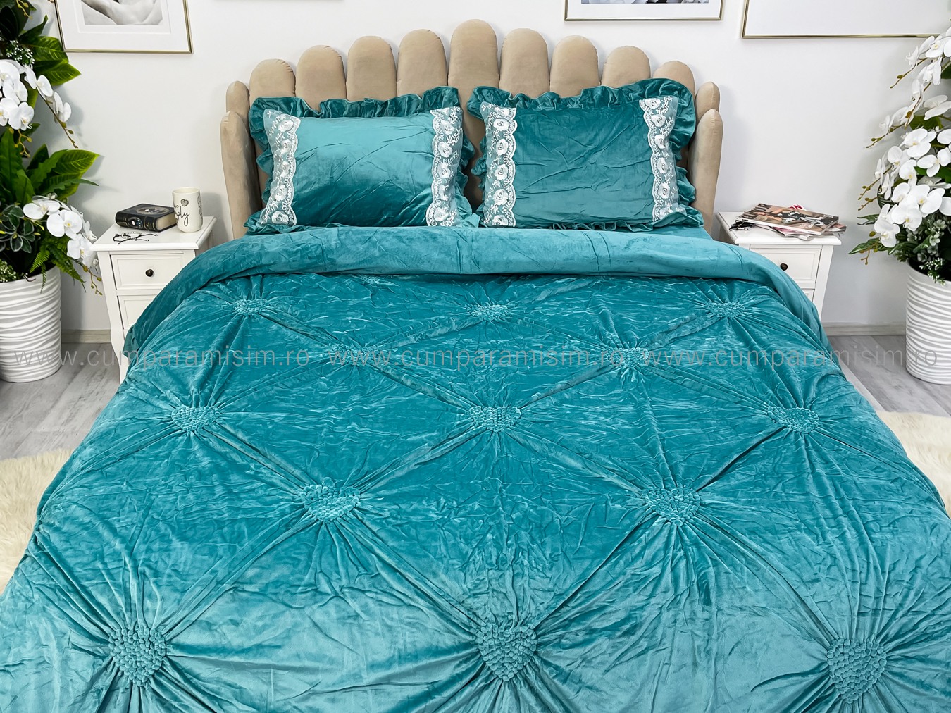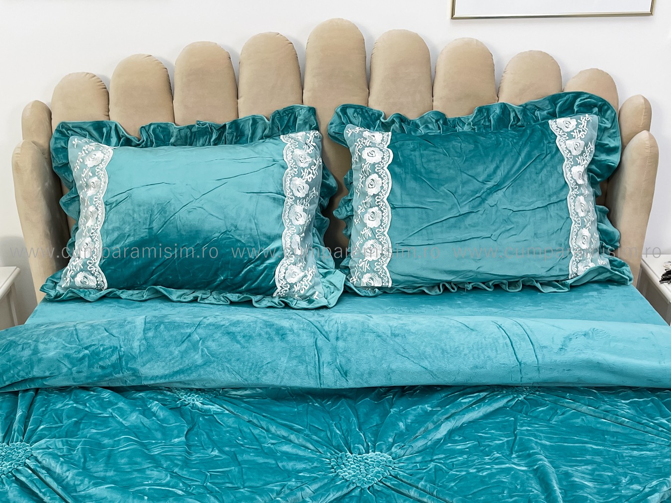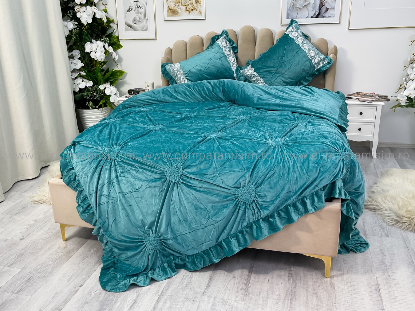 Lenjerie pat dublu, Catifea Deluxe, cu pliuri brodate, 4 piese, Jojo Home, Turquoise