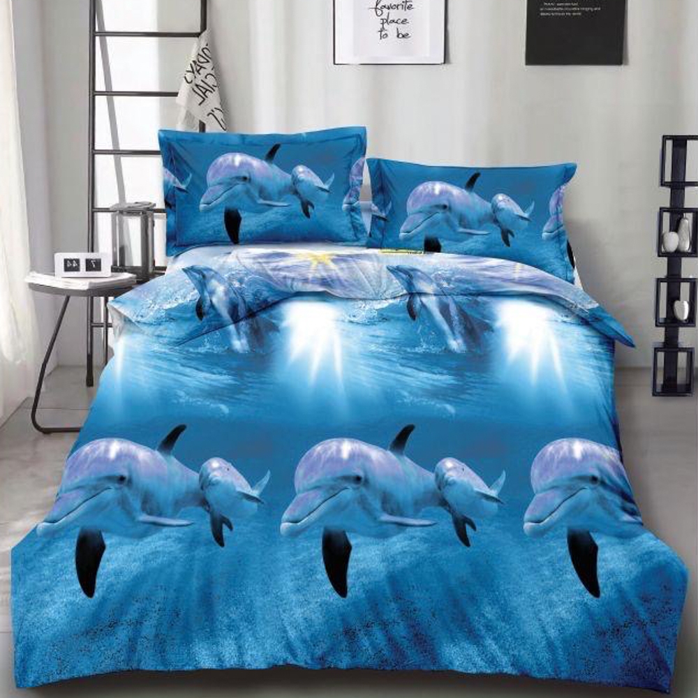 Lenjerie pat dublu cu ELASTIC (160x200cm, 180x200cm), microfibra, imprimeu 3D, Albastru, delfini